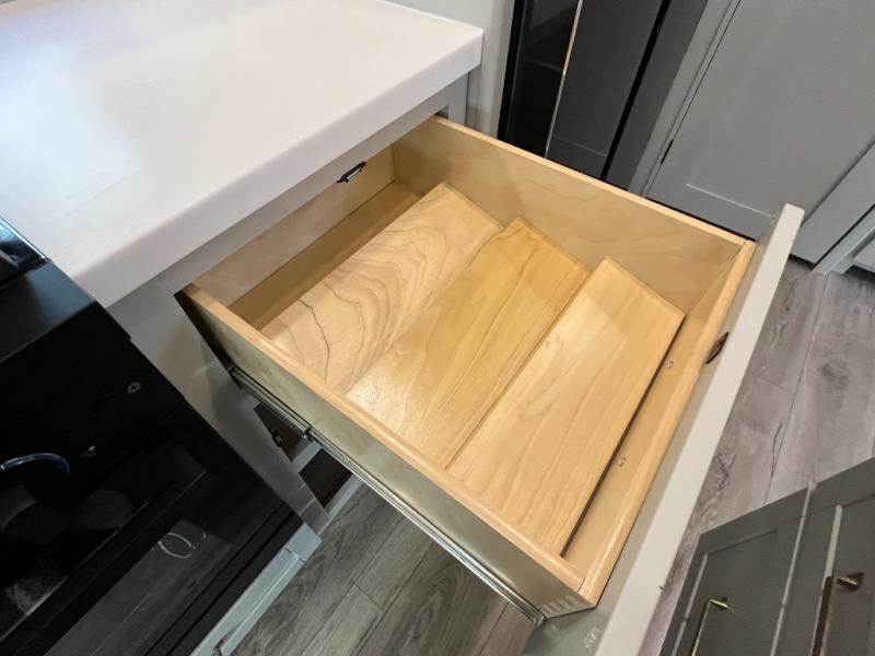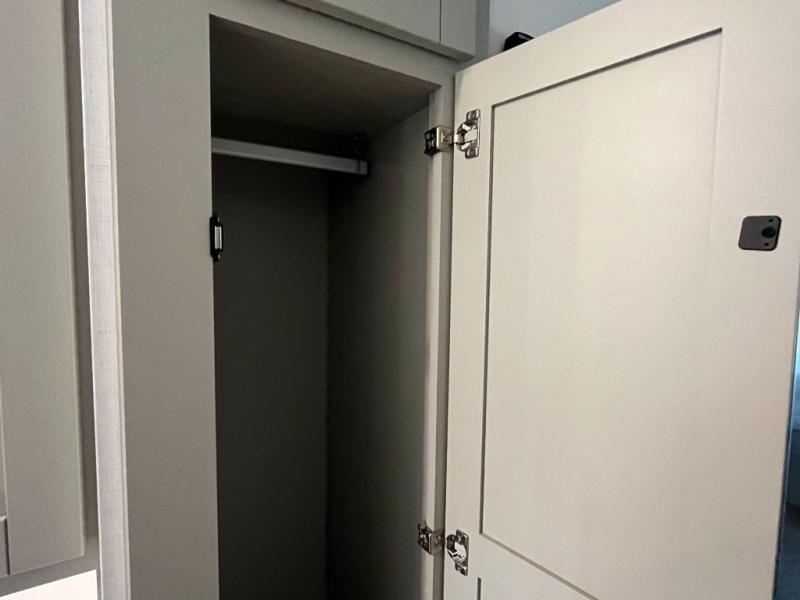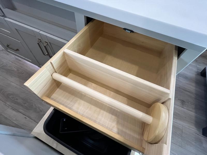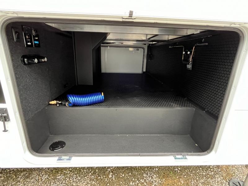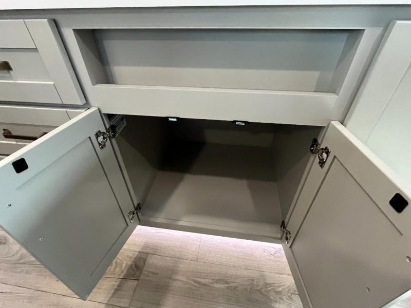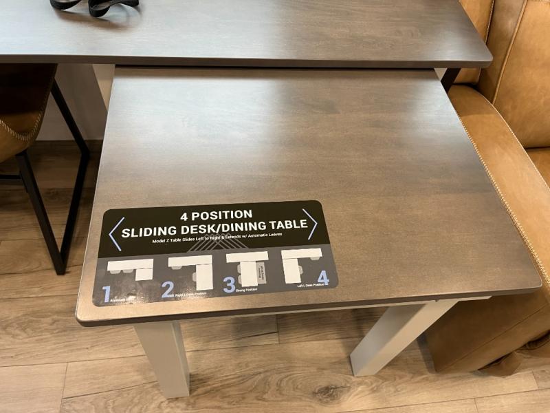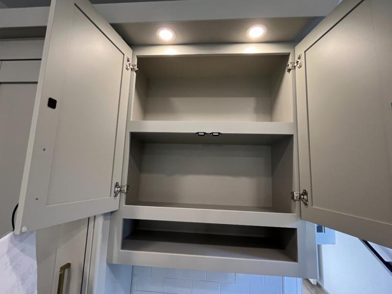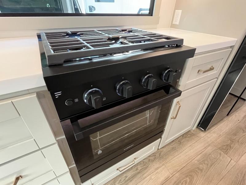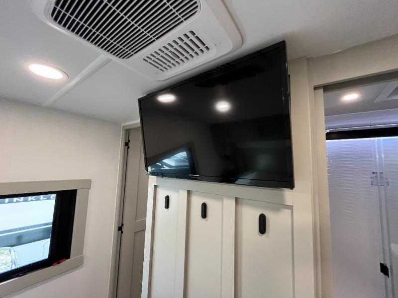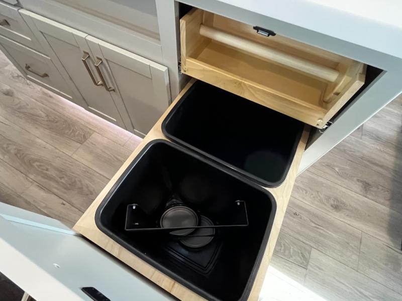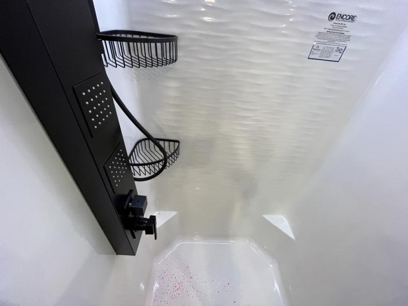 You're going to love every minute spent in this spacious fifth wheel that can sleep four. There is an inviting rear living area with a 72" tri-fold sofa and theater seating across from the televator and fireplace. The chef of your group can whip up dinner on the three burner cooktop or in the 30" residential microwave, and there is a 16 cu. ft. refrigerator that even opens when with the slide out is in. You will also enjoy the kitchen island with a farmhouse sink and roller cover, dual trash bins with a Stow N' Go paper towel holder, plus convenient dog bowls for your furry friends. You can store all your paper goods and snacks in the 84" pantry with adjustable shelving, and there is a hutch for nice dishes plus shoe storage in this model as well. Head to the front master bedroom where you'll find a queen bed with a TV, a large slide out with a wardrobe with drawers, plus a spacious bath.