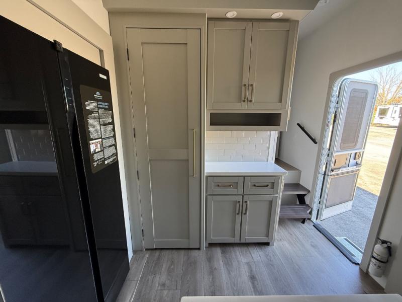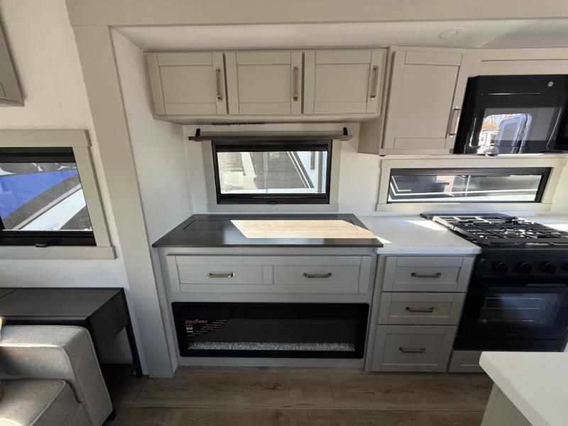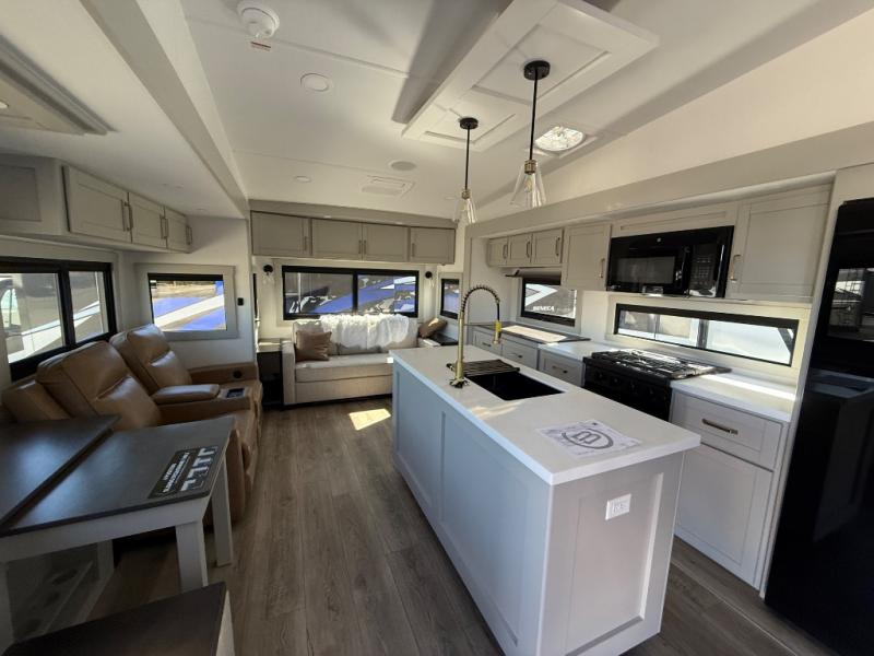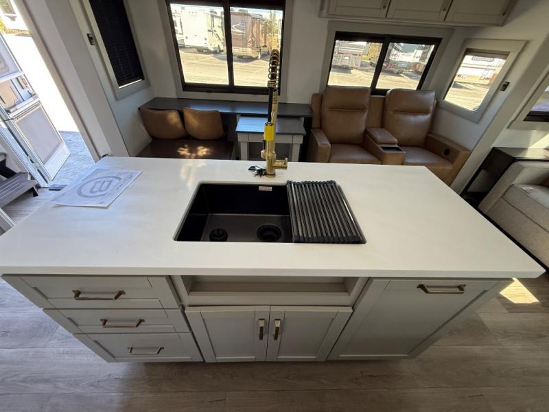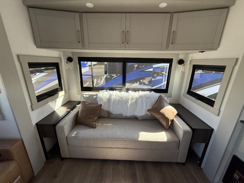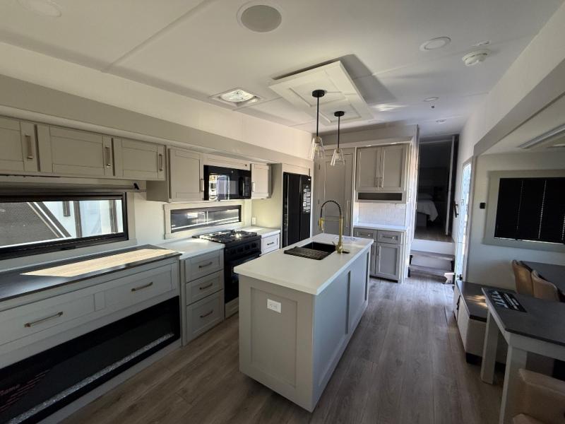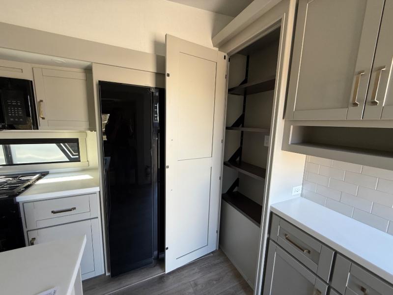 You're going to love every minute spent in this spacious fifth wheel that can sleep four. There is an inviting rear living area with a 72" tri-fold sofa and theater seating across from the televator and fireplace. The chef of your group can whip up dinner on the three burner cooktop or in the 30" residential microwave, and there is a 16 cu. ft. refrigerator that even opens when with the slide out is in. You will also enjoy the kitchen island with a farmhouse sink and roller cover, dual trash bins with a Stow N' Go paper towel holder, plus convenient dog bowls for your furry friends. You can store all your paper goods and snacks in the 84" pantry with adjustable shelving, and there is a hutch for nice dishes plus shoe storage in this model as well. Head to the front master bedroom where you'll find a queen bed with a TV, a large slide out with a wardrobe with drawers, plus a spacious bath.