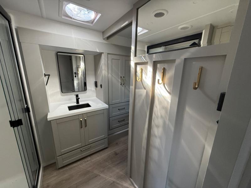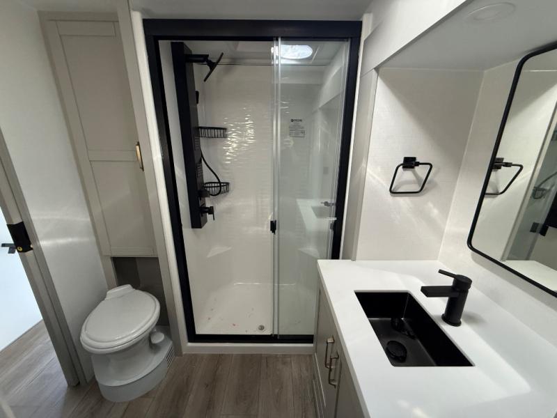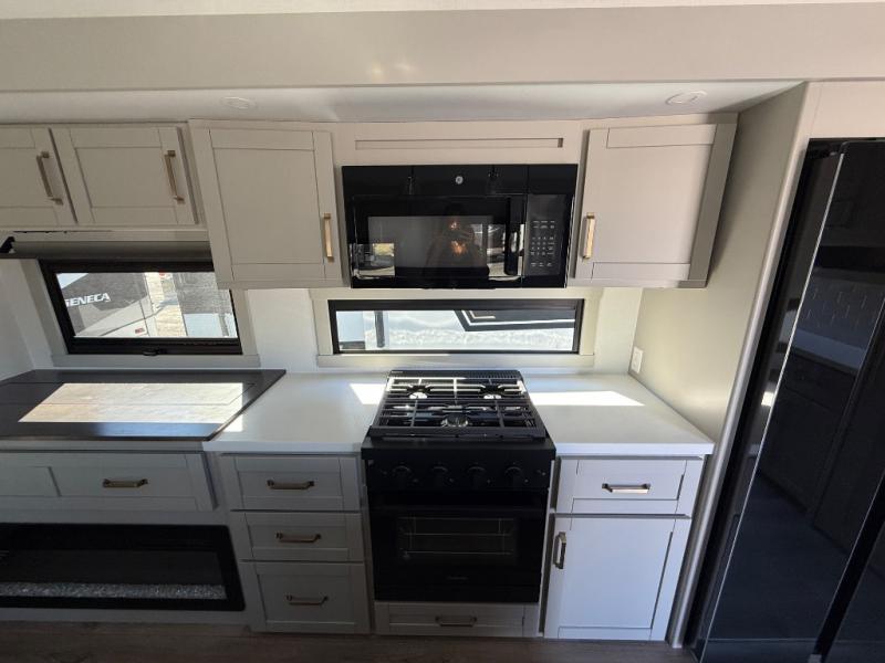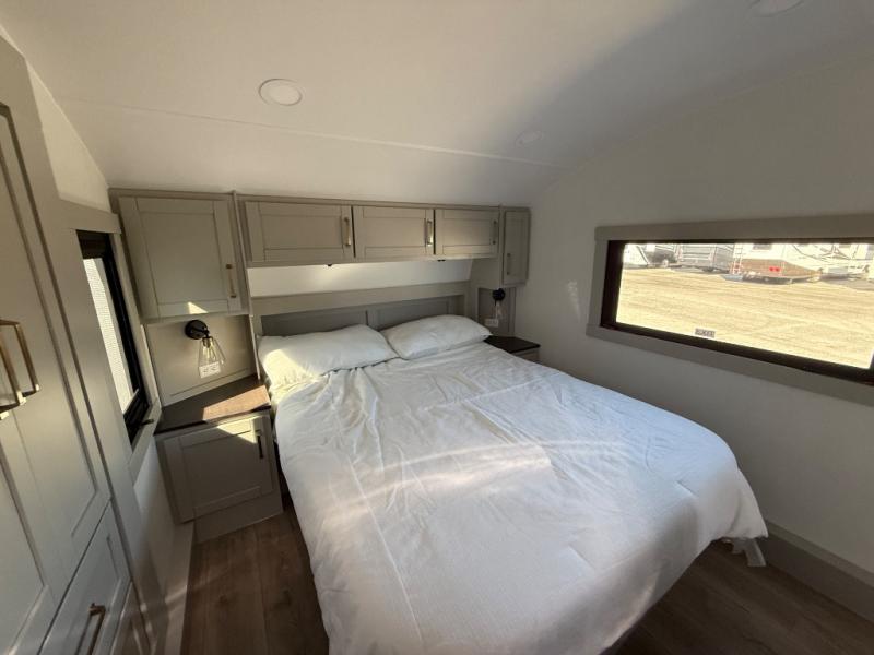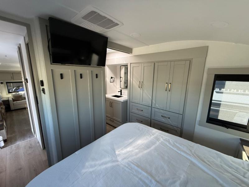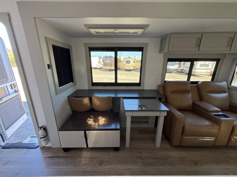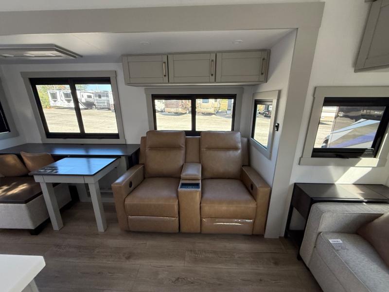 You're going to love every minute spent in this spacious fifth wheel that can sleep four. There is an inviting rear living area with a 72" tri-fold sofa and theater seating across from the televator and fireplace. The chef of your group can whip up dinner on the three burner cooktop or in the 30" residential microwave, and there is a 16 cu. ft. refrigerator that even opens when with the slide out is in. You will also enjoy the kitchen island with a farmhouse sink and roller cover, dual trash bins with a Stow N' Go paper towel holder, plus convenient dog bowls for your furry friends. You can store all your paper goods and snacks in the 84" pantry with adjustable shelving, and there is a hutch for nice dishes plus shoe storage in this model as well. Head to the front master bedroom where you'll find a queen bed with a TV, a large slide out with a wardrobe with drawers, plus a spacious bath.