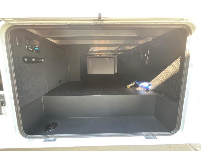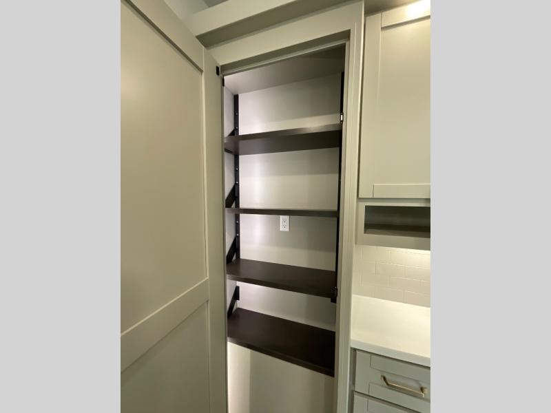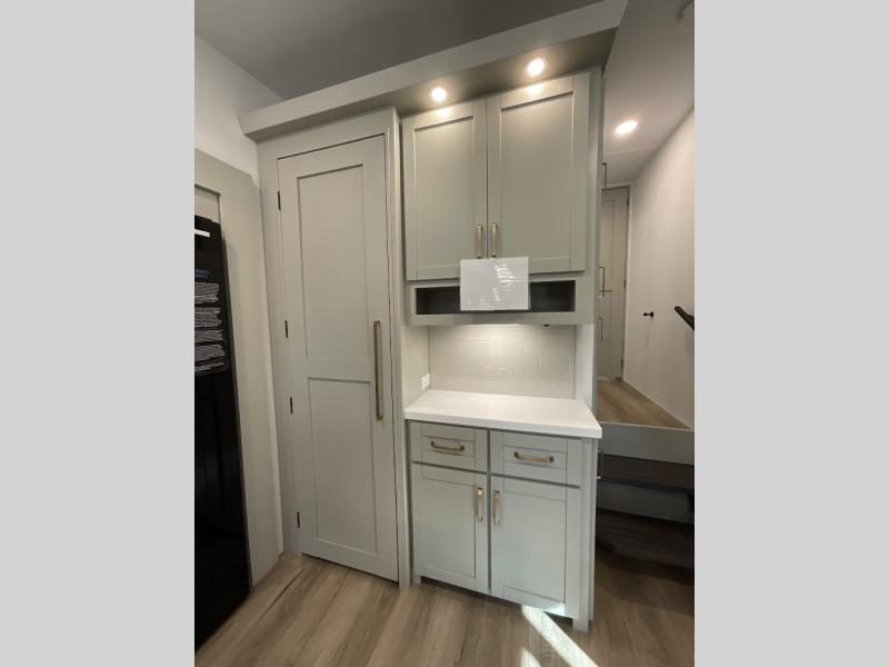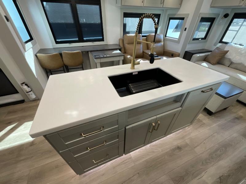 You're going to love every minute spent in this spacious fifth wheel that can sleep four. There is an inviting rear living area with a 72" tri-fold sofa and theater seating across from the televator and fireplace. The chef of your group can whip up dinner on the three burner cooktop or in the 30" residential microwave, and there is a 16 cu. ft. refrigerator that even opens when with the slide out is in. You will also enjoy the kitchen island with a farmhouse sink and roller cover, dual trash bins with a Stow N' Go paper towel holder, plus convenient dog bowls for your furry friends. You can store all your paper goods and snacks in the 84" pantry with adjustable shelving, and there is a hutch for nice dishes plus shoe storage in this model as well. Head to the front master bedroom where you'll find a queen bed with a TV, a large slide out with a wardrobe with drawers, plus a spacious bath.
