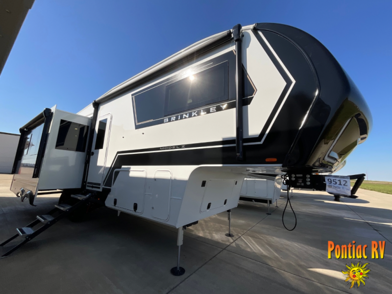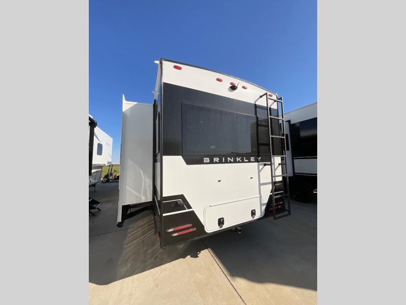 The Brinkley mid-profile Model Z fifth wheels bring you clean lines and an upscale look with plenty of style and exciting new features like the industry first brass plumbing connections. These units also feature an automotive grade front cap, plenty of exterior storage, dual exterior hot and cold showers, and wide stance leveling jacks for easy set up. Residential frameless windows provide a clean look and beautiful views, and ample electrical outlets and USB/USB-C outlets allow all of your electronics and appliances to easily be used and charged.