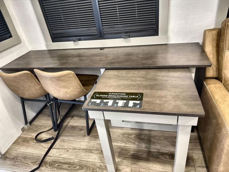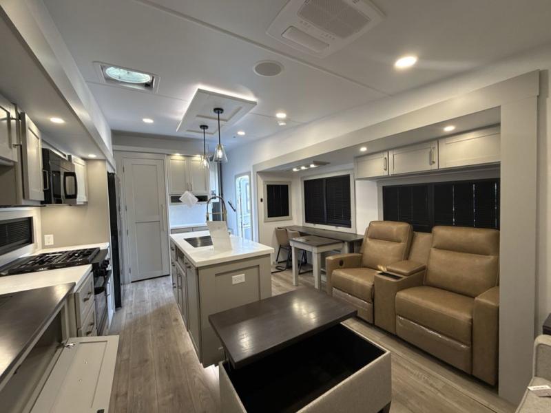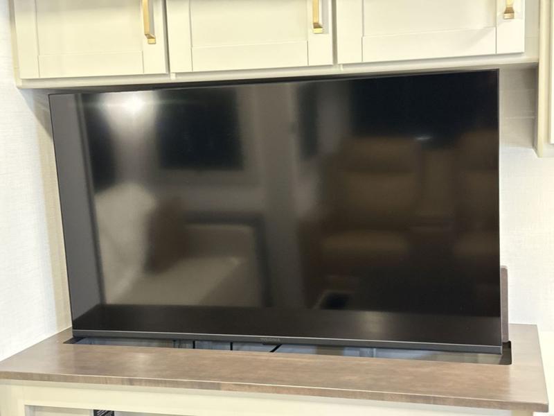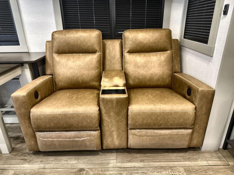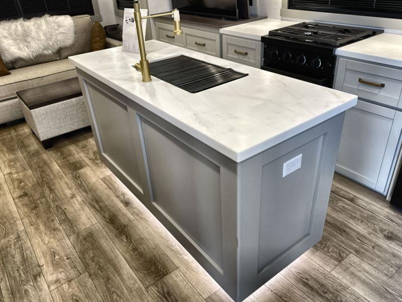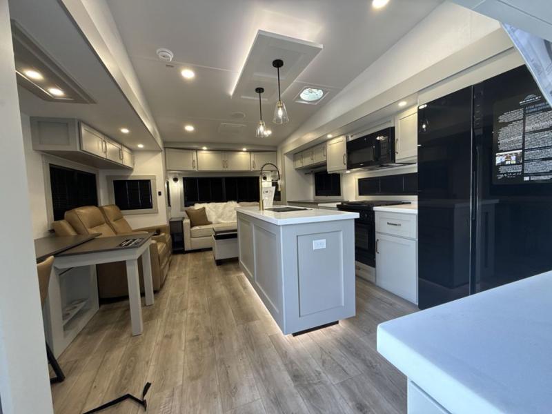 You're going to love every minute spent in this spacious fifth wheel that can sleep four. There is an inviting rear living area with a 72" tri-fold sofa and theater seating across from the televator and fireplace. The chef of your group can whip up dinner on the three burner cooktop or in the 30" residential microwave, and there is a 16 cu. ft. refrigerator that even opens when with the slide out is in. You will also enjoy the kitchen island with a farmhouse sink and roller cover, dual trash bins with a Stow N' Go paper towel holder, plus convenient dog bowls for your furry friends. You can store all your paper goods and snacks in the 84" pantry with adjustable shelving, and there is a hutch for nice dishes plus shoe storage in this model as well. Head to the front master bedroom where you'll find a queen bed with a TV, a large slide out with a wardrobe with drawers, plus a spacious bath.