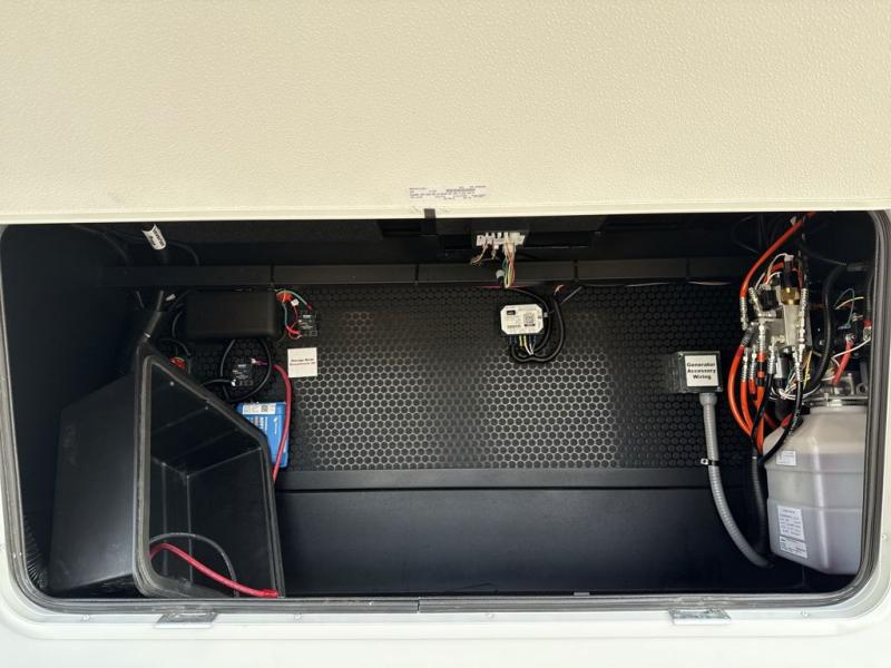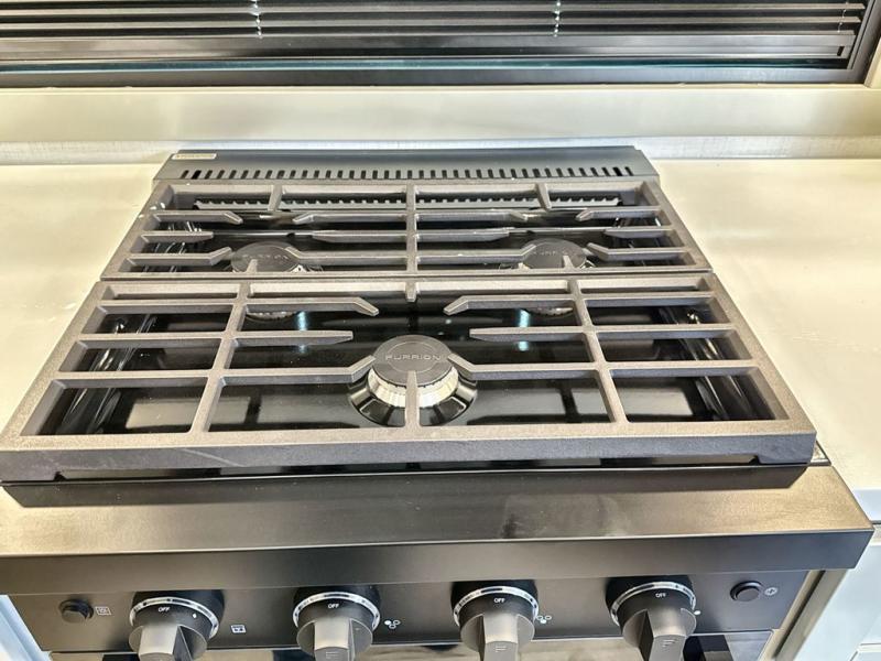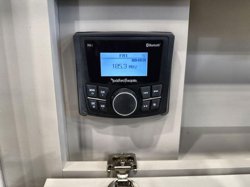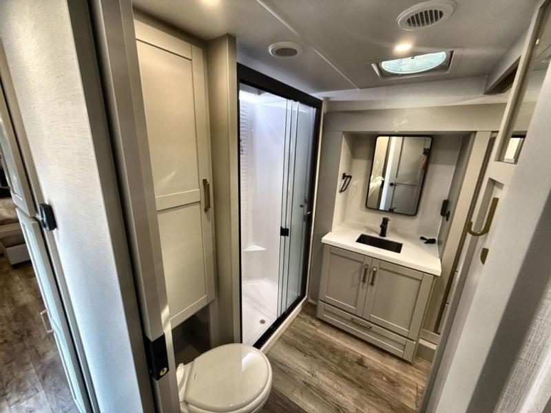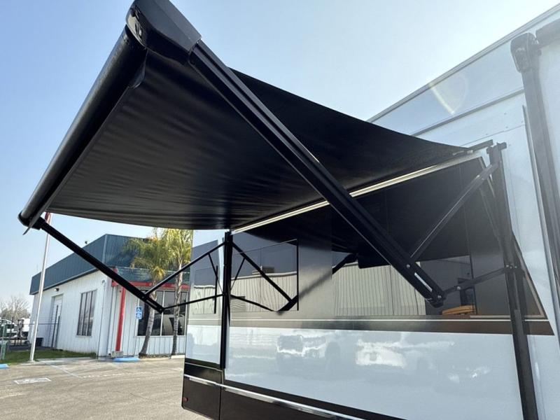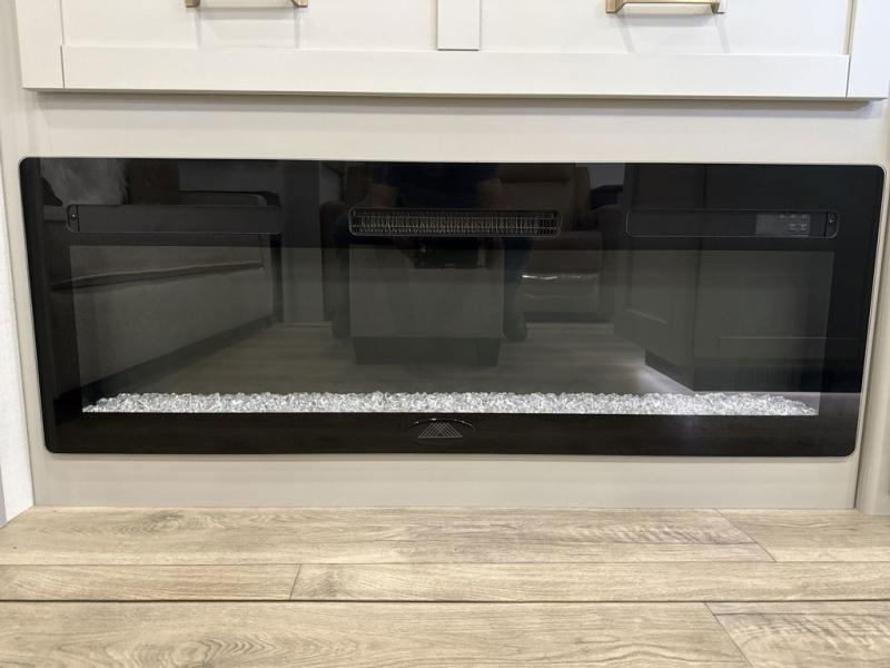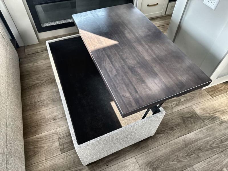 You're going to love every minute spent in this spacious fifth wheel that can sleep four. There is an inviting rear living area with a 72" tri-fold sofa and theater seating across from the televator and fireplace. The chef of your group can whip up dinner on the three burner cooktop or in the 30" residential microwave, and there is a 16 cu. ft. refrigerator that even opens when with the slide out is in. You will also enjoy the kitchen island with a farmhouse sink and roller cover, dual trash bins with a Stow N' Go paper towel holder, plus convenient dog bowls for your furry friends. You can store all your paper goods and snacks in the 84" pantry with adjustable shelving, and there is a hutch for nice dishes plus shoe storage in this model as well. Head to the front master bedroom where you'll find a queen bed with a TV, a large slide out with a wardrobe with drawers, plus a spacious bath.