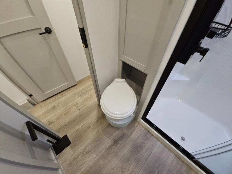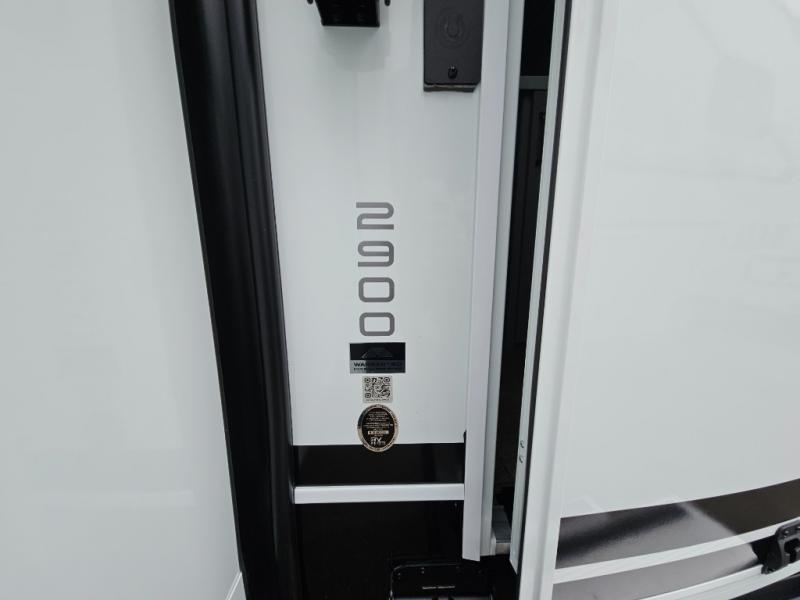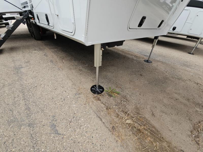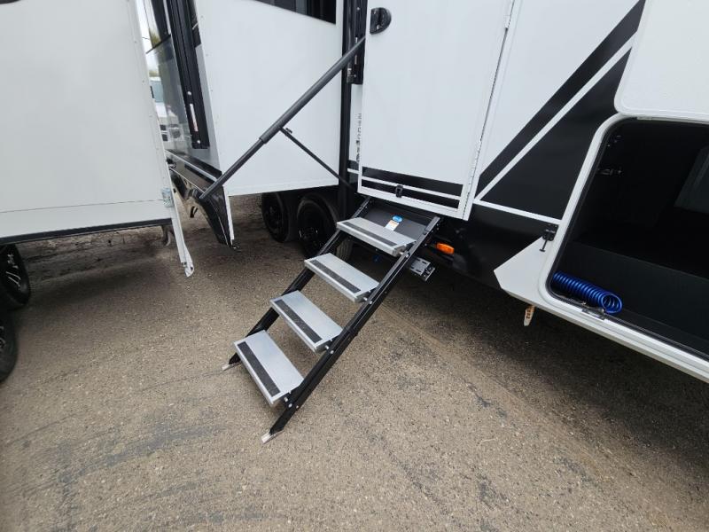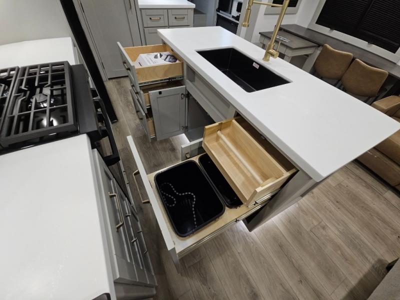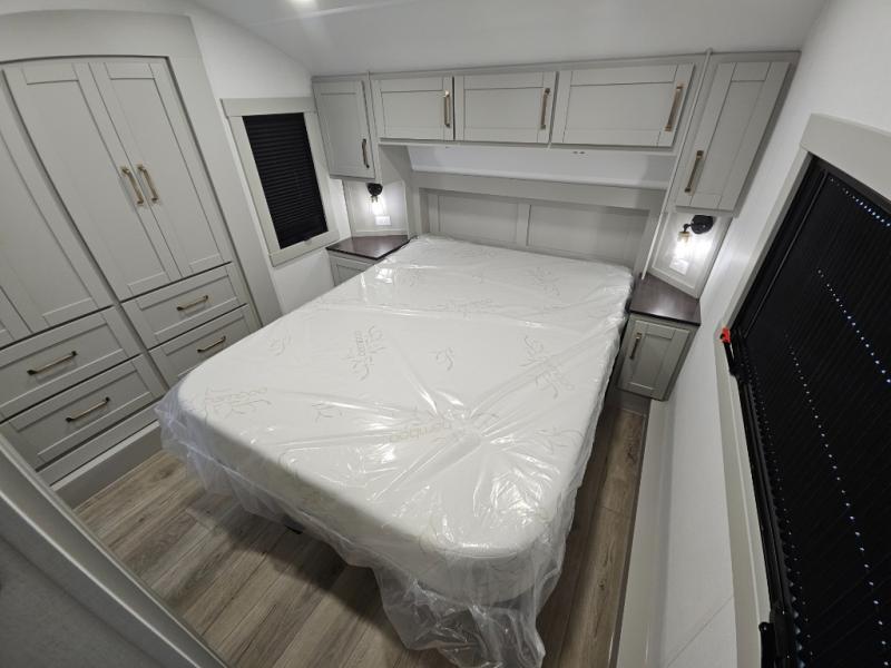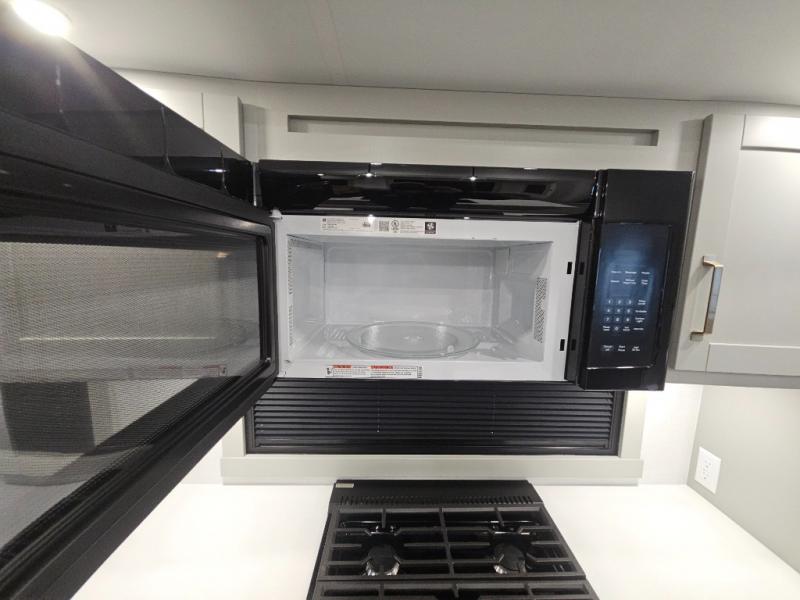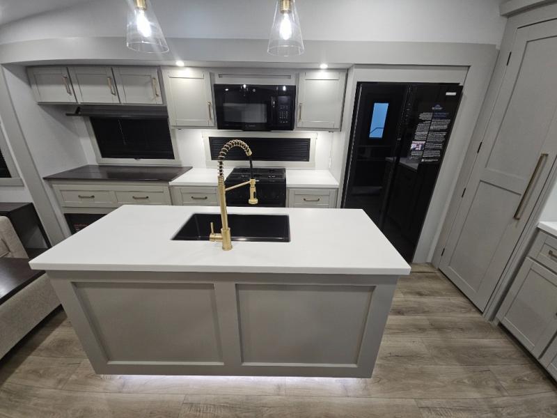 You're going to love every minute spent in this spacious fifth wheel that can sleep four. There is an inviting rear living area with a 72" tri-fold sofa and theater seating across from the televator and fireplace. The chef of your group can whip up dinner on the three burner cooktop or in the 30" residential microwave, and there is a 16 cu. ft. refrigerator that even opens when with the slide out is in. You will also enjoy the kitchen island with a farmhouse sink and roller cover, dual trash bins with a Stow N' Go paper towel holder, plus convenient dog bowls for your furry friends. You can store all your paper goods and snacks in the 84" pantry with adjustable shelving, and there is a hutch for nice dishes plus shoe storage in this model as well. Head to the front master bedroom where you'll find a queen bed with a TV, a large slide out with a wardrobe with drawers, plus a spacious bath.