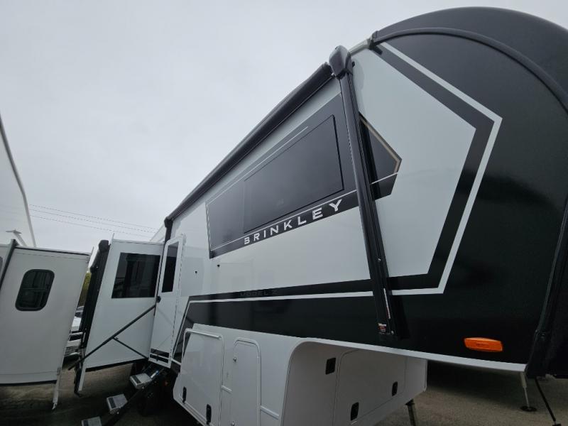 The Brinkley mid-profile Model Z fifth wheels bring you clean lines and an upscale look with plenty of style and exciting new features like the industry first brass plumbing connections. These units also feature an automotive grade front cap, plenty of exterior storage, dual exterior hot and cold showers, and wide stance leveling jacks for easy set up. Residential frameless windows provide a clean look and beautiful views, and ample electrical outlets and USB/USB-C outlets allow all of your electronics and appliances to easily be used and charged.