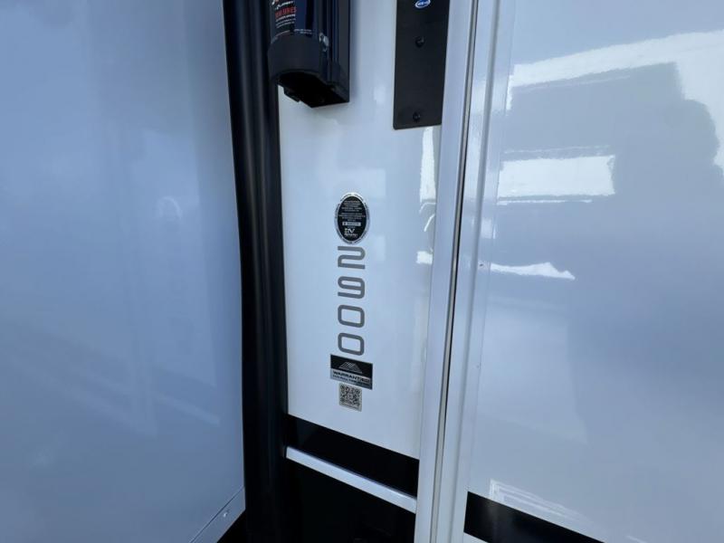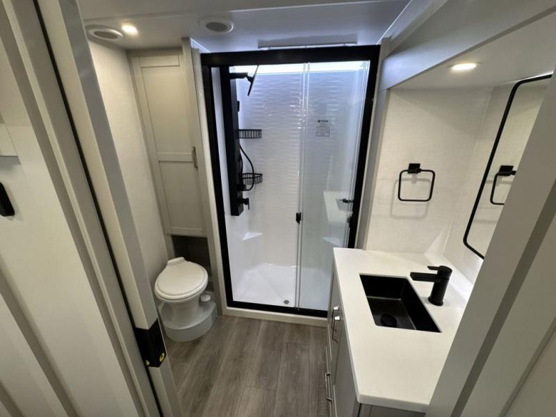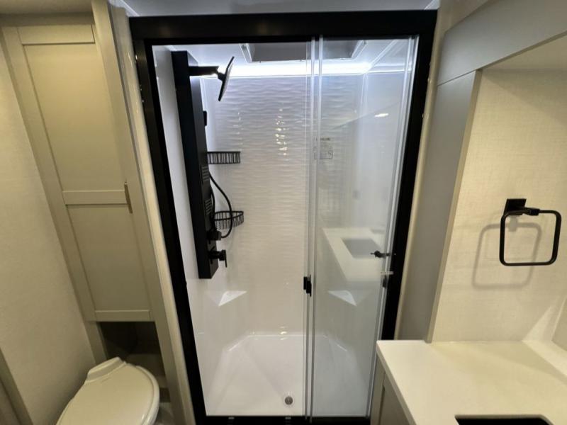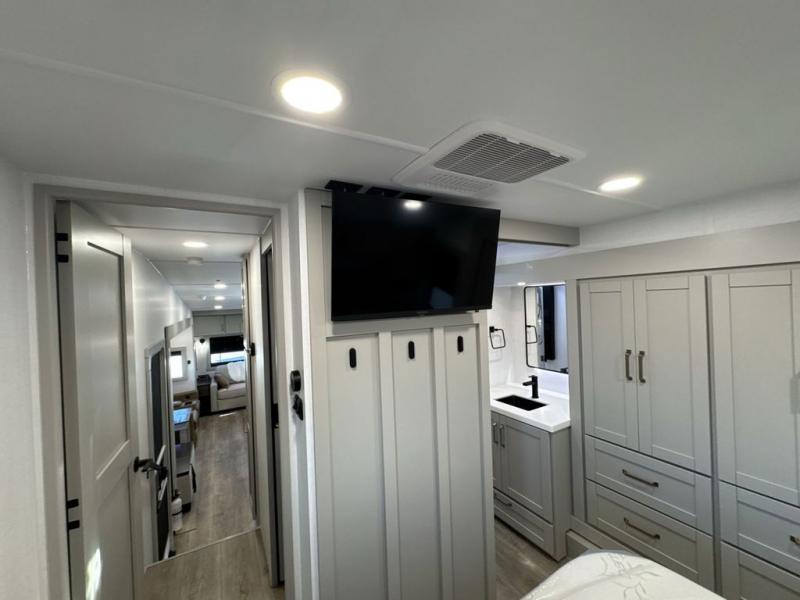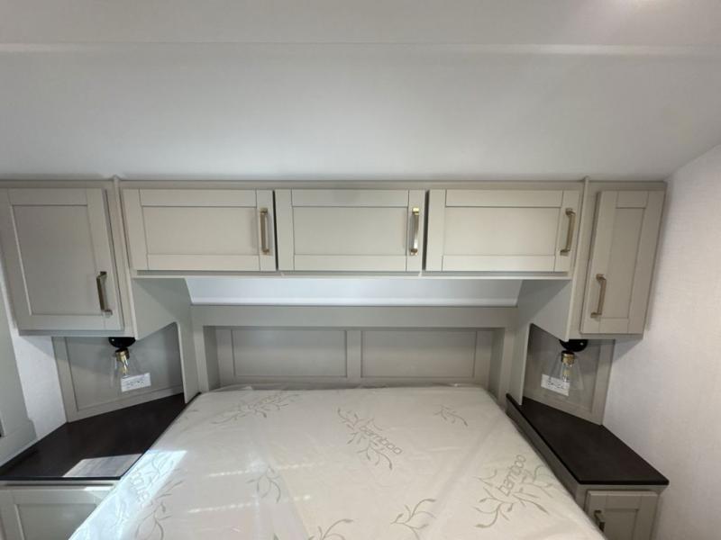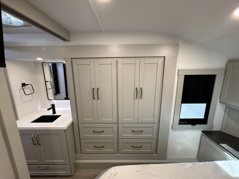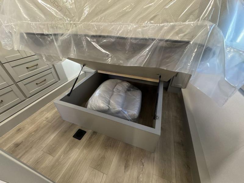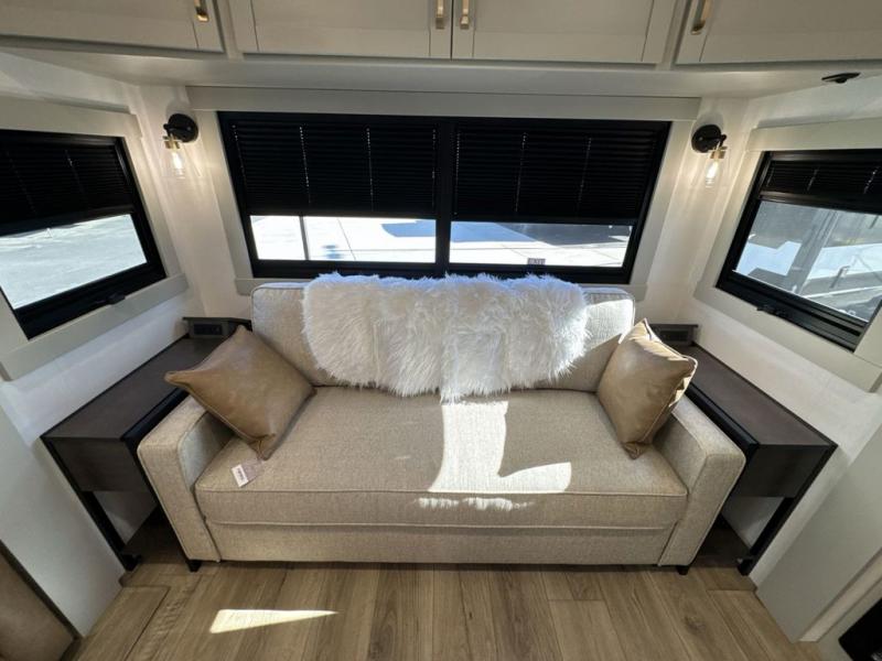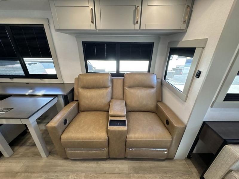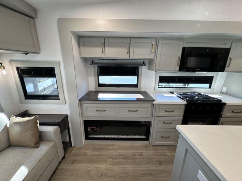 You're going to love every minute spent in this spacious fifth wheel that can sleep four. There is an inviting rear living area with a 72" tri-fold sofa and theater seating across from the televator and fireplace. The chef of your group can whip up dinner on the three burner cooktop or in the 30" residential microwave, and there is a 16 cu. ft. refrigerator that even opens when with the slide out is in. You will also enjoy the kitchen island with a farmhouse sink and roller cover, dual trash bins with a Stow N' Go paper towel holder, plus convenient dog bowls for your furry friends. You can store all your paper goods and snacks in the 84" pantry with adjustable shelving, and there is a hutch for nice dishes plus shoe storage in this model as well. Head to the front master bedroom where you'll find a queen bed with a TV, a large slide out with a wardrobe with drawers, plus a spacious bath.