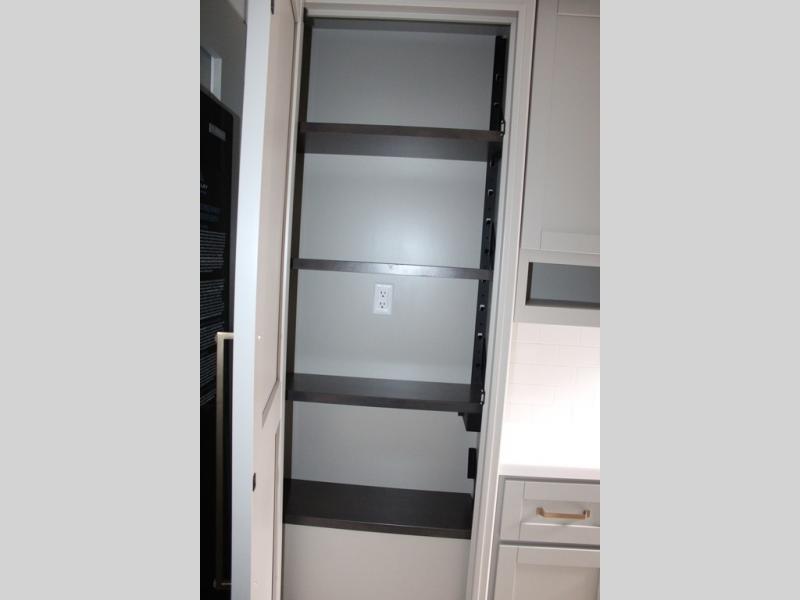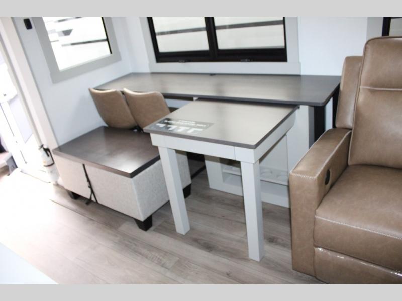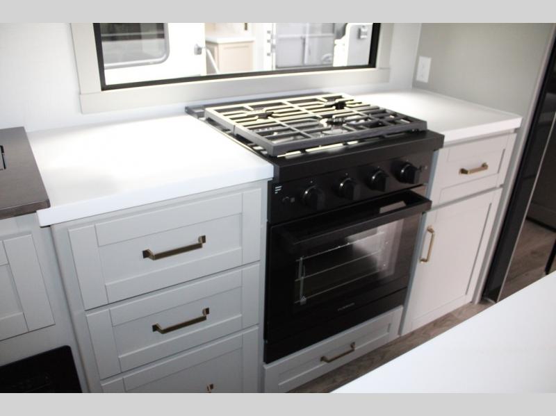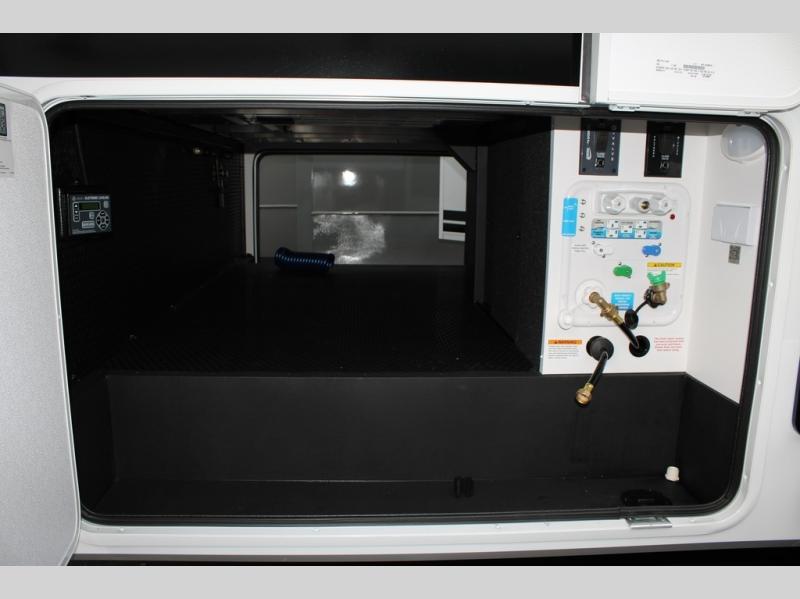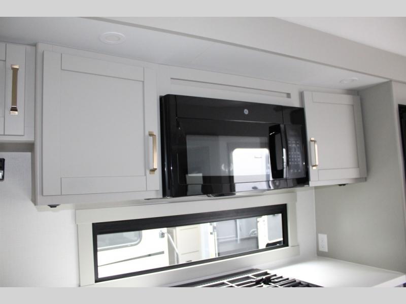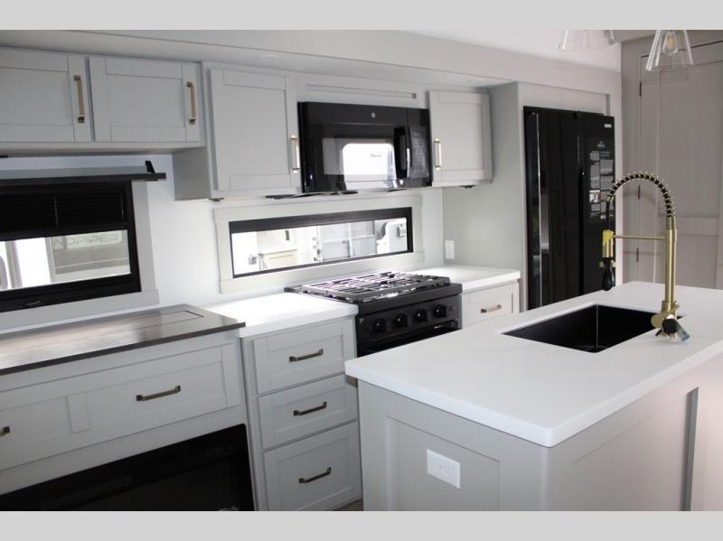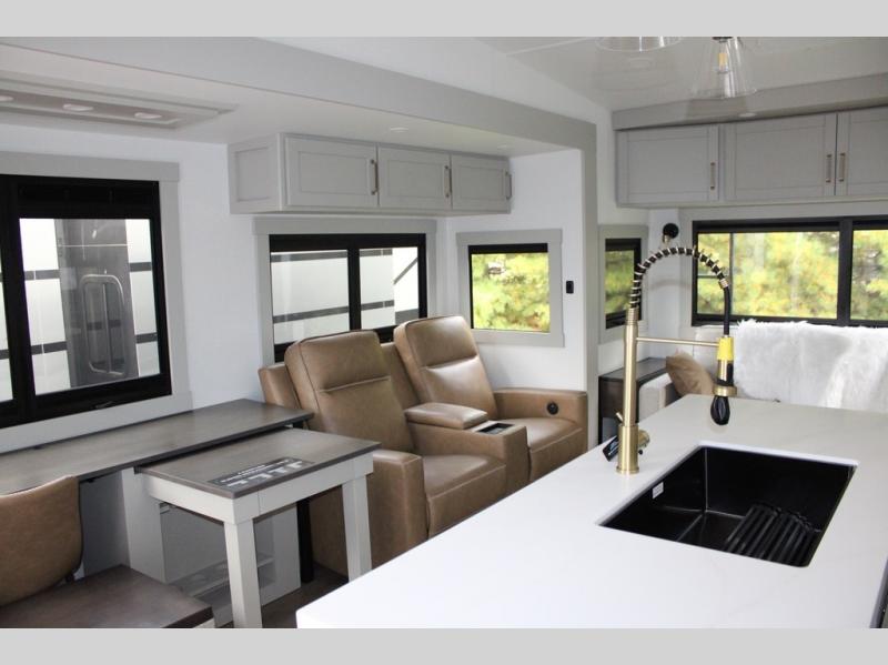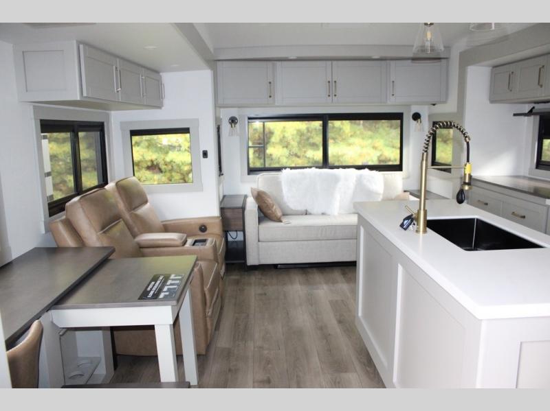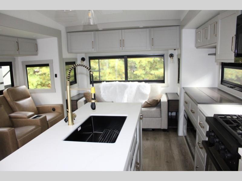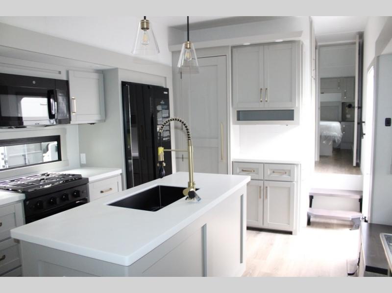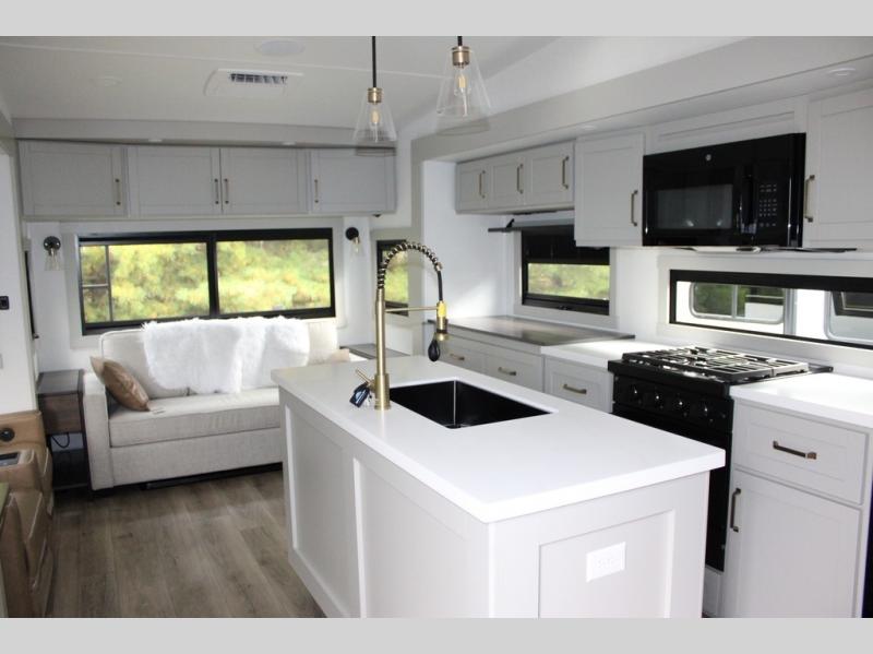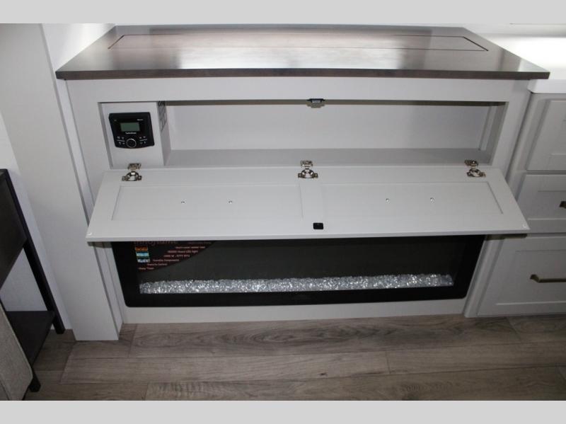 You're going to love every minute spent in this spacious fifth wheel that can sleep four. There is an inviting rear living area with a 72" tri-fold sofa and theater seating across from the televator and fireplace. The chef of your group can whip up dinner on the three burner cooktop or in the 30" residential microwave, and there is a 16 cu. ft. refrigerator that even opens when with the slide out is in. You will also enjoy the kitchen island with a farmhouse sink and roller cover, dual trash bins with a Stow N' Go paper towel holder, plus convenient dog bowls for your furry friends. You can store all your paper goods and snacks in the 84" pantry with adjustable shelving, and there is a hutch for nice dishes plus shoe storage in this model as well. Head to the front master bedroom where you'll find a queen bed with a TV, a large slide out with a wardrobe with drawers, plus a spacious bath.