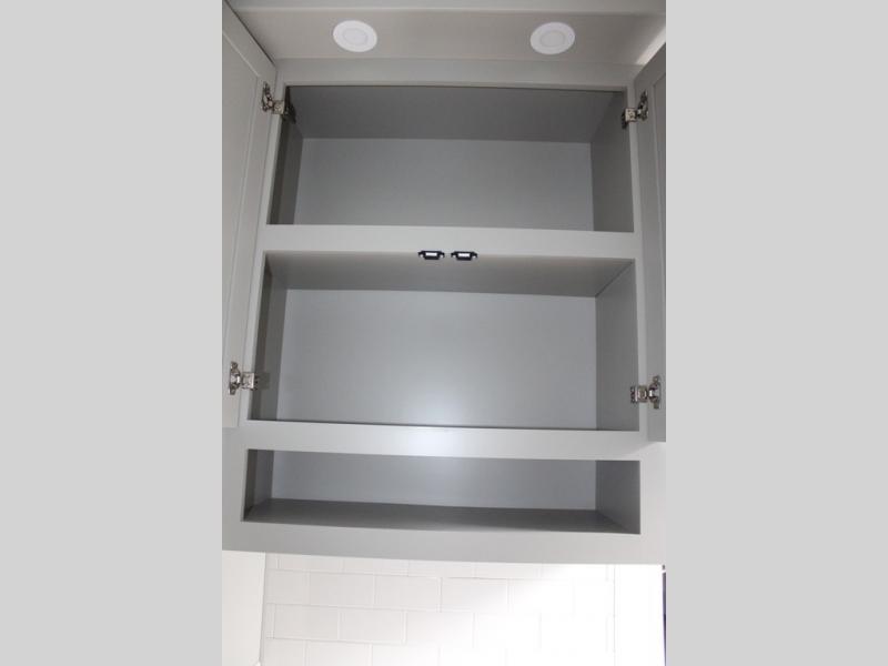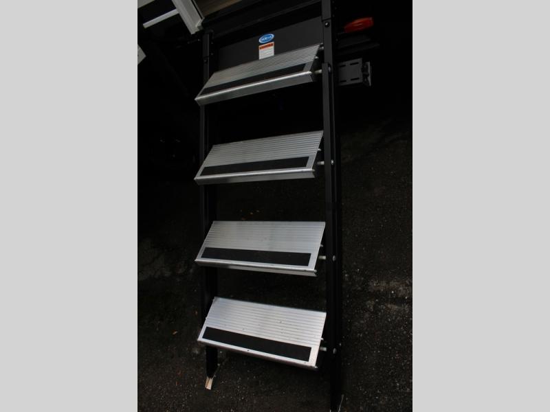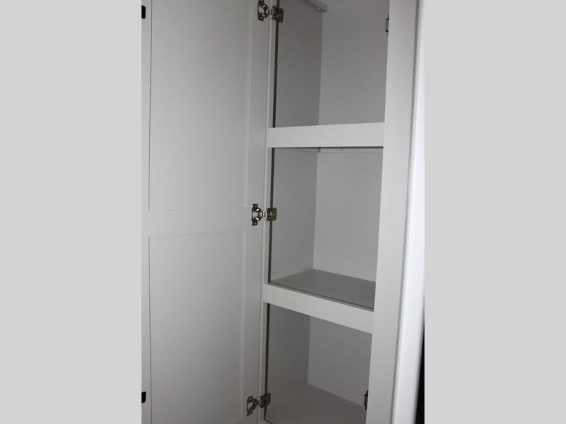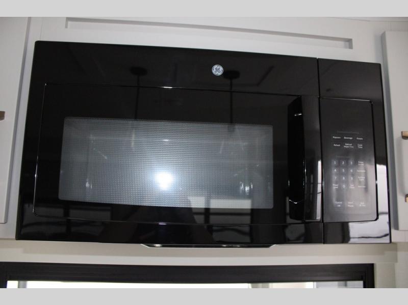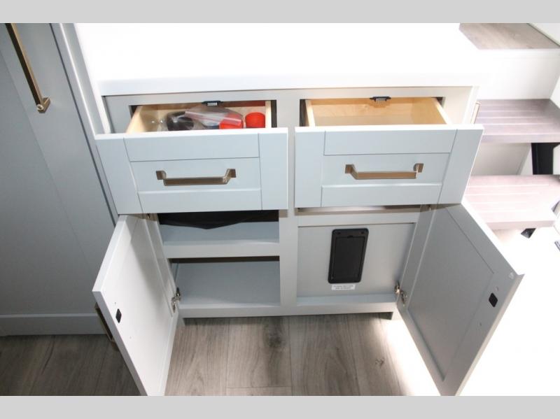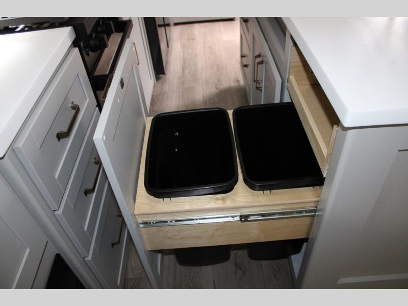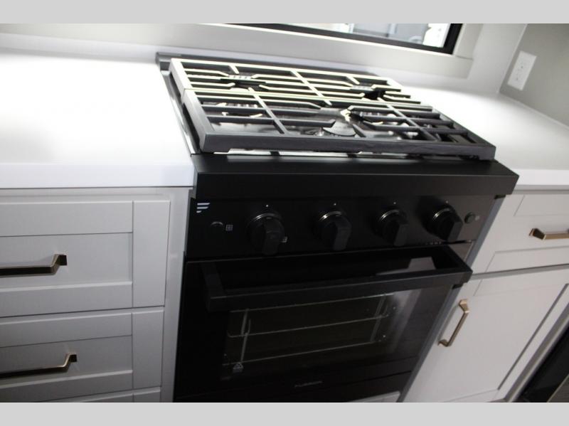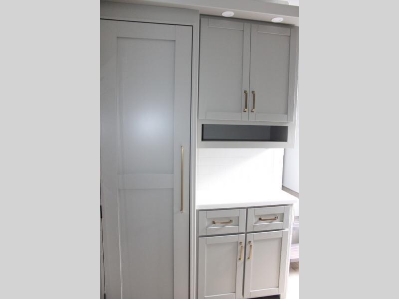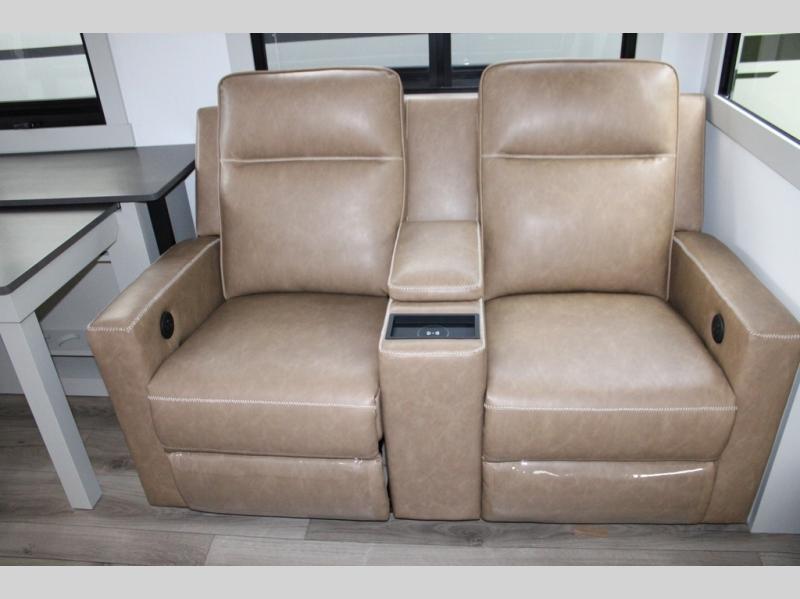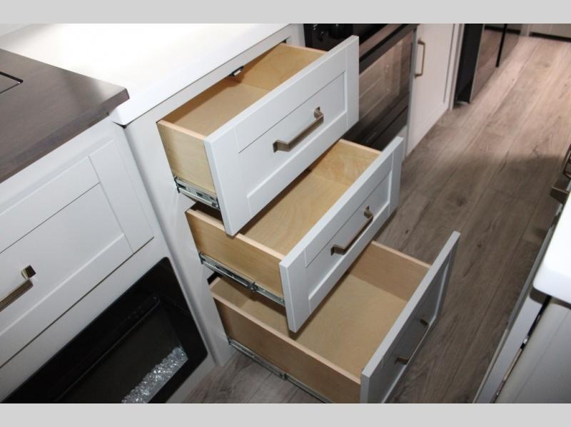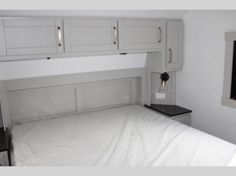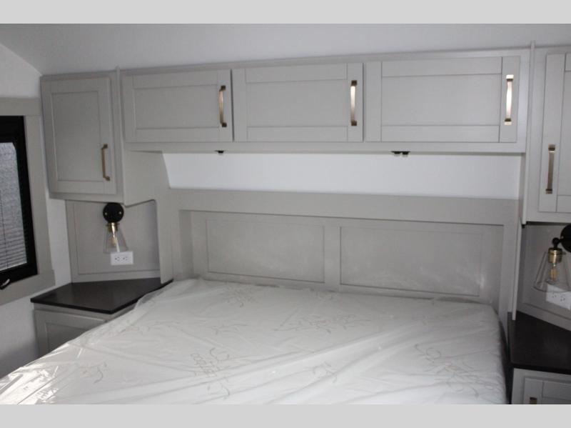 You're going to love every minute spent in this spacious fifth wheel that can sleep four. There is an inviting rear living area with a 72" tri-fold sofa and theater seating across from the televator and fireplace. The chef of your group can whip up dinner on the three burner cooktop or in the 30" residential microwave, and there is a 16 cu. ft. refrigerator that even opens when with the slide out is in. You will also enjoy the kitchen island with a farmhouse sink and roller cover, dual trash bins with a Stow N' Go paper towel holder, plus convenient dog bowls for your furry friends. You can store all your paper goods and snacks in the 84" pantry with adjustable shelving, and there is a hutch for nice dishes plus shoe storage in this model as well. Head to the front master bedroom where you'll find a queen bed with a TV, a large slide out with a wardrobe with drawers, plus a spacious bath.