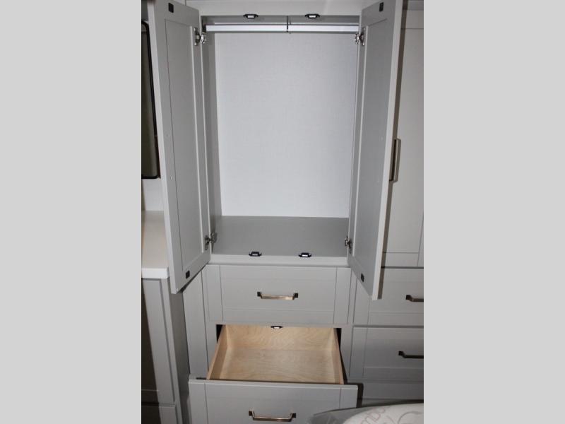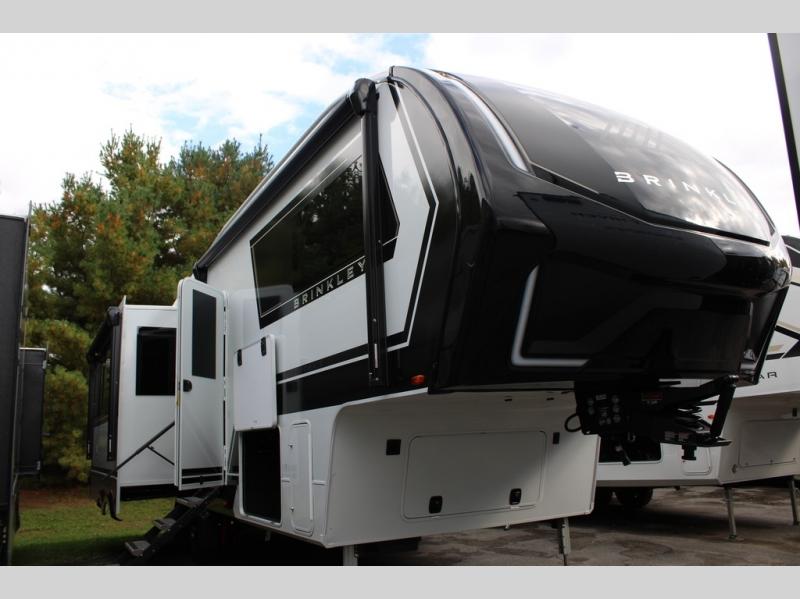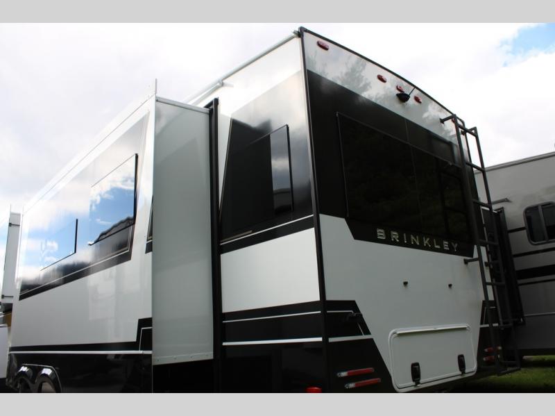 The Brinkley mid-profile Model Z fifth wheels bring you clean lines and an upscale look with plenty of style and exciting new features like the industry first brass plumbing connections. These units also feature an automotive grade front cap, plenty of exterior storage, dual exterior hot and cold showers, and wide stance leveling jacks for easy set up. Residential frameless windows provide a clean look and beautiful views, and ample electrical outlets and USB/USB-C outlets allow all of your electronics and appliances to easily be used and charged.