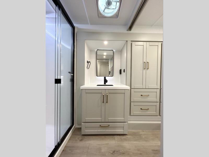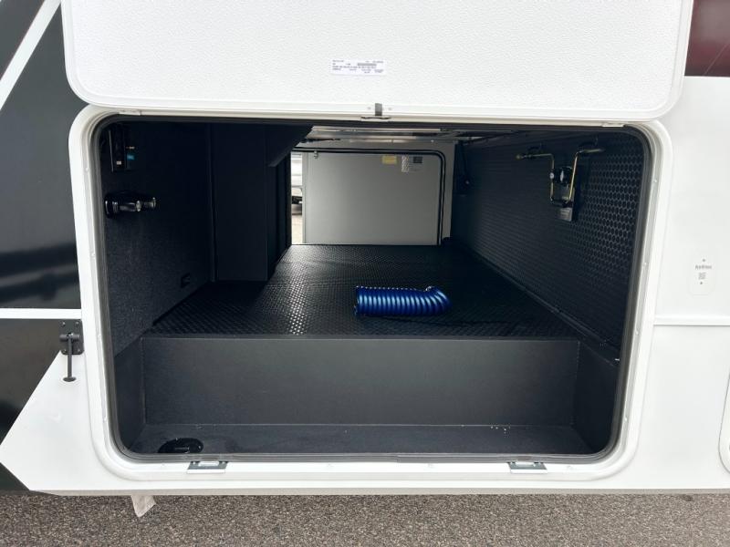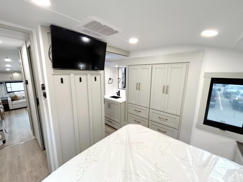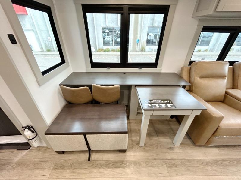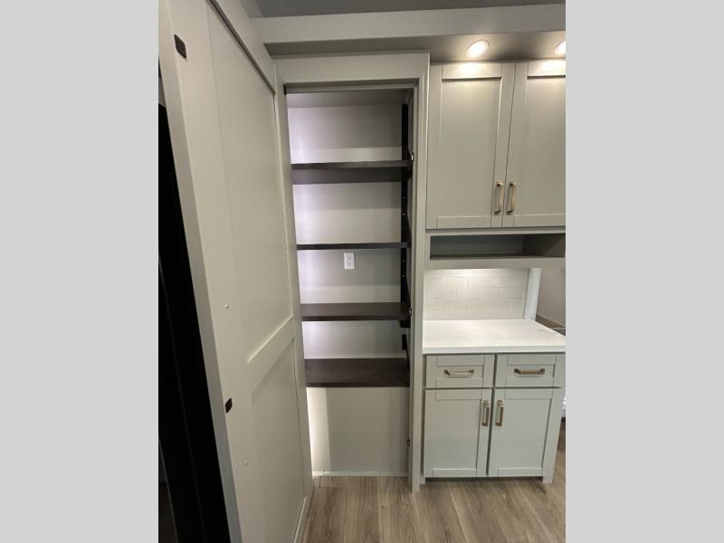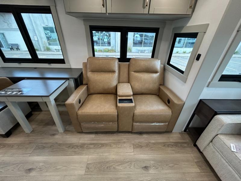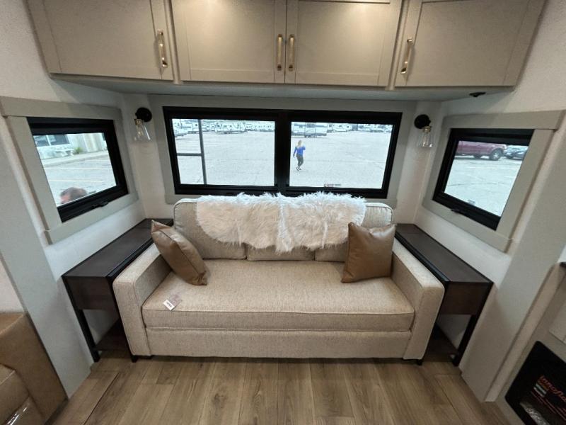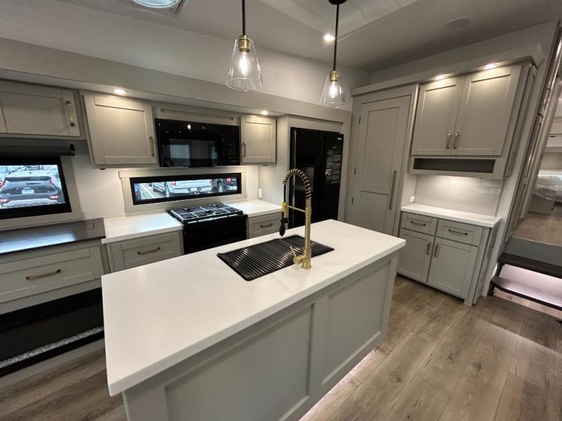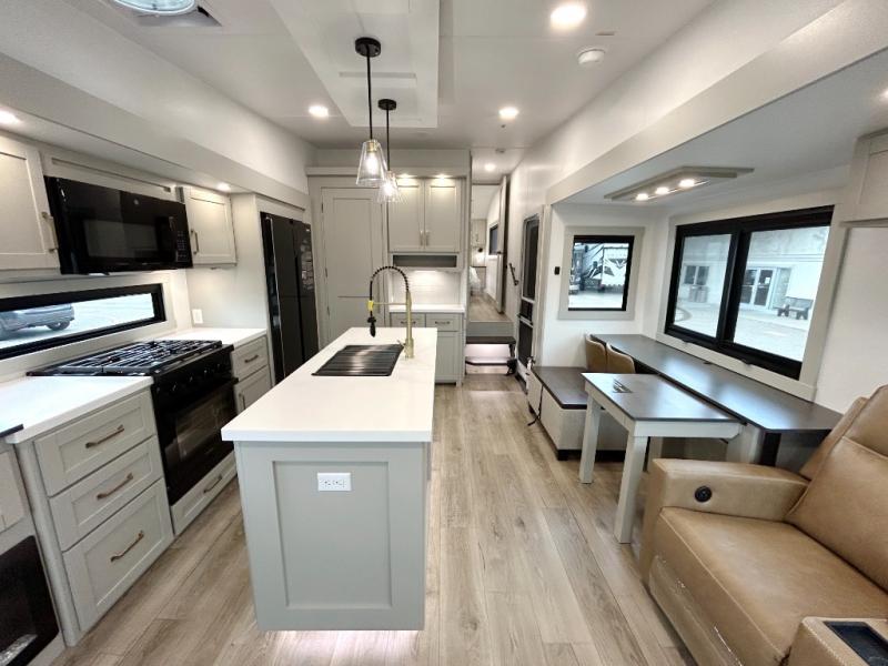 You're going to love every minute spent in this spacious fifth wheel that can sleep four. There is an inviting rear living area with a 72" tri-fold sofa and theater seating across from the televator and fireplace. The chef of your group can whip up dinner on the three burner cooktop or in the 30" residential microwave, and there is a 16 cu. ft. refrigerator that even opens when with the slide out is in. You will also enjoy the kitchen island with a farmhouse sink and roller cover, dual trash bins with a Stow N' Go paper towel holder, plus convenient dog bowls for your furry friends. You can store all your paper goods and snacks in the 84" pantry with adjustable shelving, and there is a hutch for nice dishes plus shoe storage in this model as well. Head to the front master bedroom where you'll find a queen bed with a TV, a large slide out with a wardrobe with drawers, plus a spacious bath.