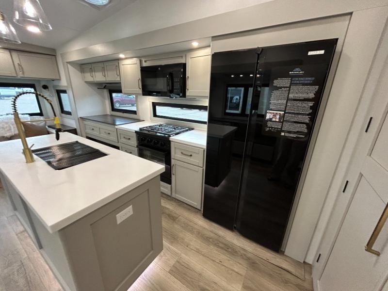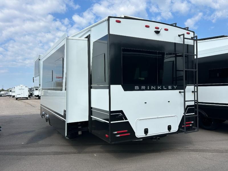 The Brinkley mid-profile Model Z fifth wheels bring you clean lines and an upscale look with plenty of style and exciting new features like the industry first brass plumbing connections. These units also feature an automotive grade front cap, plenty of exterior storage, dual exterior hot and cold showers, and wide stance leveling jacks for easy set up. Residential frameless windows provide a clean look and beautiful views, and ample electrical outlets and USB/USB-C outlets allow all of your electronics and appliances to easily be used and charged.