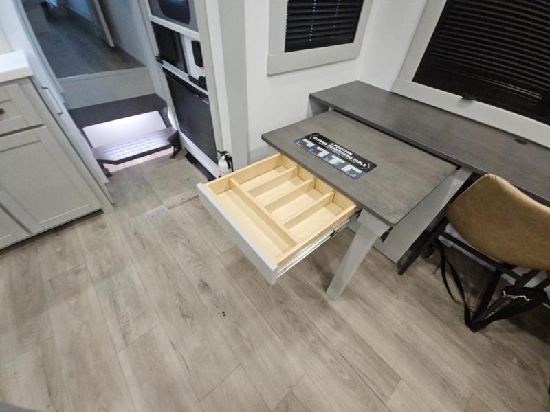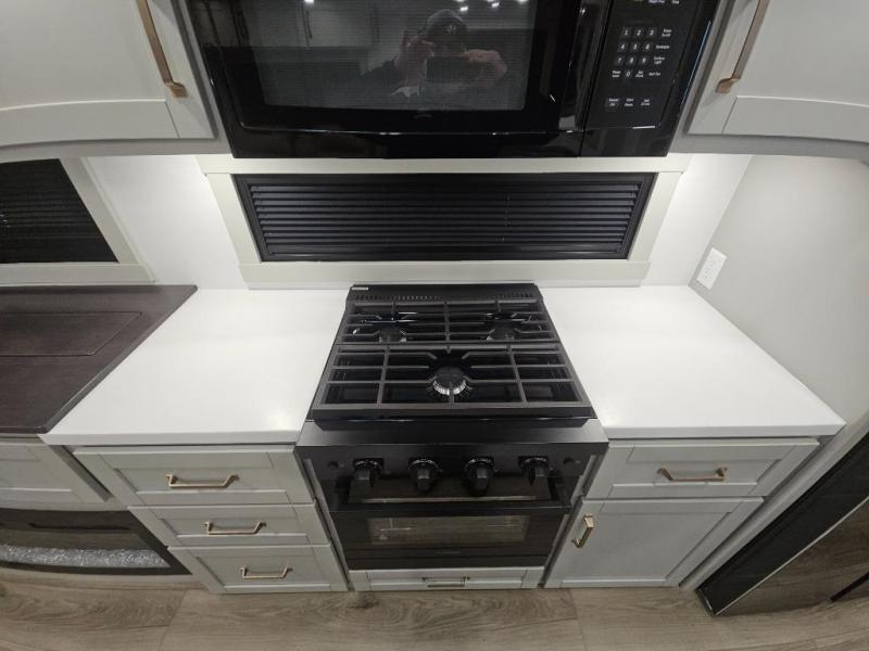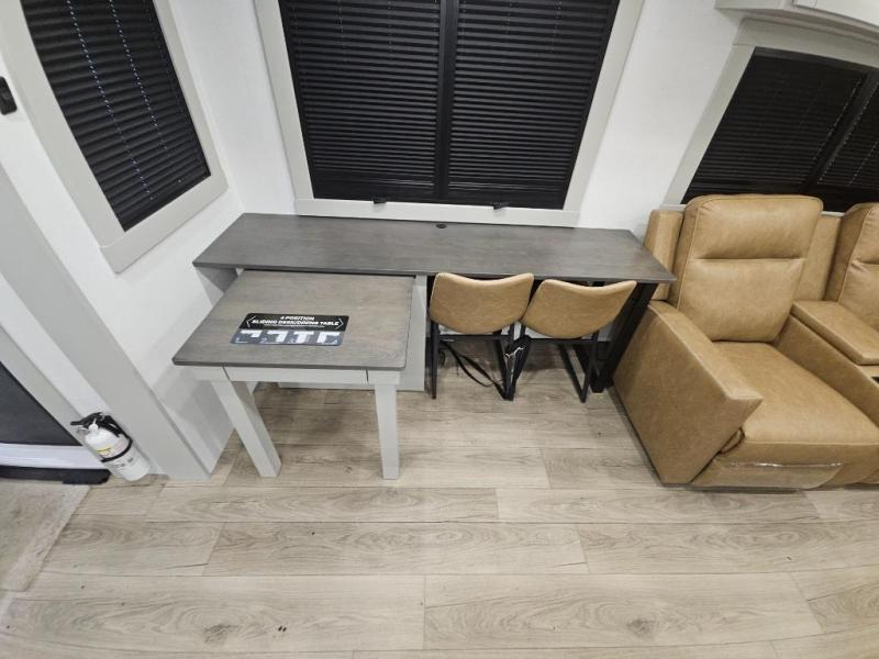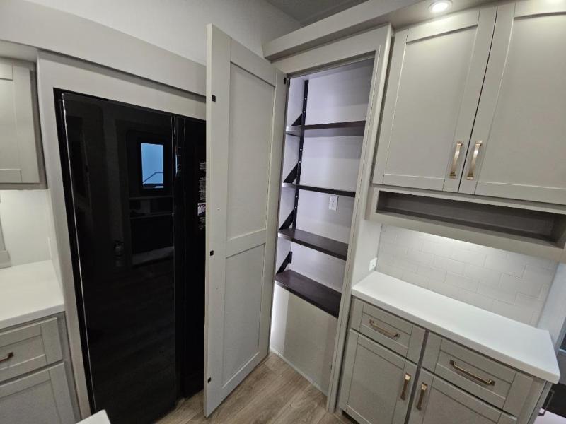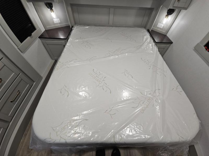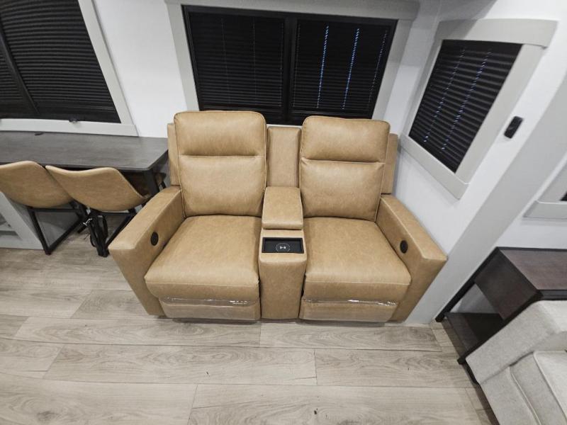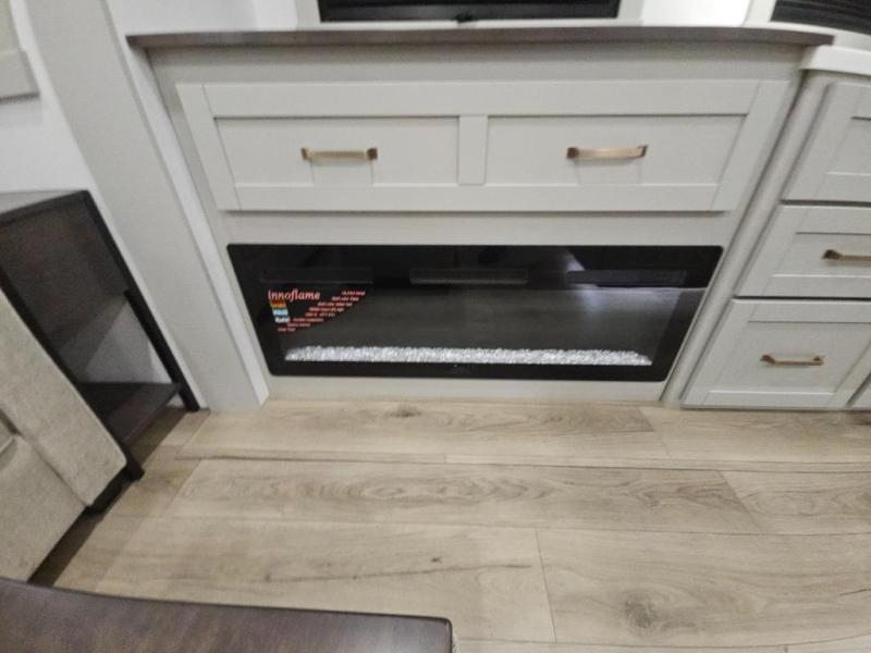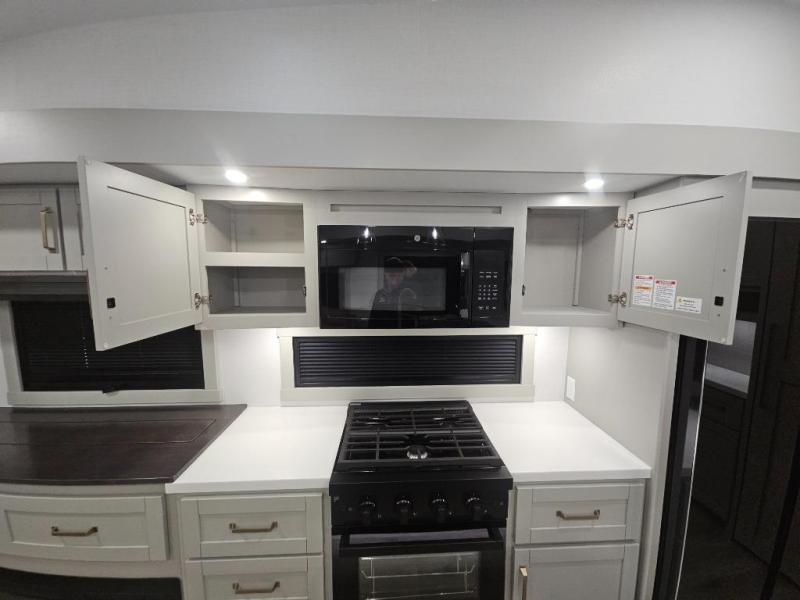 You're going to love every minute spent in this spacious fifth wheel that can sleep four. There is an inviting rear living area with a 72" tri-fold sofa and theater seating across from the televator and fireplace. The chef of your group can whip up dinner on the three burner cooktop or in the 30" residential microwave, and there is a 16 cu. ft. refrigerator that even opens when with the slide out is in. You will also enjoy the kitchen island with a farmhouse sink and roller cover, dual trash bins with a Stow N' Go paper towel holder, plus convenient dog bowls for your furry friends. You can store all your paper goods and snacks in the 84" pantry with adjustable shelving, and there is a hutch for nice dishes plus shoe storage in this model as well. Head to the front master bedroom where you'll find a queen bed with a TV, a large slide out with a wardrobe with drawers, plus a spacious bath.