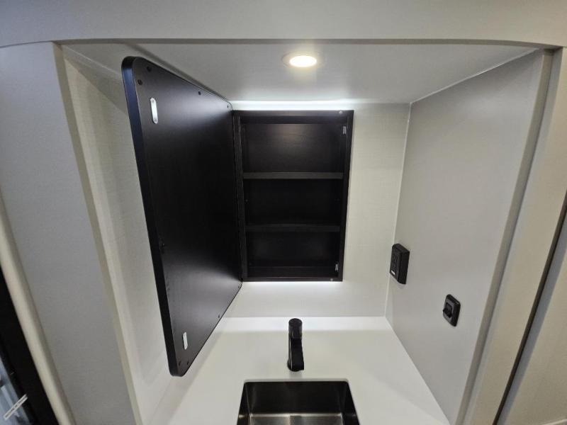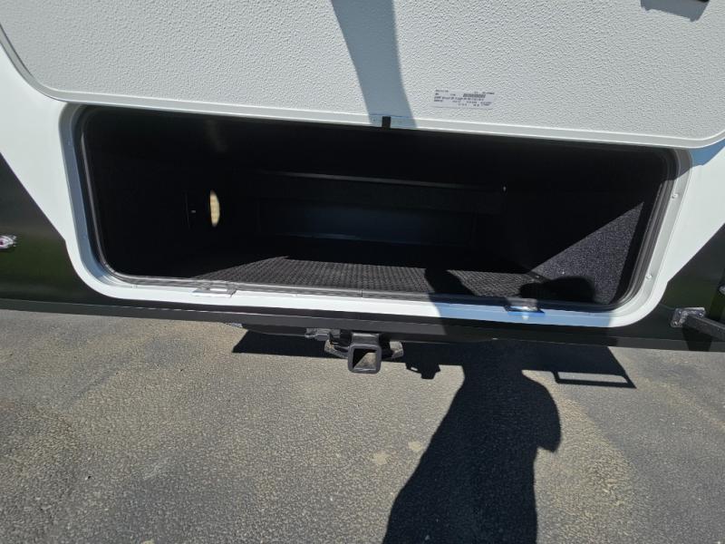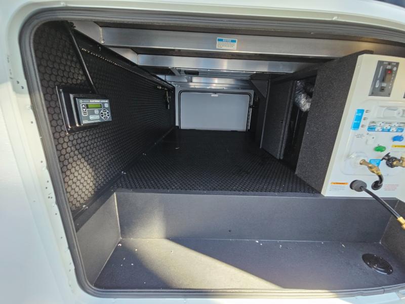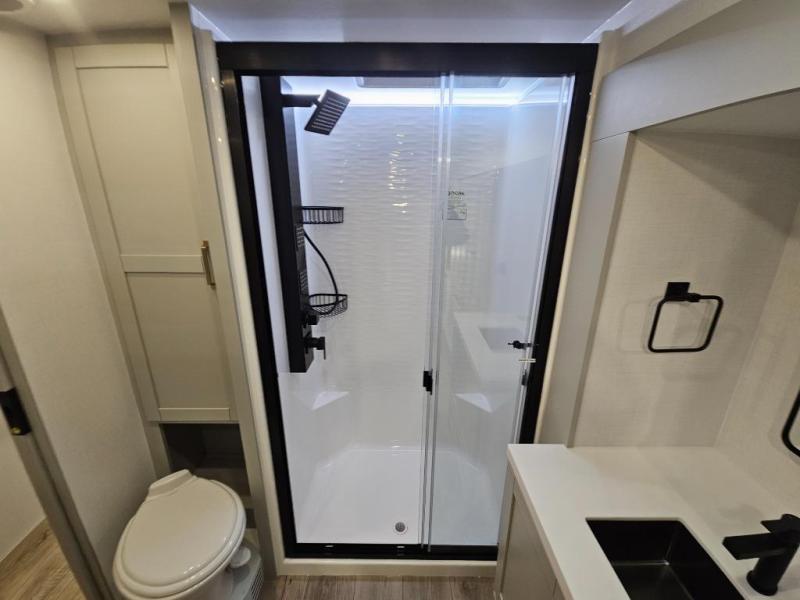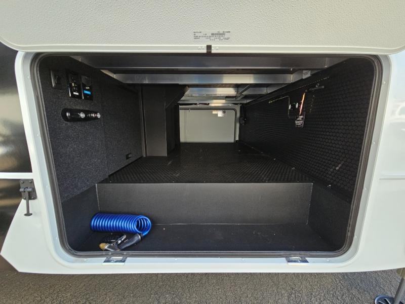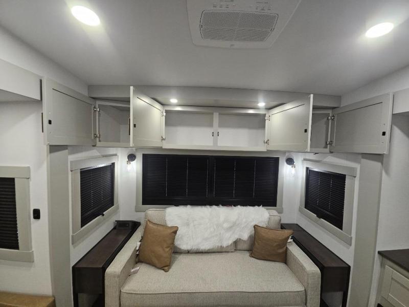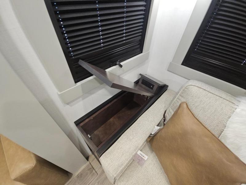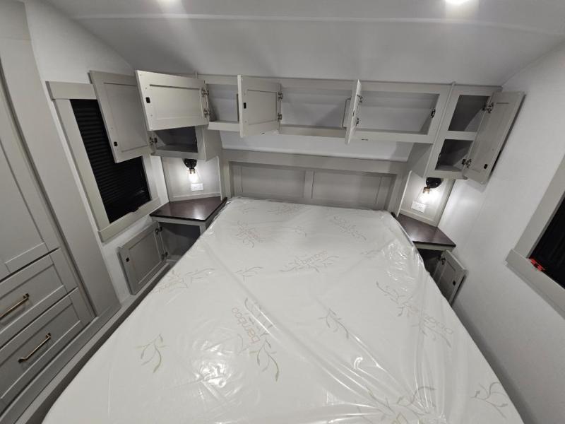 You're going to love every minute spent in this spacious fifth wheel that can sleep four. There is an inviting rear living area with a 72" tri-fold sofa and theater seating across from the televator and fireplace. The chef of your group can whip up dinner on the three burner cooktop or in the 30" residential microwave, and there is a 16 cu. ft. refrigerator that even opens when with the slide out is in. You will also enjoy the kitchen island with a farmhouse sink and roller cover, dual trash bins with a Stow N' Go paper towel holder, plus convenient dog bowls for your furry friends. You can store all your paper goods and snacks in the 84" pantry with adjustable shelving, and there is a hutch for nice dishes plus shoe storage in this model as well. Head to the front master bedroom where you'll find a queen bed with a TV, a large slide out with a wardrobe with drawers, plus a spacious bath.