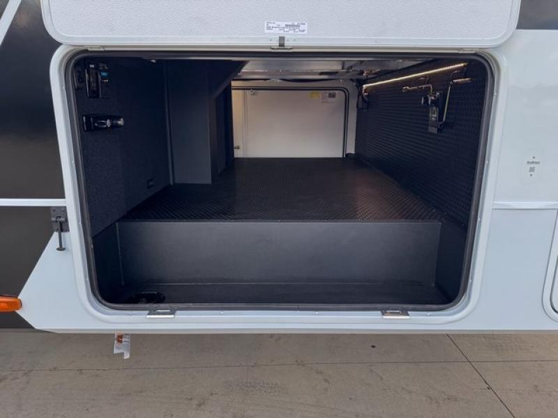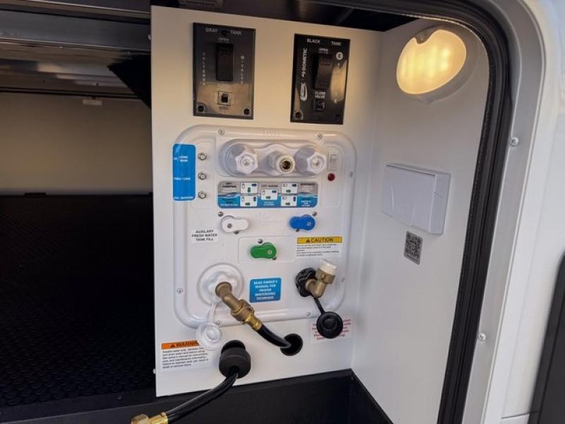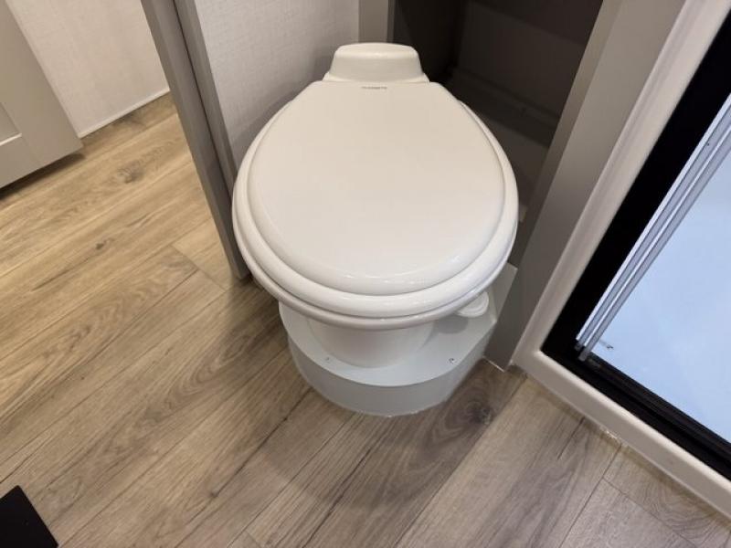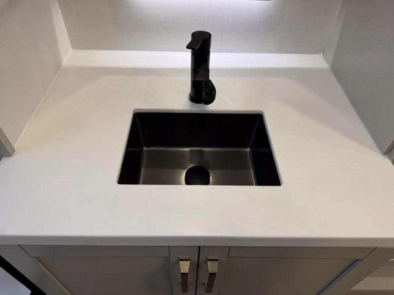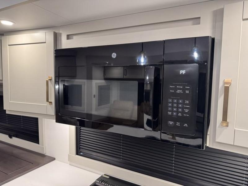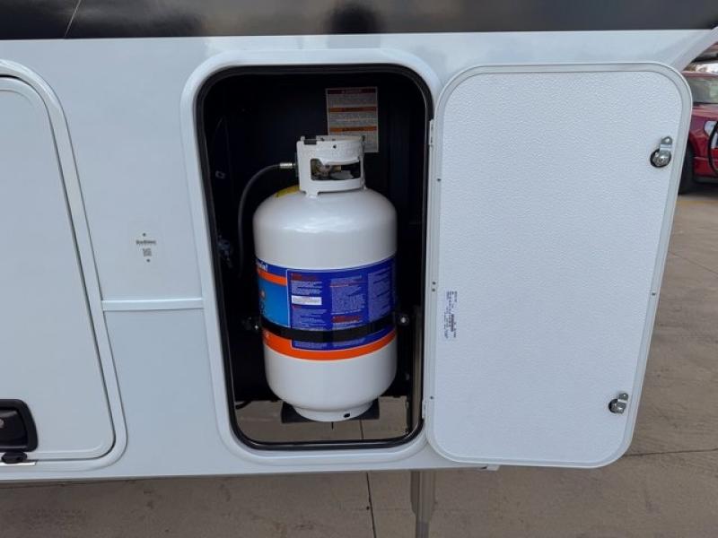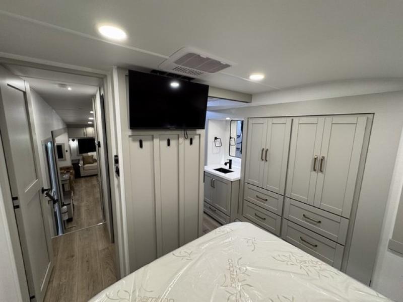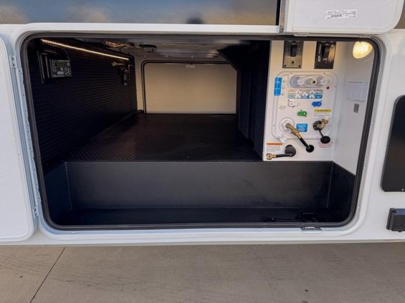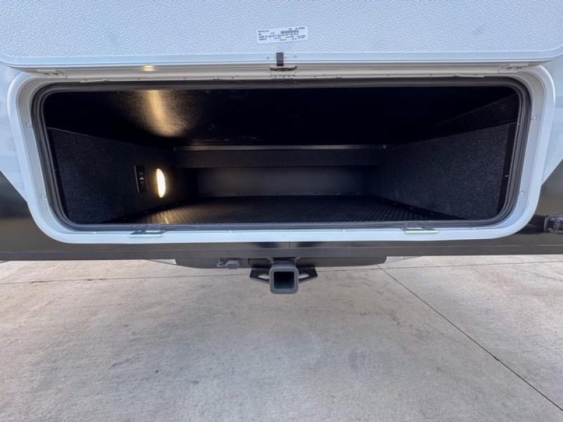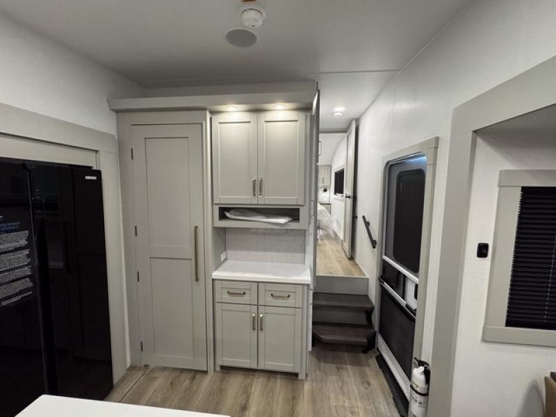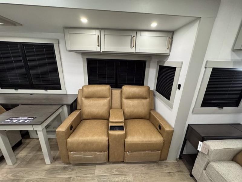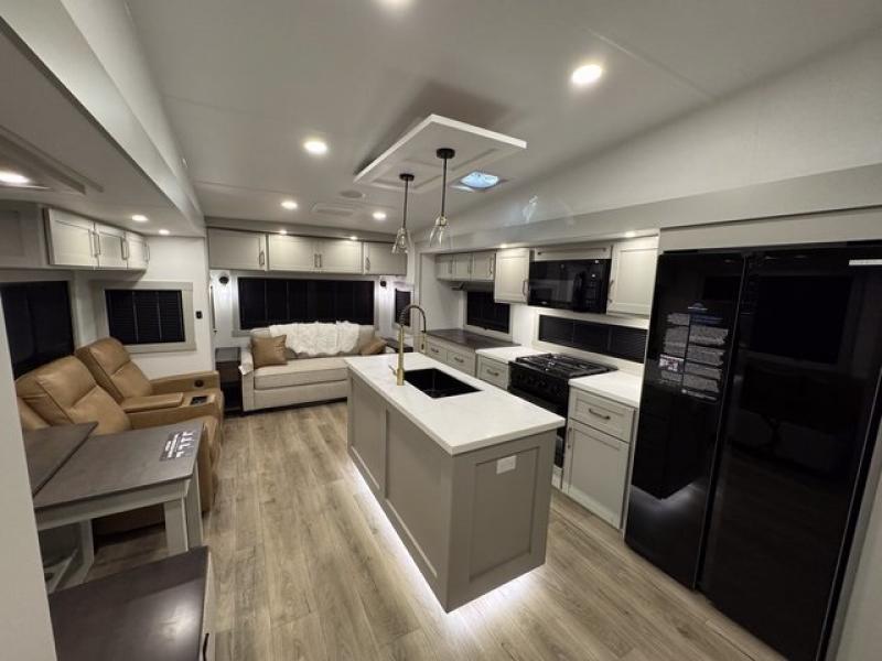 You're going to love every minute spent in this spacious fifth wheel that can sleep four. There is an inviting rear living area with a 72" tri-fold sofa and theater seating across from the televator and fireplace. The chef of your group can whip up dinner on the three burner cooktop or in the 30" residential microwave, and there is a 16 cu. ft. refrigerator that even opens when with the slide out is in. You will also enjoy the kitchen island with a farmhouse sink and roller cover, dual trash bins with a Stow N' Go paper towel holder, plus convenient dog bowls for your furry friends. You can store all your paper goods and snacks in the 84" pantry with adjustable shelving, and there is a hutch for nice dishes plus shoe storage in this model as well. Head to the front master bedroom where you'll find a queen bed with a TV, a large slide out with a wardrobe with drawers, plus a spacious bath.