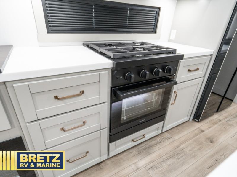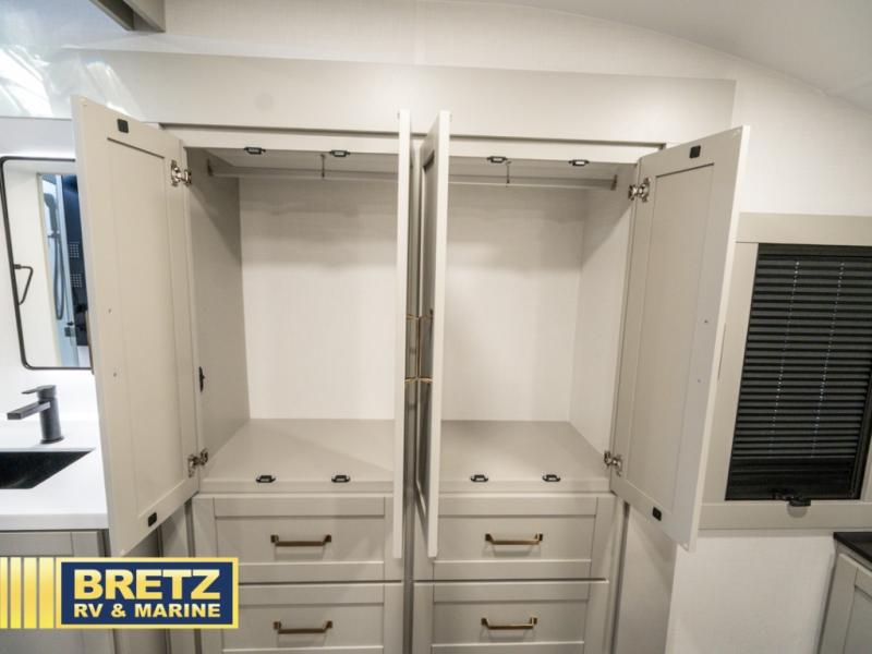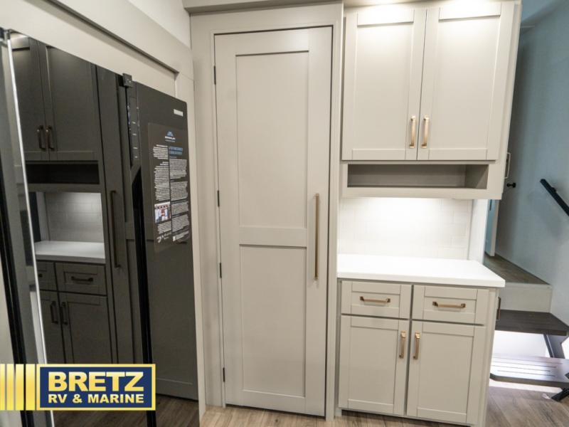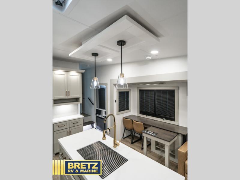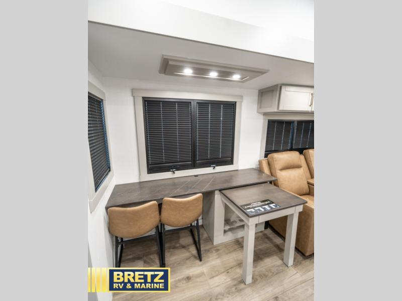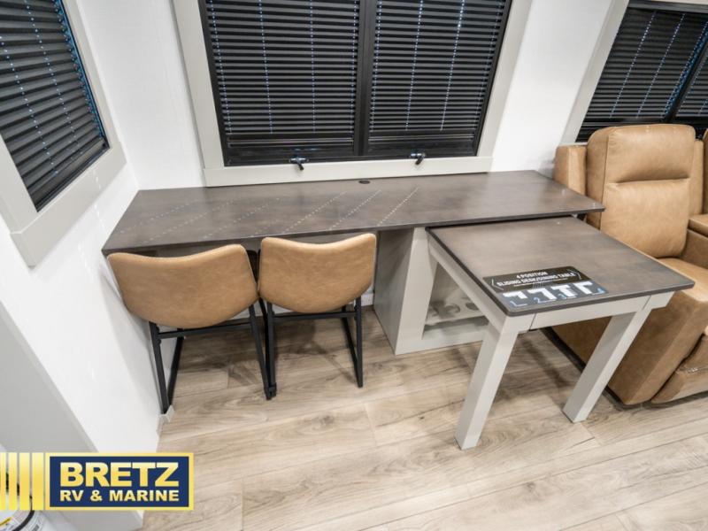 You're going to love every minute spent in this spacious fifth wheel that can sleep four. There is an inviting rear living area with a 72" tri-fold sofa and theater seating across from the televator and fireplace. The chef of your group can whip up dinner on the three burner cooktop or in the 30" residential microwave, and there is a 16 cu. ft. refrigerator that even opens when with the slide out is in. You will also enjoy the kitchen island with a farmhouse sink and roller cover, dual trash bins with a Stow N' Go paper towel holder, plus convenient dog bowls for your furry friends. You can store all your paper goods and snacks in the 84" pantry with adjustable shelving, and there is a hutch for nice dishes plus shoe storage in this model as well. Head to the front master bedroom where you'll find a queen bed with a TV, a large slide out with a wardrobe with drawers, plus a spacious bath.