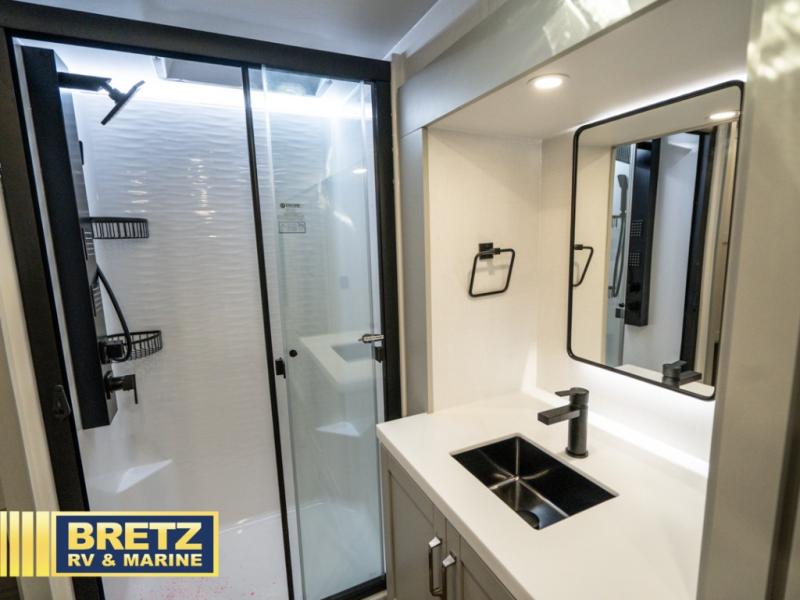 The Brinkley mid-profile Model Z fifth wheels bring you clean lines and an upscale look with plenty of style and exciting new features like the industry first brass plumbing connections. These units also feature an automotive grade front cap, plenty of exterior storage, dual exterior hot and cold showers, and wide stance leveling jacks for easy set up. Residential frameless windows provide a clean look and beautiful views, and ample electrical outlets and USB/USB-C outlets allow all of your electronics and appliances to easily be used and charged.