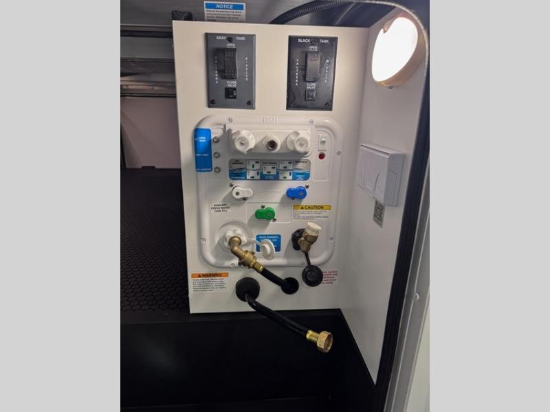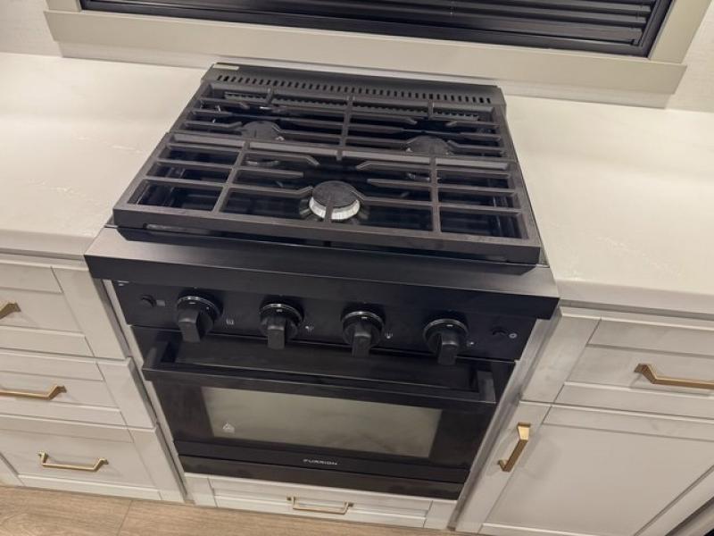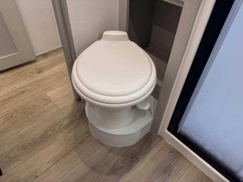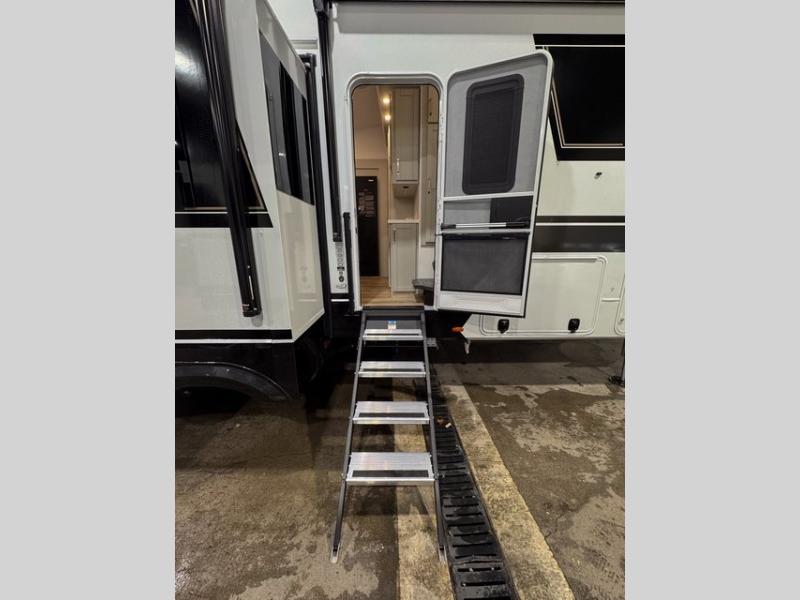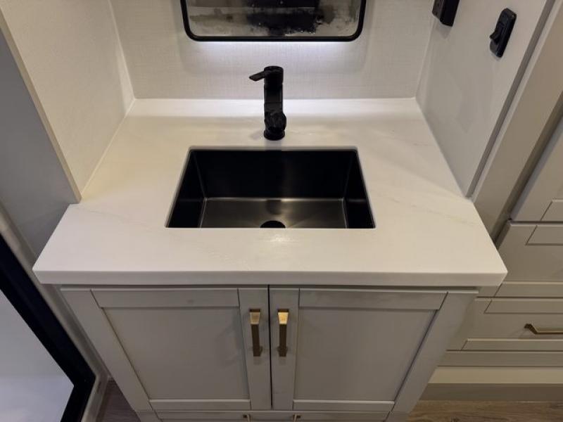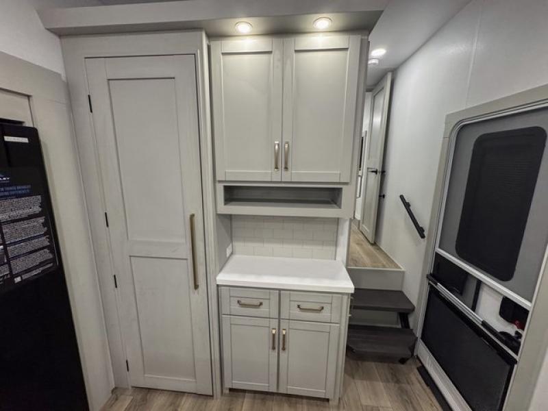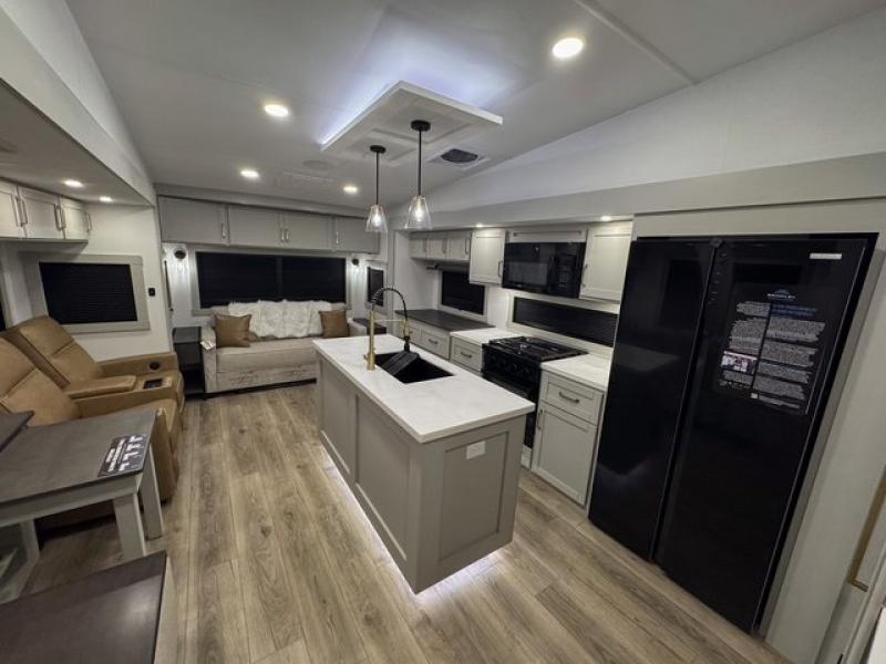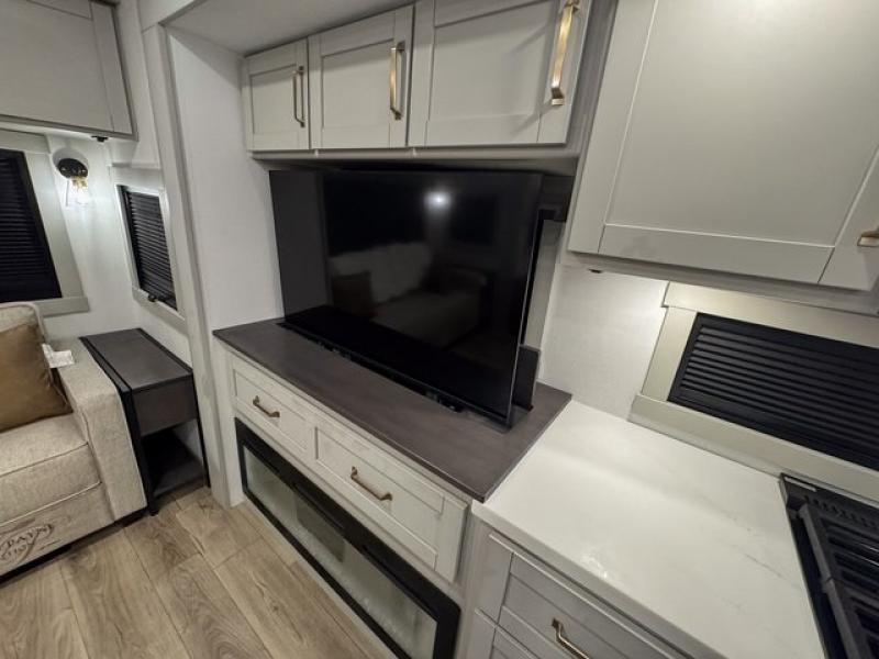 You're going to love every minute spent in this spacious fifth wheel that can sleep four. There is an inviting rear living area with a 72" tri-fold sofa and theater seating across from the televator and fireplace. The chef of your group can whip up dinner on the three burner cooktop or in the 30" residential microwave, and there is a 16 cu. ft. refrigerator that even opens when with the slide out is in. You will also enjoy the kitchen island with a farmhouse sink and roller cover, dual trash bins with a Stow N' Go paper towel holder, plus convenient dog bowls for your furry friends. You can store all your paper goods and snacks in the 84" pantry with adjustable shelving, and there is a hutch for nice dishes plus shoe storage in this model as well. Head to the front master bedroom where you'll find a queen bed with a TV, a large slide out with a wardrobe with drawers, plus a spacious bath.