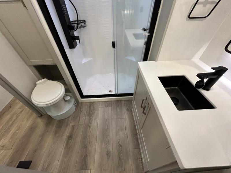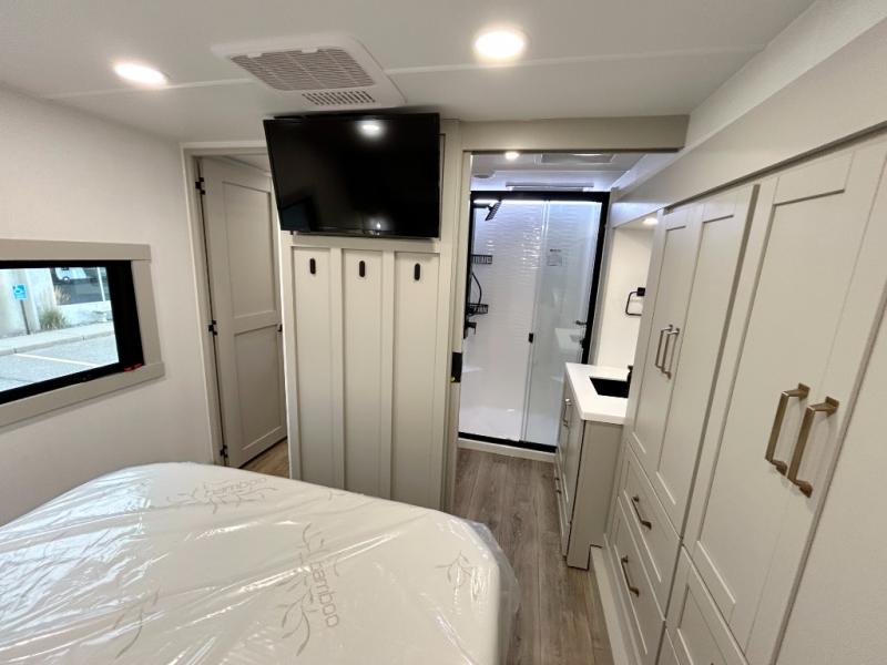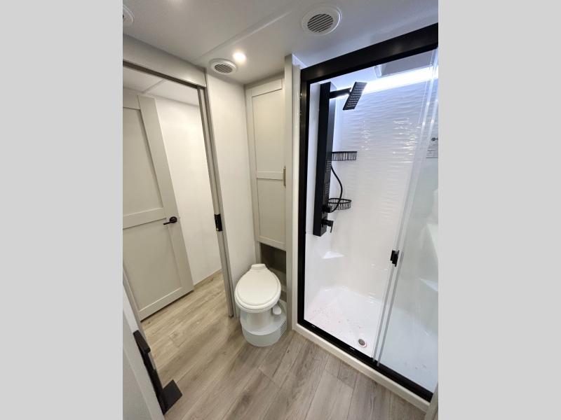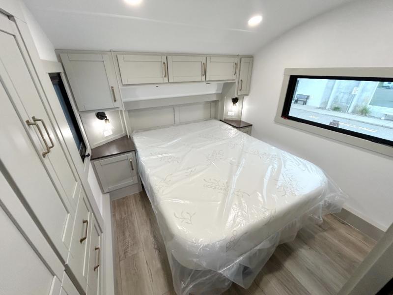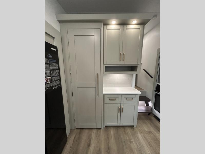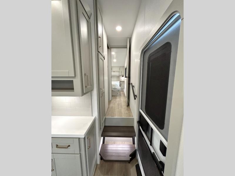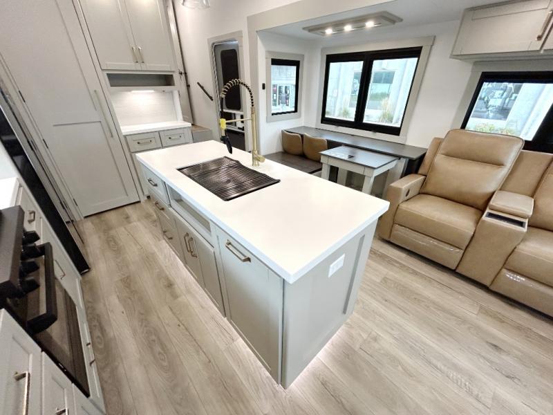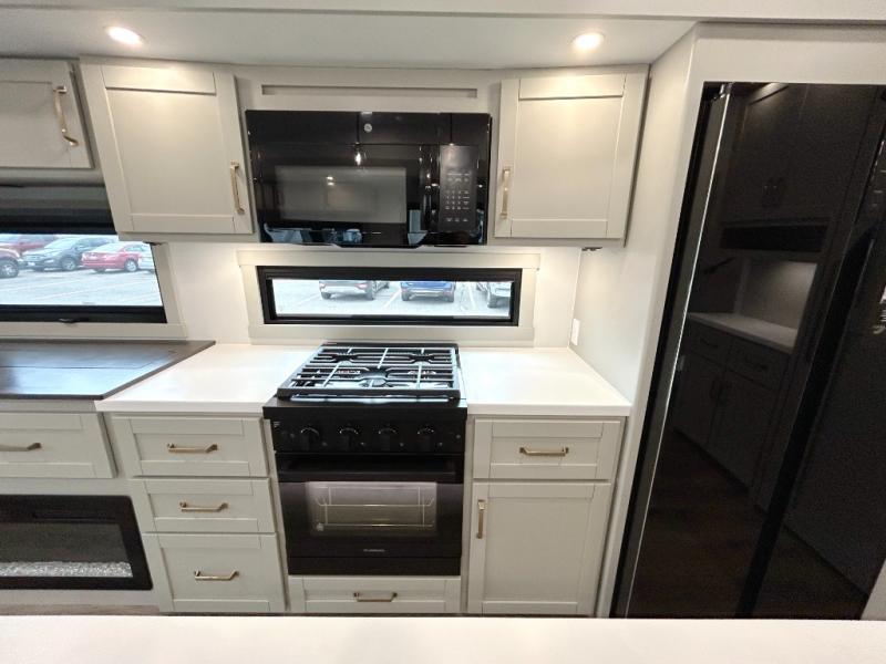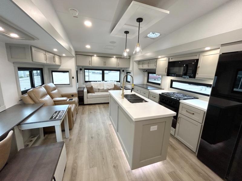 You're going to love every minute spent in this spacious fifth wheel that can sleep four. There is an inviting rear living area with a 72" tri-fold sofa and theater seating across from the televator and fireplace. The chef of your group can whip up dinner on the three burner cooktop or in the 30" residential microwave, and there is a 16 cu. ft. refrigerator that even opens when with the slide out is in. You will also enjoy the kitchen island with a farmhouse sink and roller cover, dual trash bins with a Stow N' Go paper towel holder, plus convenient dog bowls for your furry friends. You can store all your paper goods and snacks in the 84" pantry with adjustable shelving, and there is a hutch for nice dishes plus shoe storage in this model as well. Head to the front master bedroom where you'll find a queen bed with a TV, a large slide out with a wardrobe with drawers, plus a spacious bath.