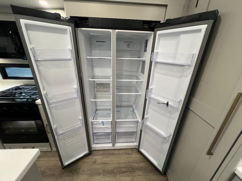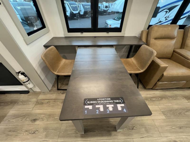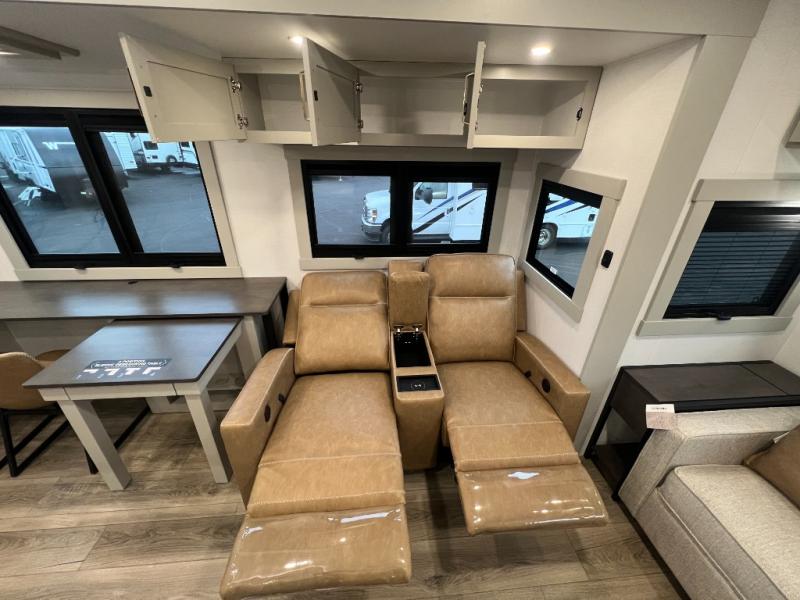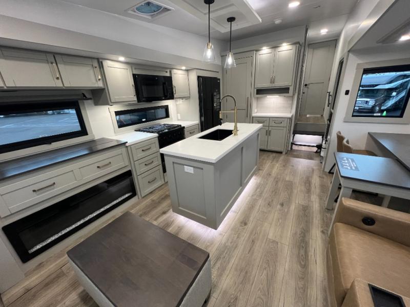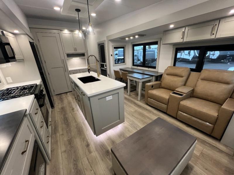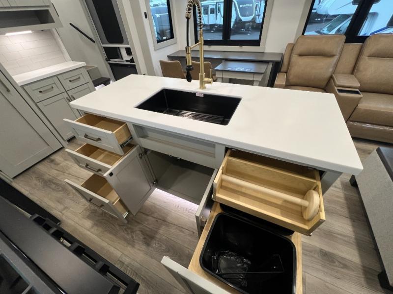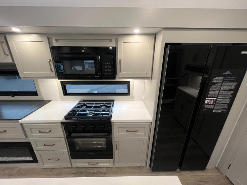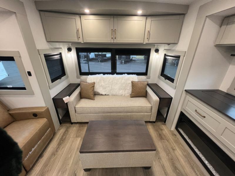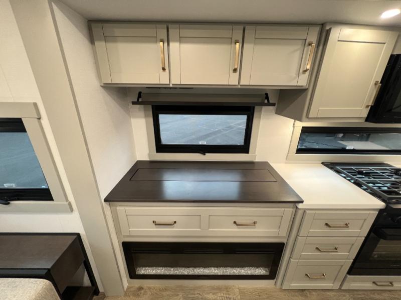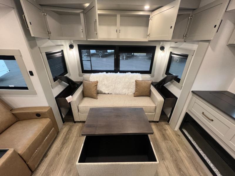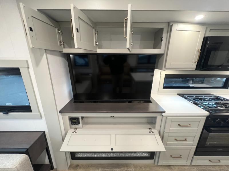 You're going to love every minute spent in this spacious fifth wheel that can sleep four. There is an inviting rear living area with a 72" tri-fold sofa and theater seating across from the televator and fireplace. The chef of your group can whip up dinner on the three burner cooktop or in the 30" residential microwave, and there is a 16 cu. ft. refrigerator that even opens when with the slide out is in. You will also enjoy the kitchen island with a farmhouse sink and roller cover, dual trash bins with a Stow N' Go paper towel holder, plus convenient dog bowls for your furry friends. You can store all your paper goods and snacks in the 84" pantry with adjustable shelving, and there is a hutch for nice dishes plus shoe storage in this model as well. Head to the front master bedroom where you'll find a queen bed with a TV, a large slide out with a wardrobe with drawers, plus a spacious bath.