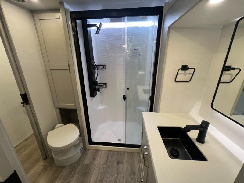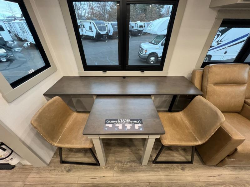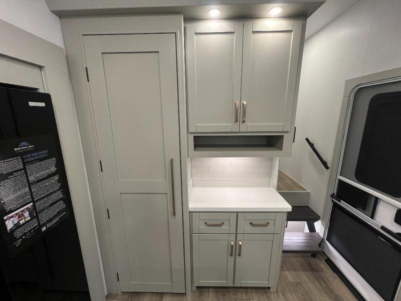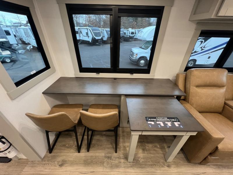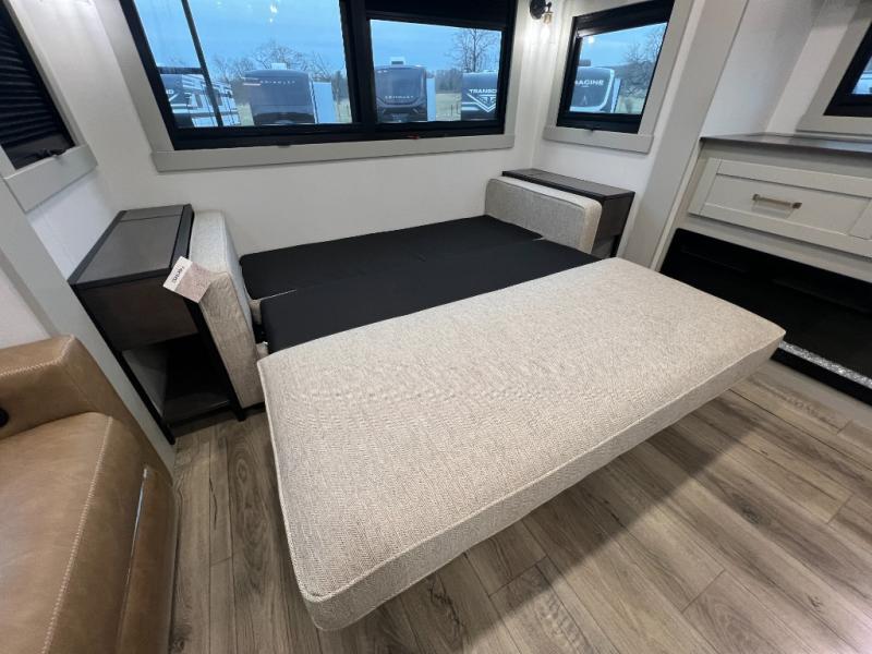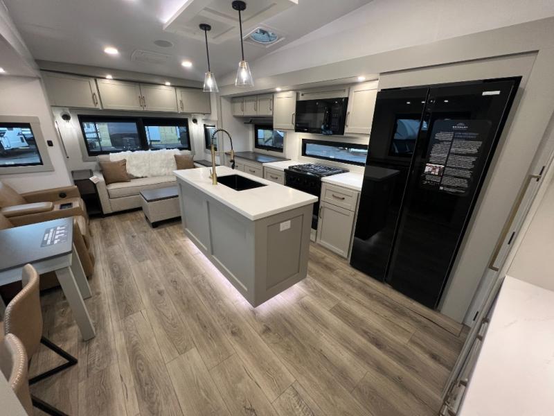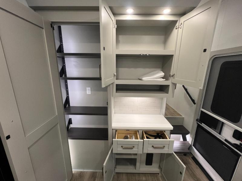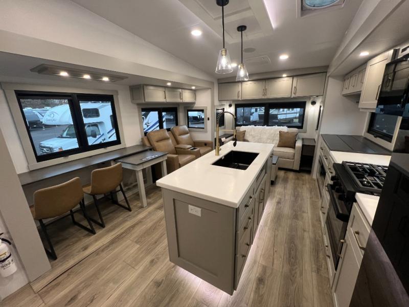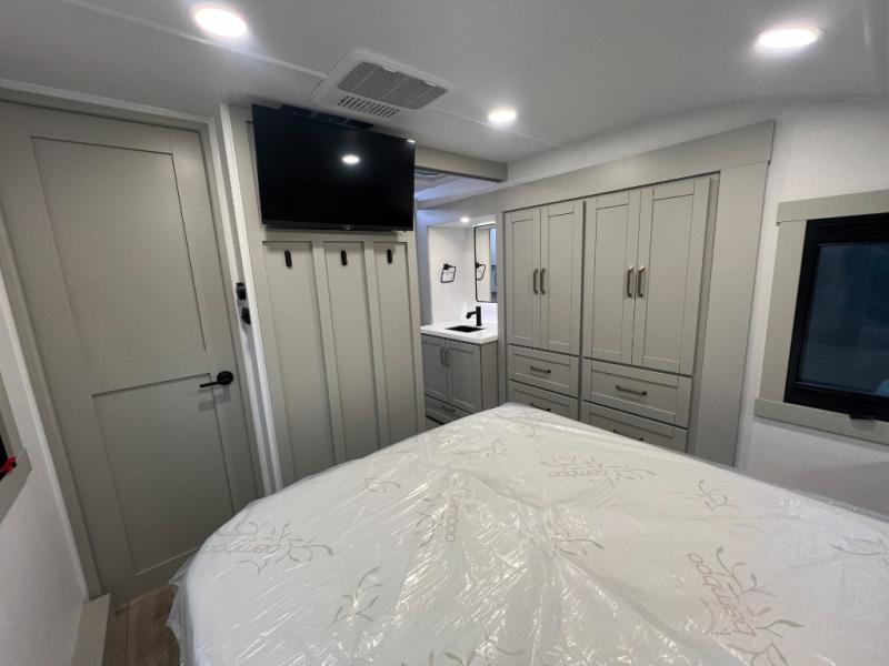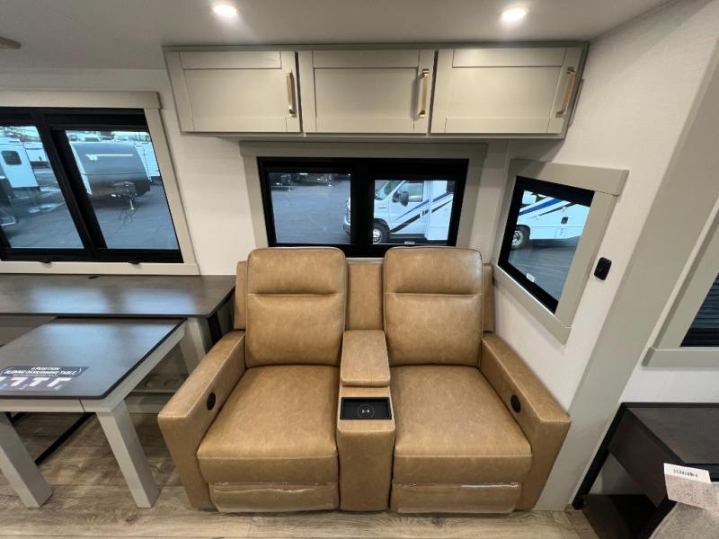 You're going to love every minute spent in this spacious fifth wheel that can sleep four. There is an inviting rear living area with a 72" tri-fold sofa and theater seating across from the televator and fireplace. The chef of your group can whip up dinner on the three burner cooktop or in the 30" residential microwave, and there is a 16 cu. ft. refrigerator that even opens when with the slide out is in. You will also enjoy the kitchen island with a farmhouse sink and roller cover, dual trash bins with a Stow N' Go paper towel holder, plus convenient dog bowls for your furry friends. You can store all your paper goods and snacks in the 84" pantry with adjustable shelving, and there is a hutch for nice dishes plus shoe storage in this model as well. Head to the front master bedroom where you'll find a queen bed with a TV, a large slide out with a wardrobe with drawers, plus a spacious bath.