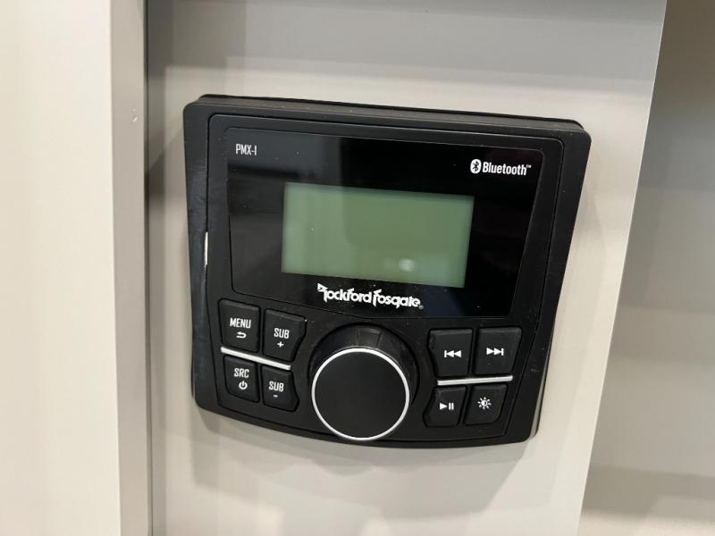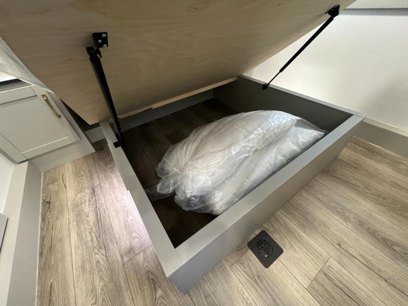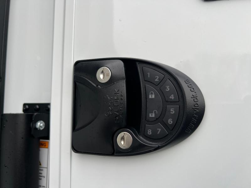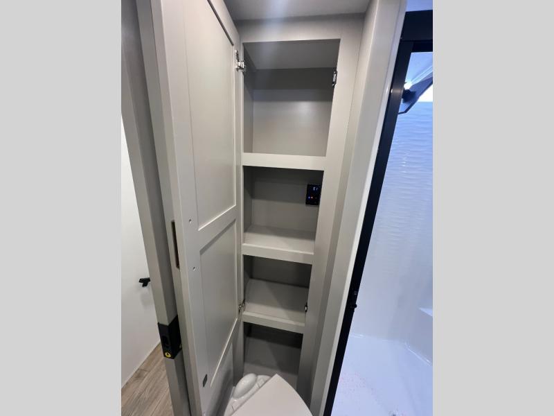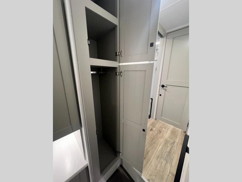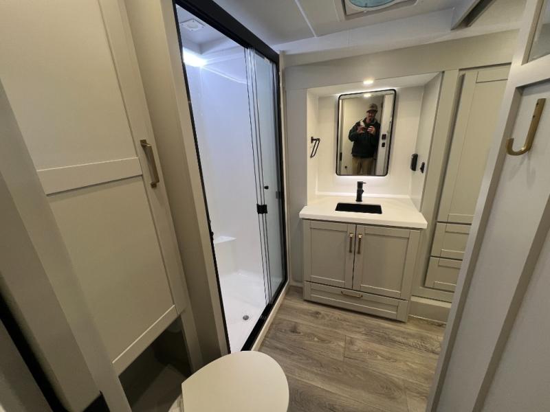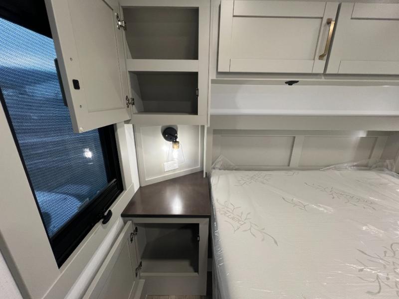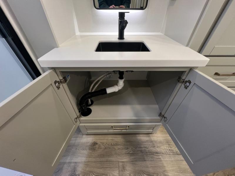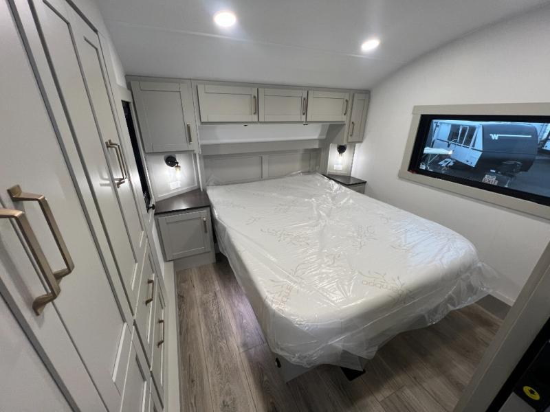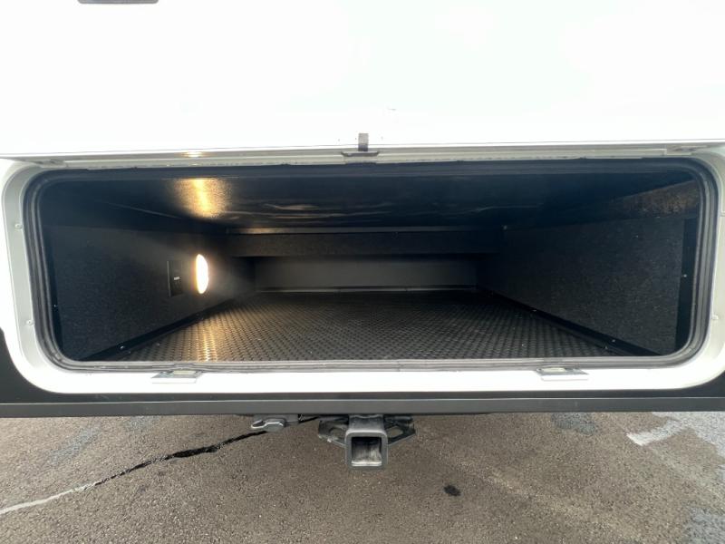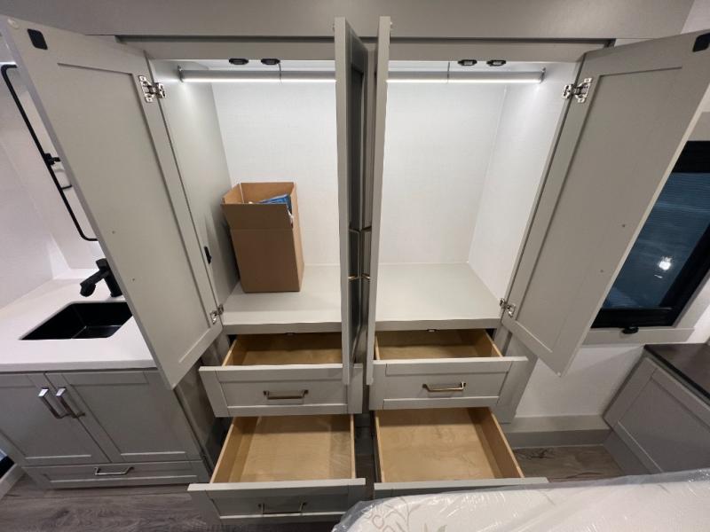You're going to love every minute spent in this spacious fifth wheel that can sleep four. There is an inviting rear living area with a 72" tri-fold sofa and theater seating across from the televator and fireplace. The chef of your group can whip up dinner on the three burner cooktop or in the 30" residential microwave, and there is a 16 cu. ft. refrigerator that even opens when with the slide out is in. You will also enjoy the kitchen island with a farmhouse sink and roller cover, dual trash bins with a Stow N' Go paper towel holder, plus convenient dog bowls for your furry friends. You can store all your paper goods and snacks in the 84" pantry with adjustable shelving, and there is a hutch for nice dishes plus shoe storage in this model as well. Head to the front master bedroom where you'll find a queen bed with a TV, a large slide out with a wardrobe with drawers, plus a spacious bath.