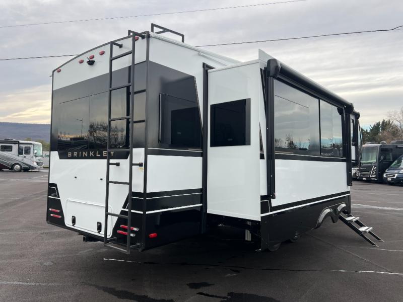 The Brinkley mid-profile Model Z fifth wheels bring you clean lines and an upscale look with plenty of style and exciting new features like the industry first brass plumbing connections. These units also feature an automotive grade front cap, plenty of exterior storage, dual exterior hot and cold showers, and wide stance leveling jacks for easy set up. Residential frameless windows provide a clean look and beautiful views, and ample electrical outlets and USB/USB-C outlets allow all of your electronics and appliances to easily be used and charged.