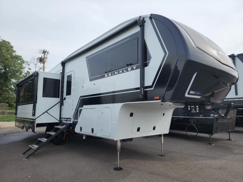 The Brinkley mid-profile Model Z fifth wheels bring you clean lines and an upscale look with plenty of style and exciting new features like the industry first brass plumbing connections. These units also feature an automotive grade front cap, plenty of exterior storage, dual exterior hot and cold showers, and wide stance leveling jacks for easy set up. Residential frameless windows provide a clean look and beautiful views, and ample electrical outlets and USB/USB-C outlets allow all of your electronics and appliances to easily be used and charged.