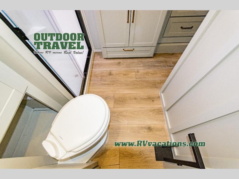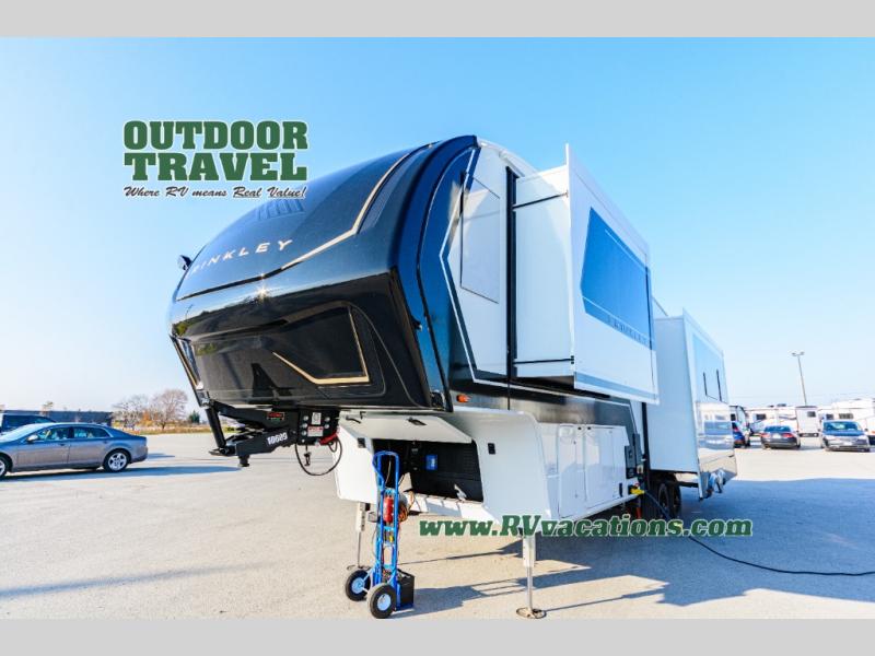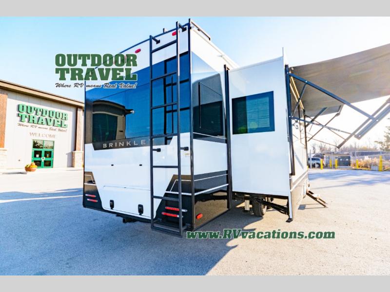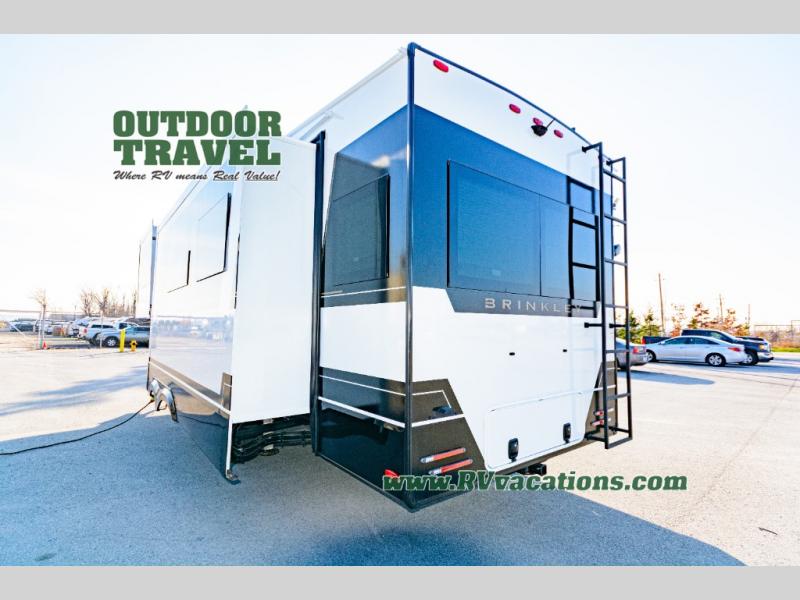 The Brinkley mid-profile Model Z fifth wheels bring you clean lines and an upscale look with plenty of style and exciting new features like the industry first brass plumbing connections. These units also feature an automotive grade front cap, plenty of exterior storage, dual exterior hot and cold showers, and wide stance leveling jacks for easy set up. Residential frameless windows provide a clean look and beautiful views, and ample electrical outlets and USB/USB-C outlets allow all of your electronics and appliances to easily be used and charged.