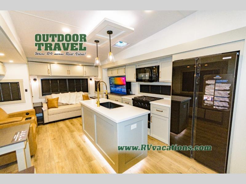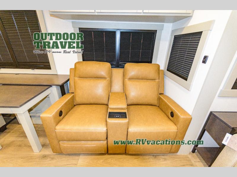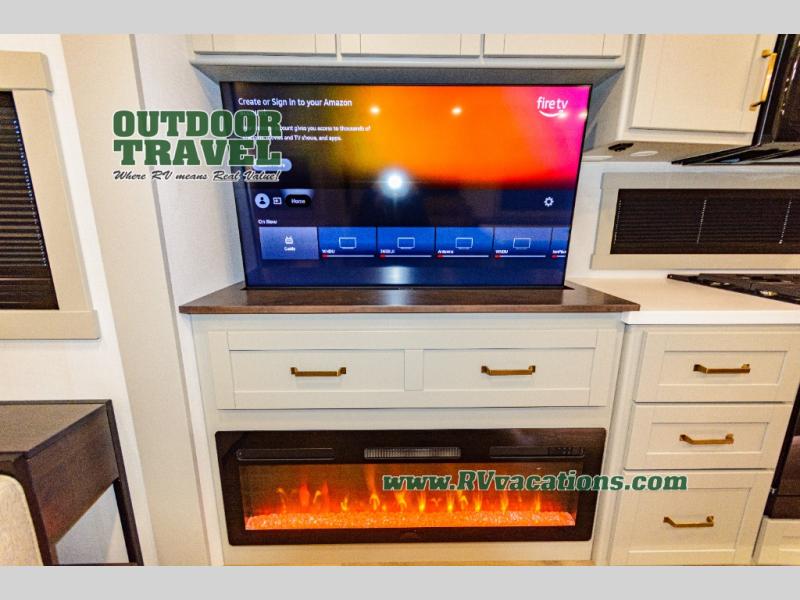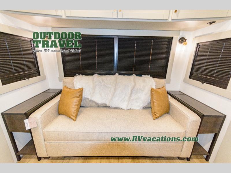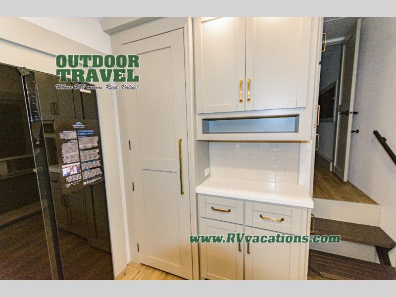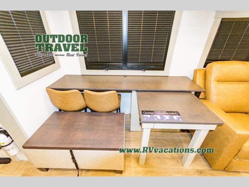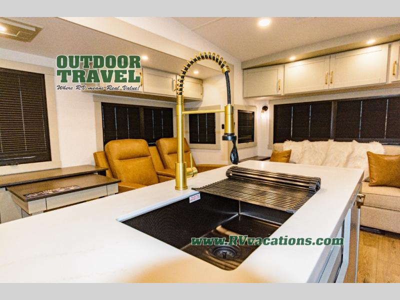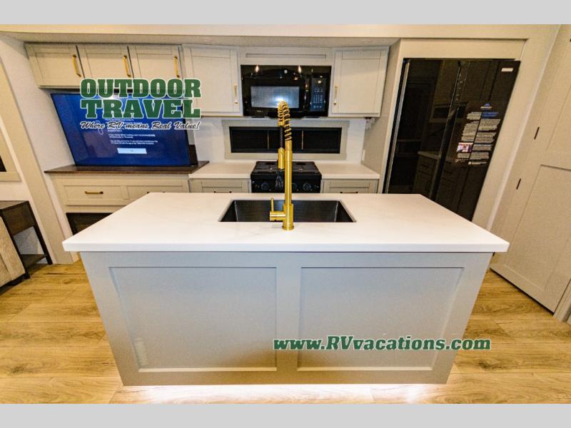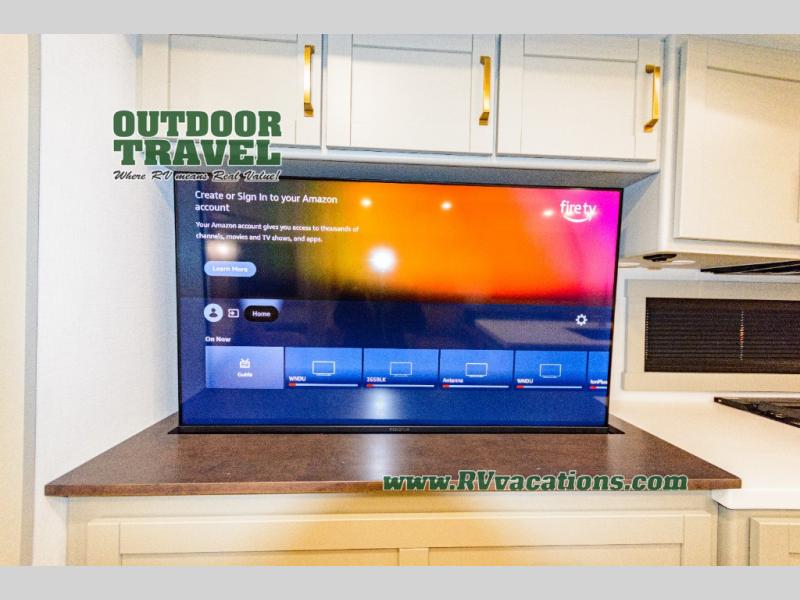 You're going to love every minute spent in this spacious fifth wheel that can sleep four. There is an inviting rear living area with a 72" tri-fold sofa and theater seating across from the televator and fireplace. The chef of your group can whip up dinner on the three burner cooktop or in the 30" residential microwave, and there is a 16 cu. ft. refrigerator that even opens when with the slide out is in. You will also enjoy the kitchen island with a farmhouse sink and roller cover, dual trash bins with a Stow N' Go paper towel holder, plus convenient dog bowls for your furry friends. You can store all your paper goods and snacks in the 84" pantry with adjustable shelving, and there is a hutch for nice dishes plus shoe storage in this model as well. Head to the front master bedroom where you'll find a queen bed with a TV, a large slide out with a wardrobe with drawers, plus a spacious bath.