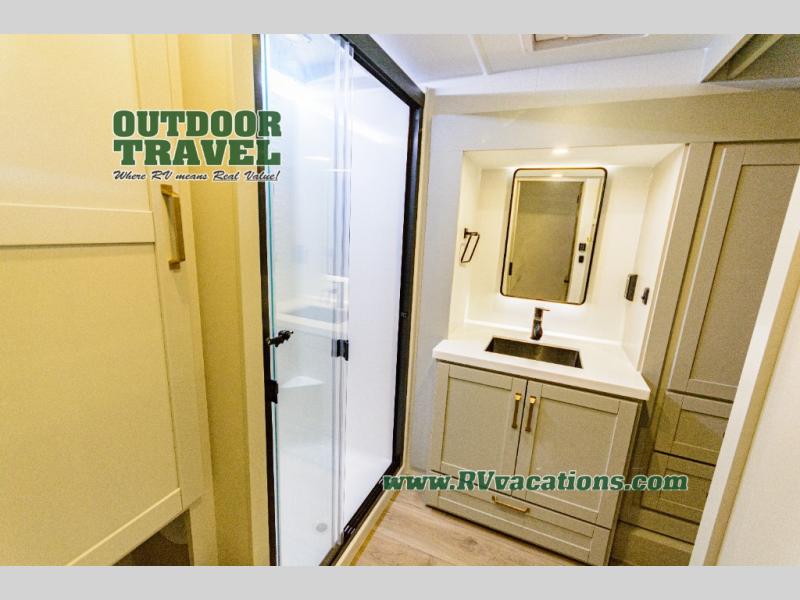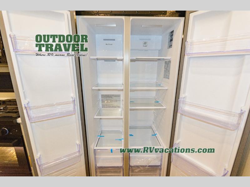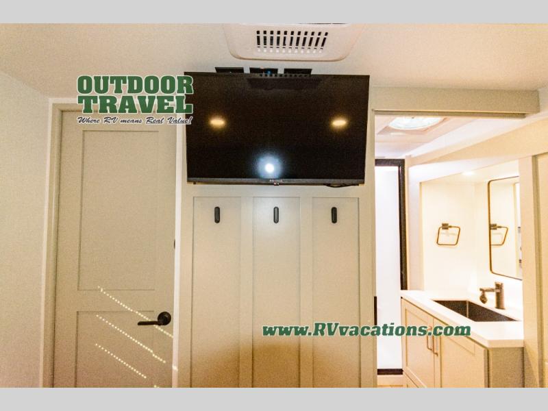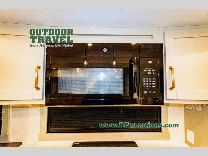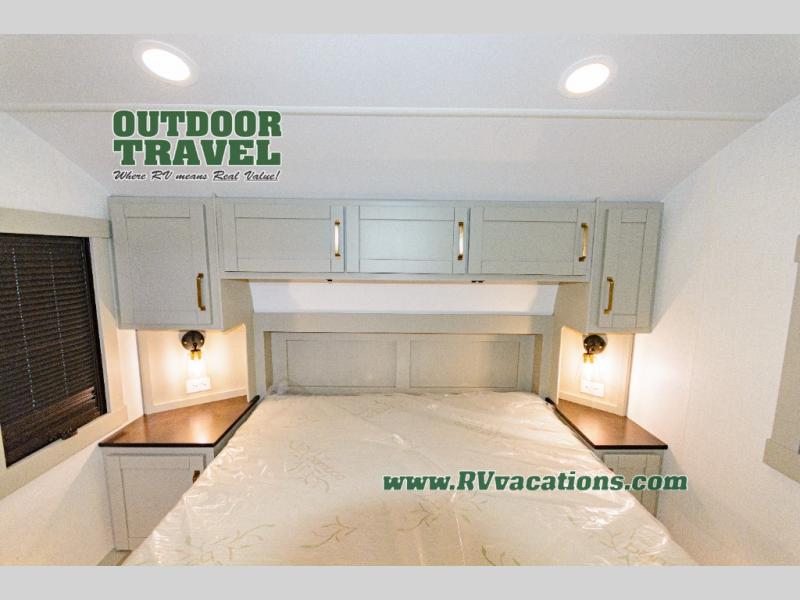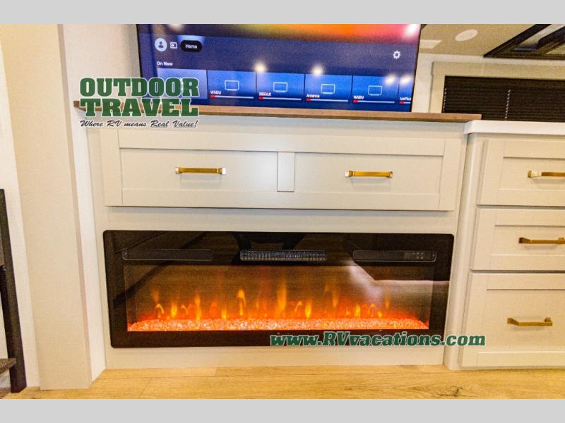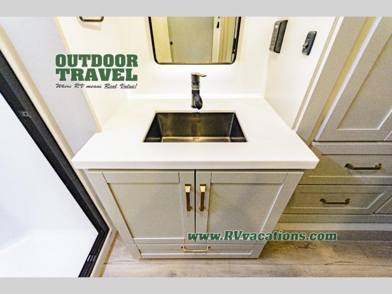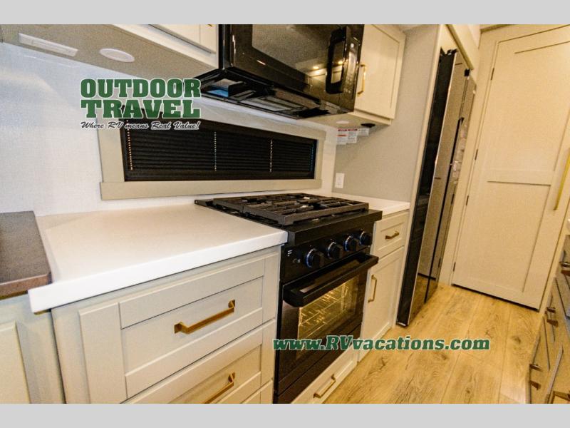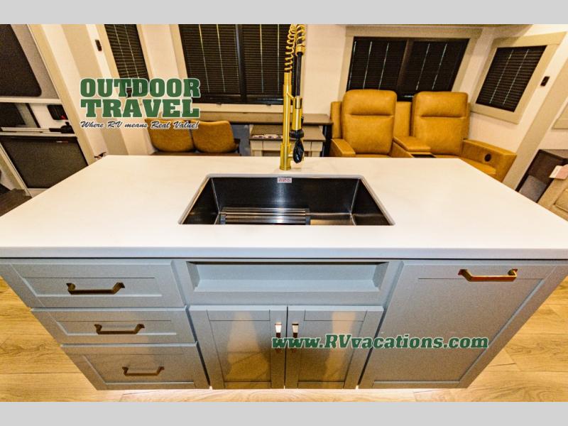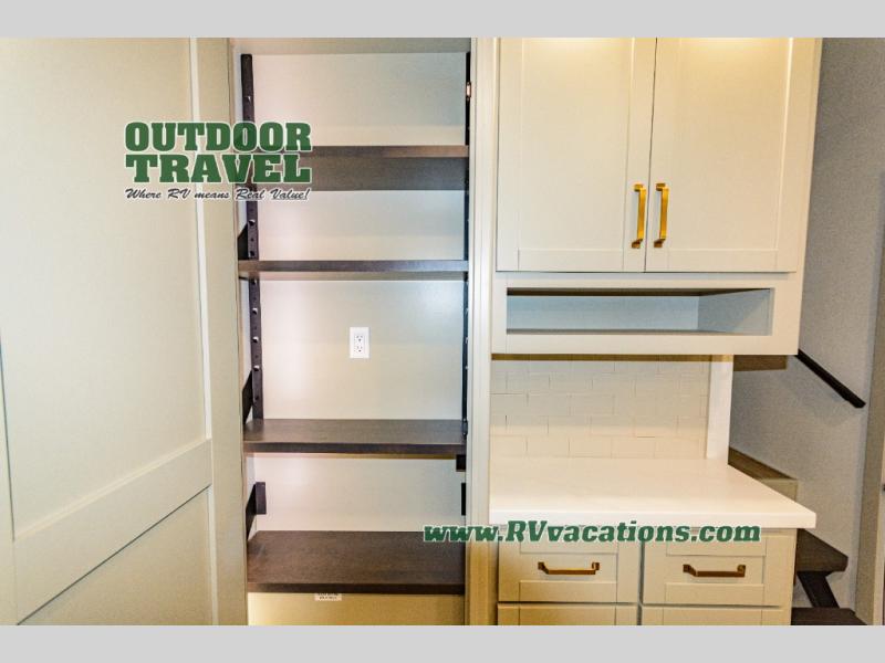You're going to love every minute spent in this spacious fifth wheel that can sleep four. There is an inviting rear living area with a 72" tri-fold sofa and theater seating across from the televator and fireplace. The chef of your group can whip up dinner on the three burner cooktop or in the 30" residential microwave, and there is a 16 cu. ft. refrigerator that even opens when with the slide out is in. You will also enjoy the kitchen island with a farmhouse sink and roller cover, dual trash bins with a Stow N' Go paper towel holder, plus convenient dog bowls for your furry friends. You can store all your paper goods and snacks in the 84" pantry with adjustable shelving, and there is a hutch for nice dishes plus shoe storage in this model as well. Head to the front master bedroom where you'll find a queen bed with a TV, a large slide out with a wardrobe with drawers, plus a spacious bath.