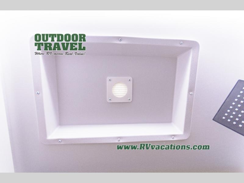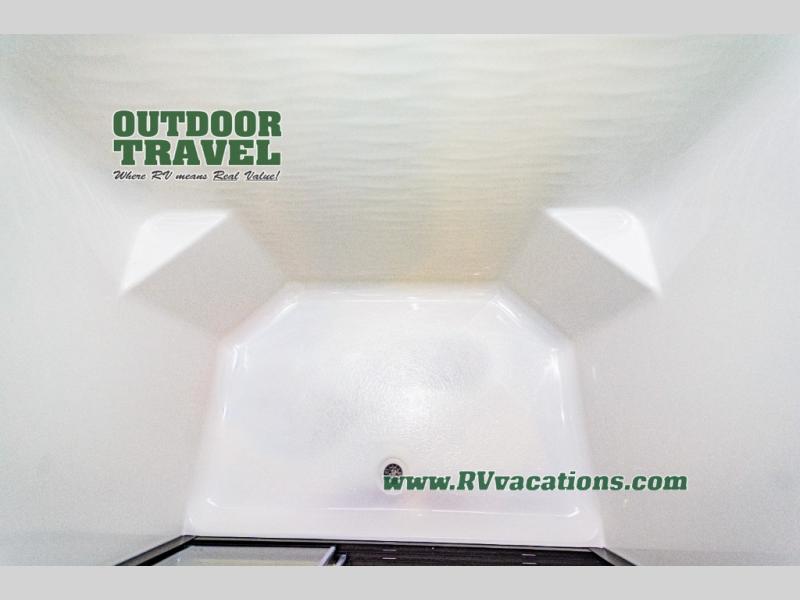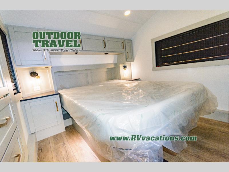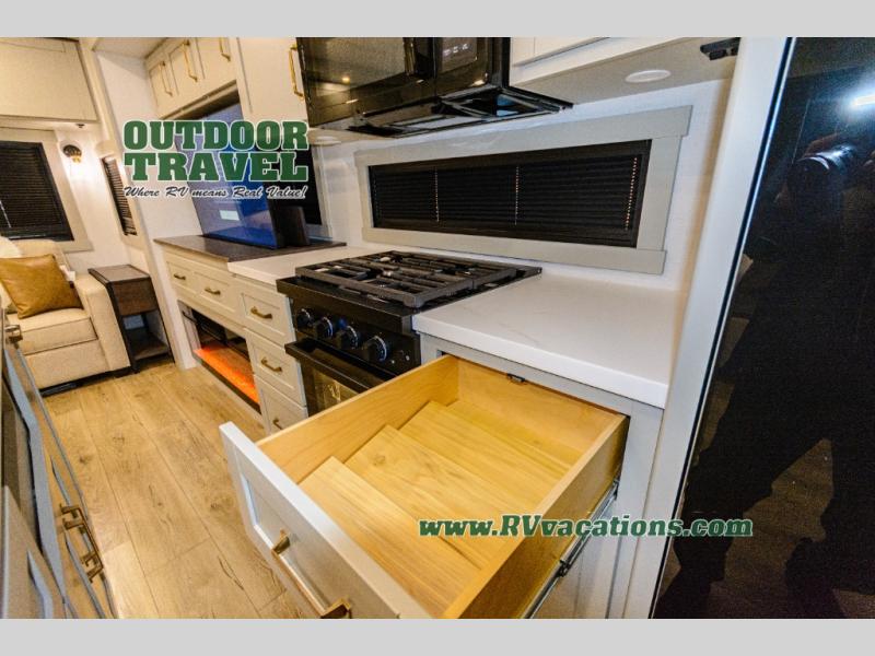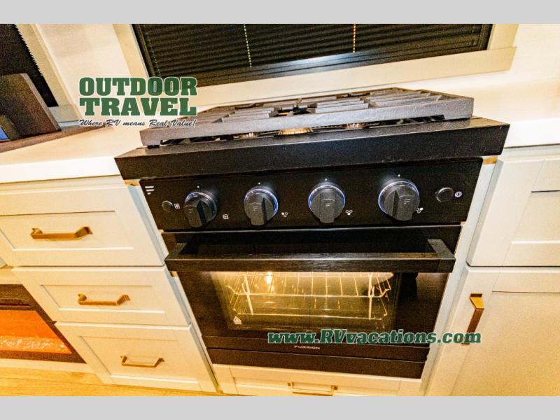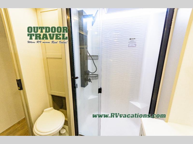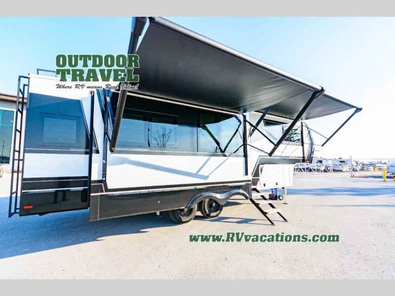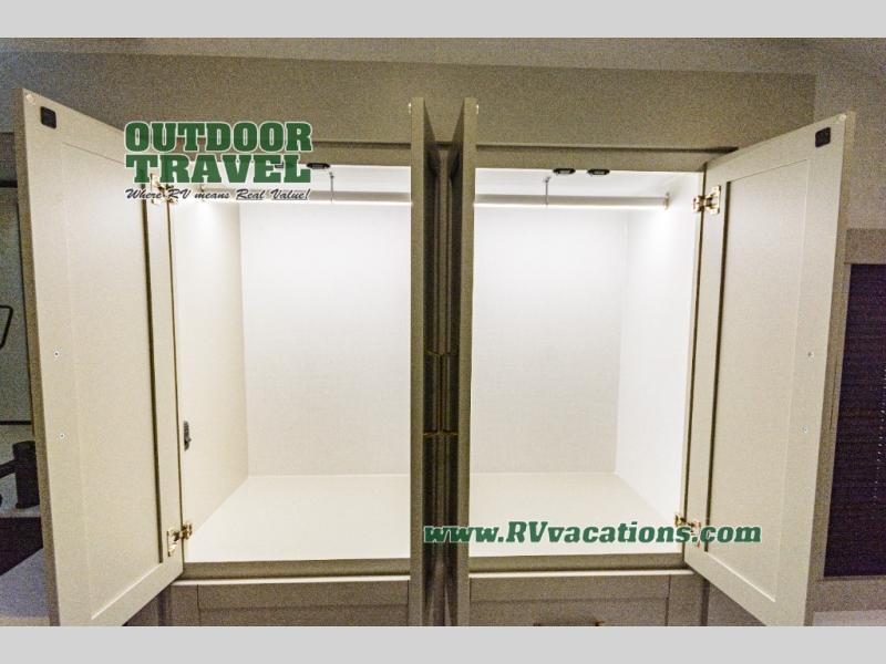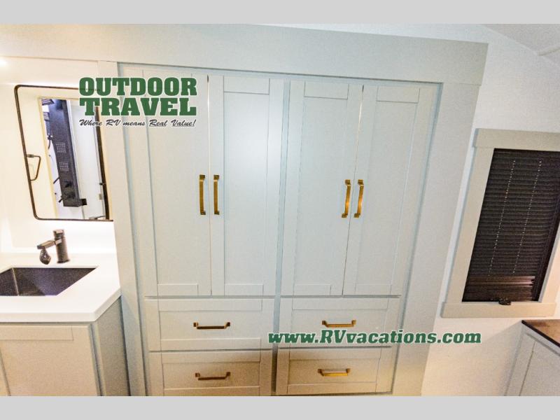 You're going to love every minute spent in this spacious fifth wheel that can sleep four. There is an inviting rear living area with a 72" tri-fold sofa and theater seating across from the televator and fireplace. The chef of your group can whip up dinner on the three burner cooktop or in the 30" residential microwave, and there is a 16 cu. ft. refrigerator that even opens when with the slide out is in. You will also enjoy the kitchen island with a farmhouse sink and roller cover, dual trash bins with a Stow N' Go paper towel holder, plus convenient dog bowls for your furry friends. You can store all your paper goods and snacks in the 84" pantry with adjustable shelving, and there is a hutch for nice dishes plus shoe storage in this model as well. Head to the front master bedroom where you'll find a queen bed with a TV, a large slide out with a wardrobe with drawers, plus a spacious bath.