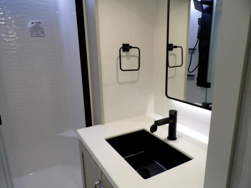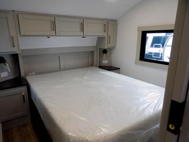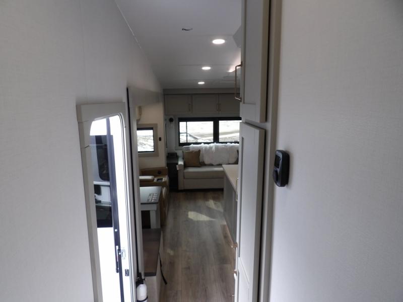 You're going to love every minute spent in this spacious fifth wheel that can sleep four. There is an inviting rear living area with a 72" tri-fold sofa and theater seating across from the televator and fireplace. The chef of your group can whip up dinner on the three burner cooktop or in the 30" residential microwave, and there is a 16 cu. ft. refrigerator that even opens when with the slide out is in. You will also enjoy the kitchen island with a farmhouse sink and roller cover, dual trash bins with a Stow N' Go paper towel holder, plus convenient dog bowls for your furry friends. You can store all your paper goods and snacks in the 84" pantry with adjustable shelving, and there is a hutch for nice dishes plus shoe storage in this model as well. Head to the front master bedroom where you'll find a queen bed with a TV, a large slide out with a wardrobe with drawers, plus a spacious bath.