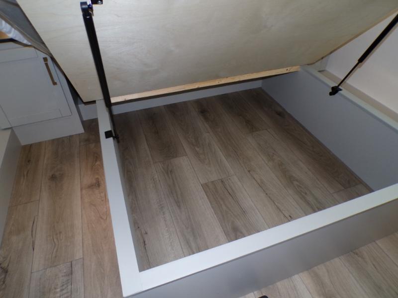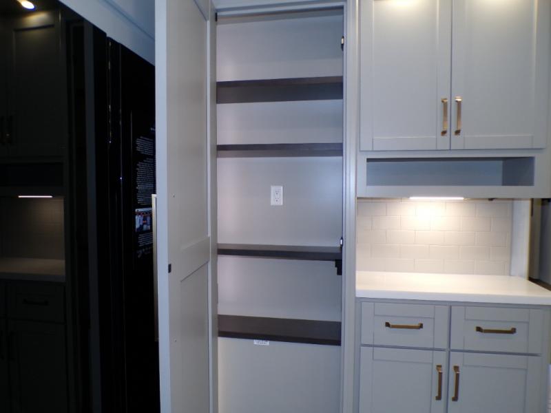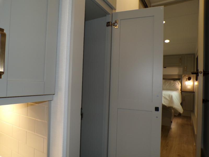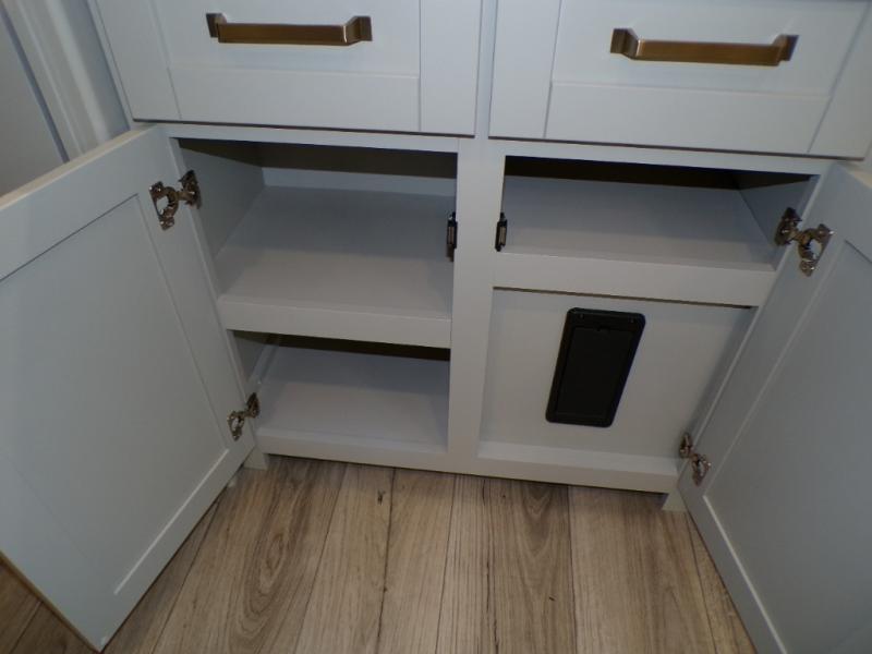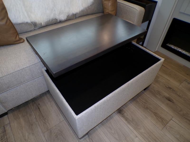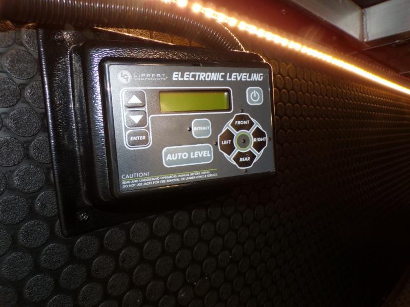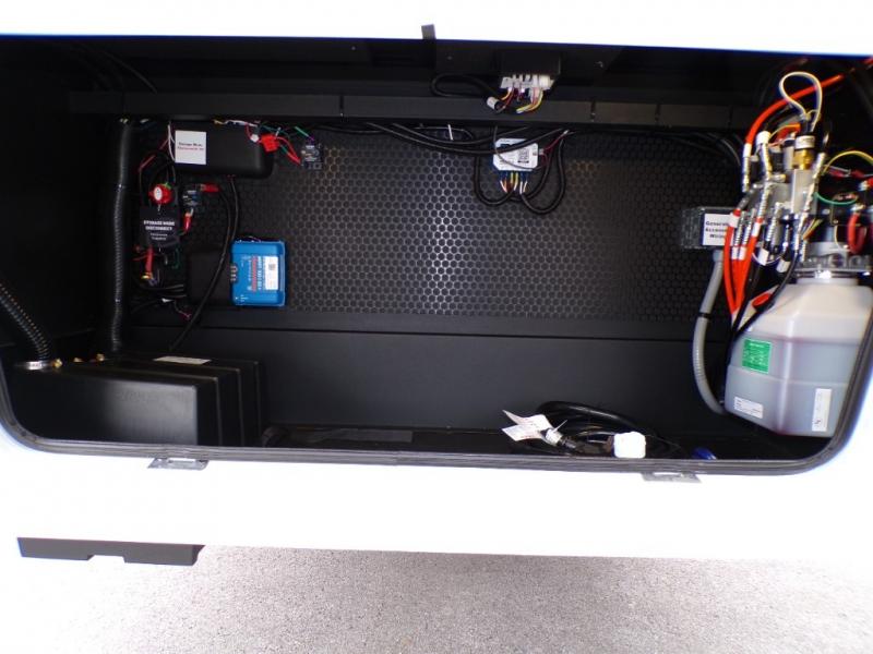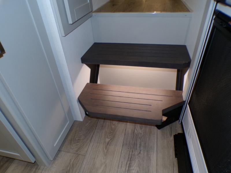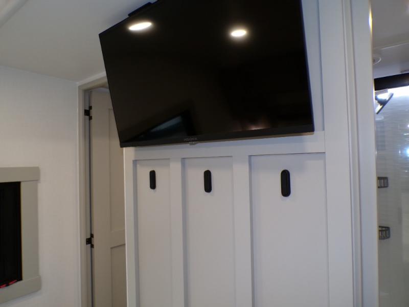 You're going to love every minute spent in this spacious fifth wheel that can sleep four. There is an inviting rear living area with a 72" tri-fold sofa and theater seating across from the televator and fireplace. The chef of your group can whip up dinner on the three burner cooktop or in the 30" residential microwave, and there is a 16 cu. ft. refrigerator that even opens when with the slide out is in. You will also enjoy the kitchen island with a farmhouse sink and roller cover, dual trash bins with a Stow N' Go paper towel holder, plus convenient dog bowls for your furry friends. You can store all your paper goods and snacks in the 84" pantry with adjustable shelving, and there is a hutch for nice dishes plus shoe storage in this model as well. Head to the front master bedroom where you'll find a queen bed with a TV, a large slide out with a wardrobe with drawers, plus a spacious bath.