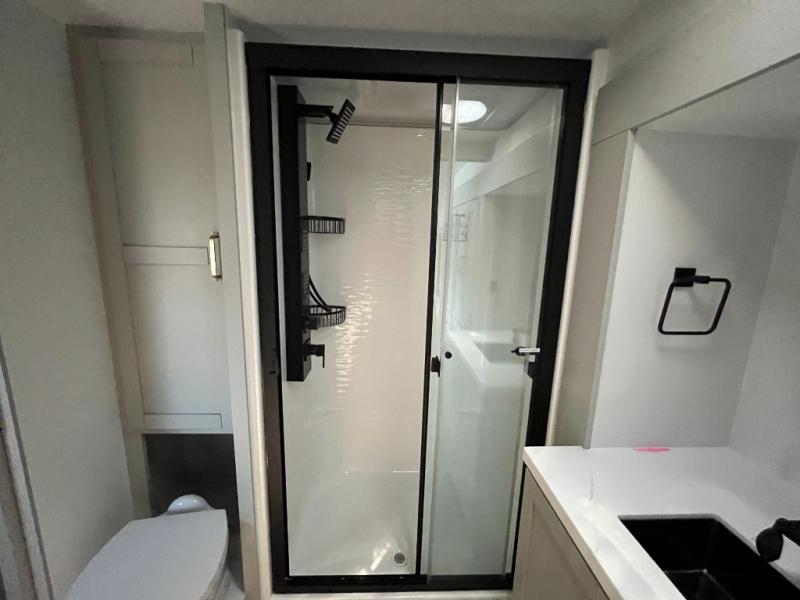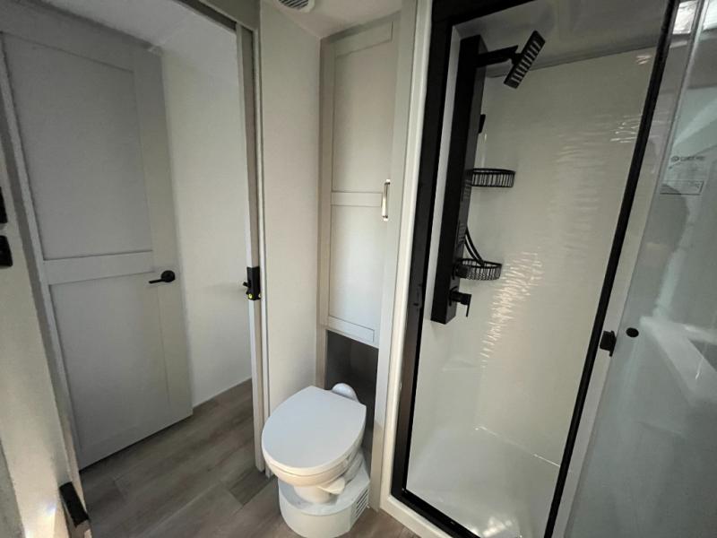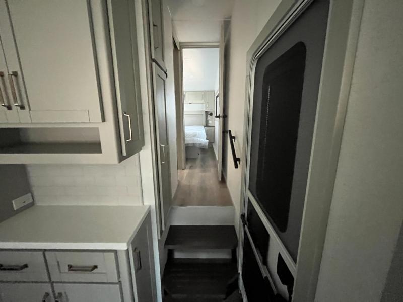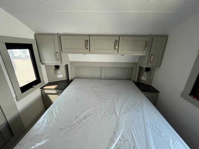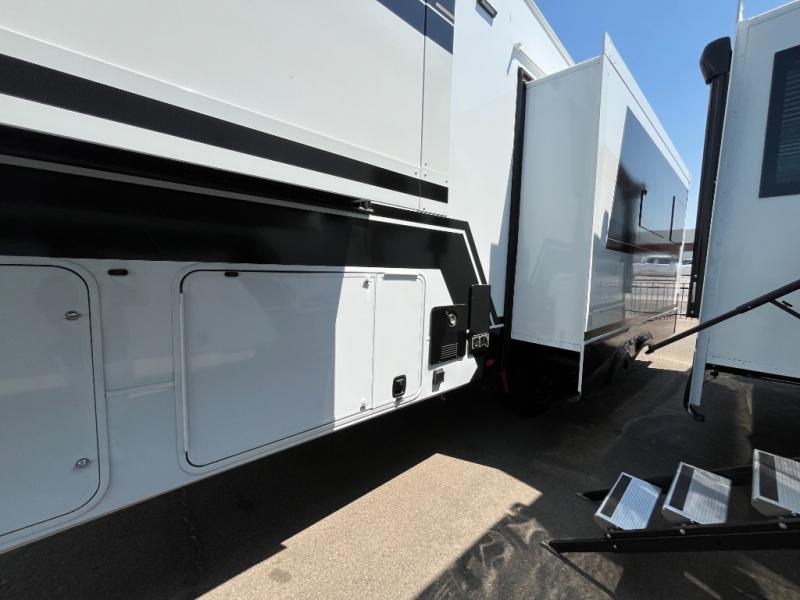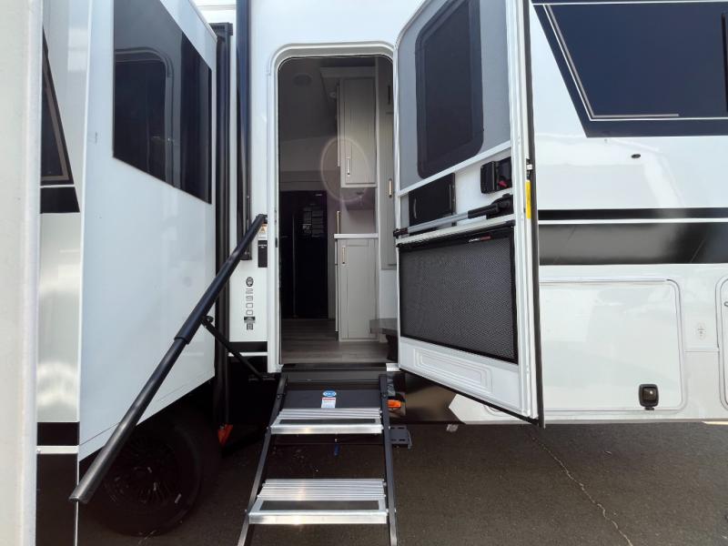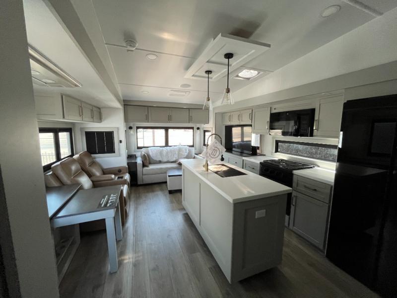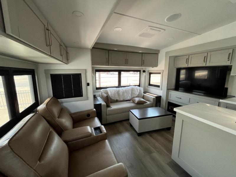You're going to love every minute spent in this spacious fifth wheel that can sleep four. There is an inviting rear living area with a 72" tri-fold sofa and theater seating across from the televator and fireplace. The chef of your group can whip up dinner on the three burner cooktop or in the 30" residential microwave, and there is a 16 cu. ft. refrigerator that even opens when with the slide out is in. You will also enjoy the kitchen island with a farmhouse sink and roller cover, dual trash bins with a Stow N' Go paper towel holder, plus convenient dog bowls for your furry friends. You can store all your paper goods and snacks in the 84" pantry with adjustable shelving, and there is a hutch for nice dishes plus shoe storage in this model as well. Head to the front master bedroom where you'll find a queen bed with a TV, a large slide out with a wardrobe with drawers, plus a spacious bath.