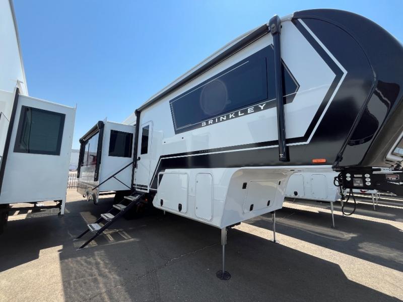 The Brinkley mid-profile Model Z fifth wheels bring you clean lines and an upscale look with plenty of style and exciting new features like the industry first brass plumbing connections. These units also feature an automotive grade front cap, plenty of exterior storage, dual exterior hot and cold showers, and wide stance leveling jacks for easy set up. Residential frameless windows provide a clean look and beautiful views, and ample electrical outlets and USB/USB-C outlets allow all of your electronics and appliances to easily be used and charged.