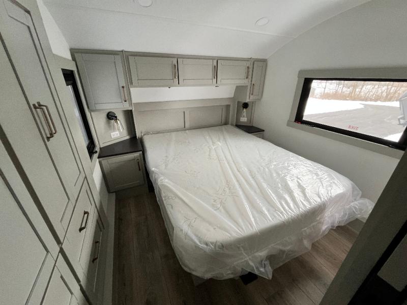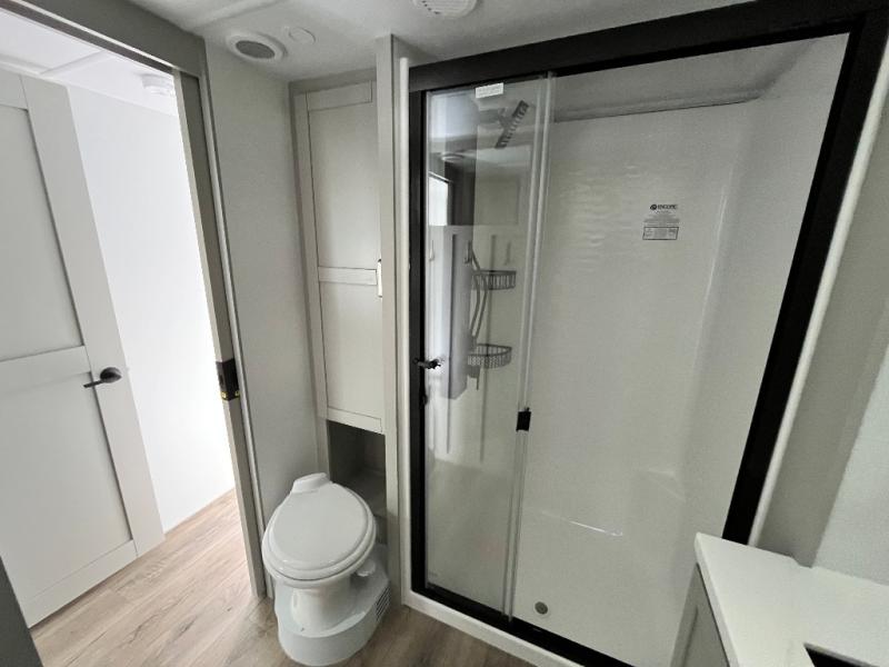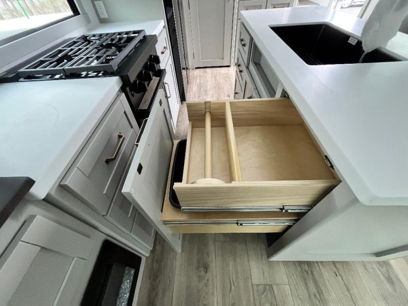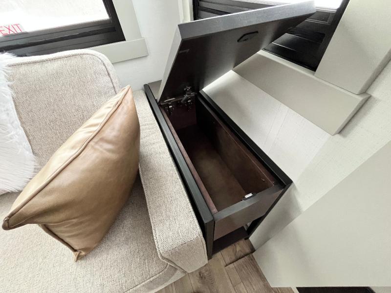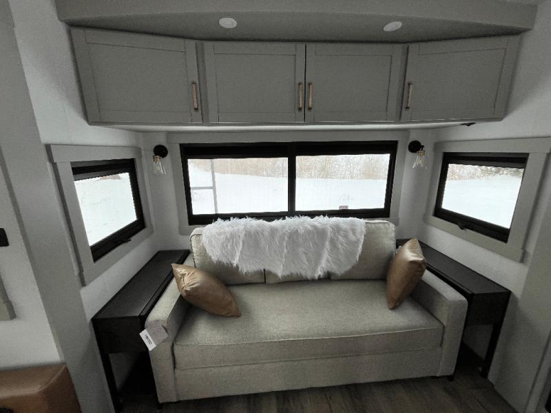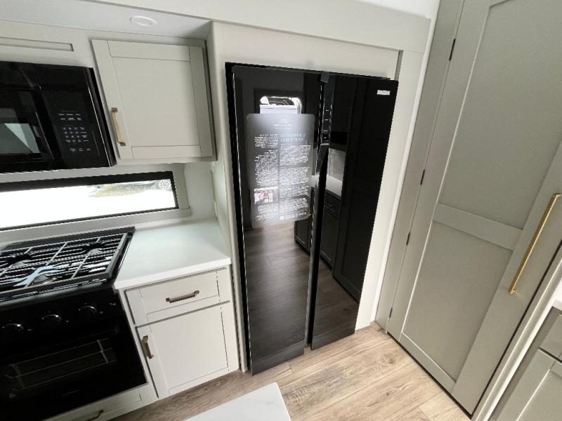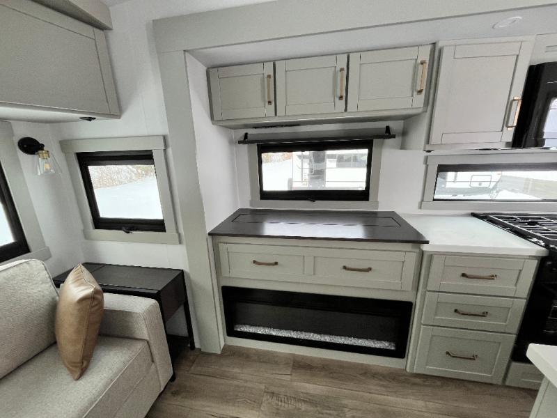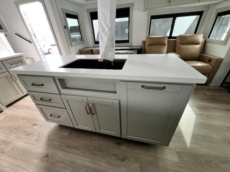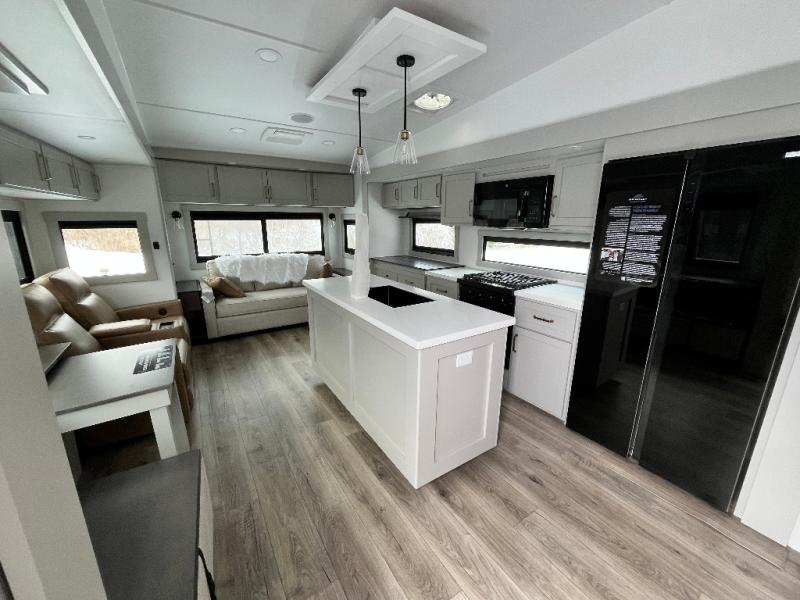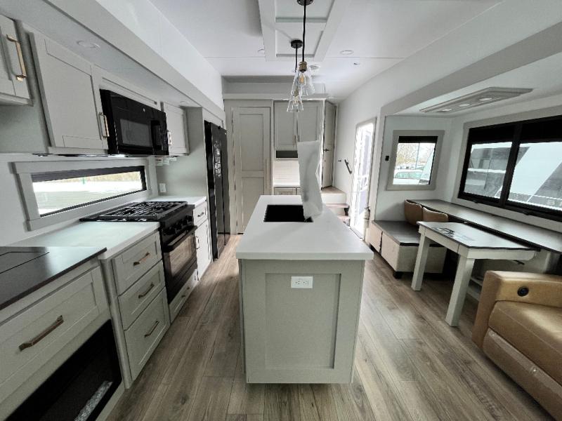 You're going to love every minute spent in this spacious fifth wheel that can sleep four. There is an inviting rear living area with a 72" tri-fold sofa and theater seating across from the televator and fireplace. The chef of your group can whip up dinner on the three burner cooktop or in the 30" residential microwave, and there is a 16 cu. ft. refrigerator that even opens when with the slide out is in. You will also enjoy the kitchen island with a farmhouse sink and roller cover, dual trash bins with a Stow N' Go paper towel holder, plus convenient dog bowls for your furry friends. You can store all your paper goods and snacks in the 84" pantry with adjustable shelving, and there is a hutch for nice dishes plus shoe storage in this model as well. Head to the front master bedroom where you'll find a queen bed with a TV, a large slide out with a wardrobe with drawers, plus a spacious bath.