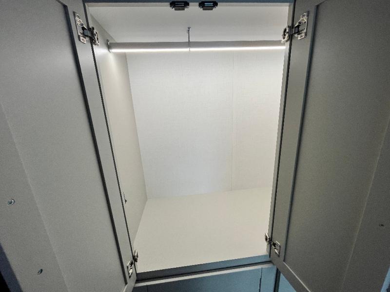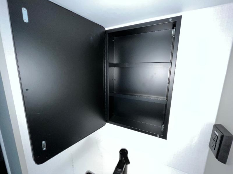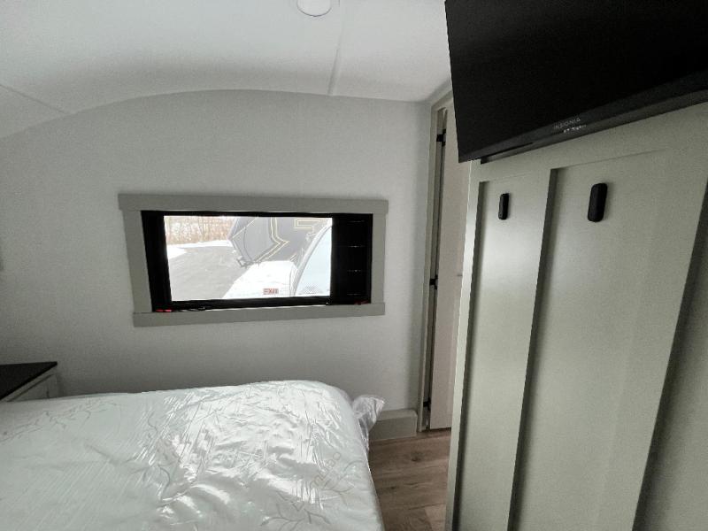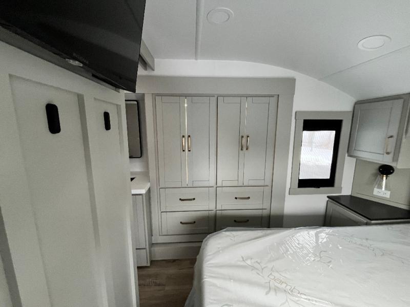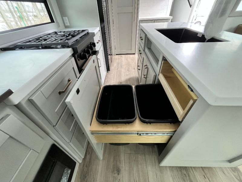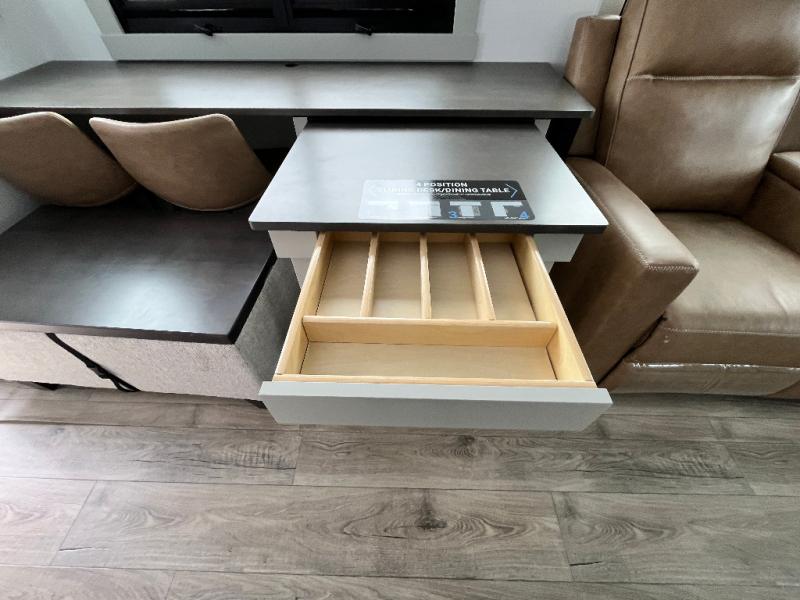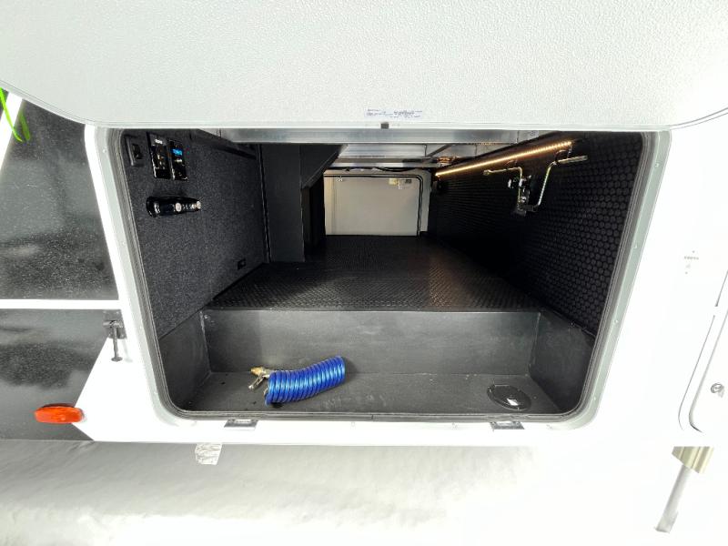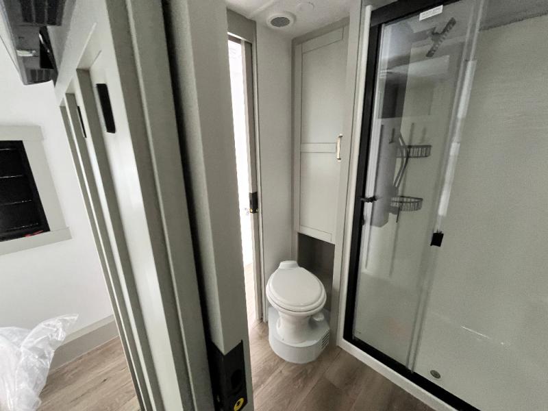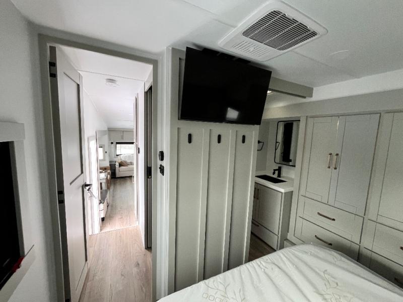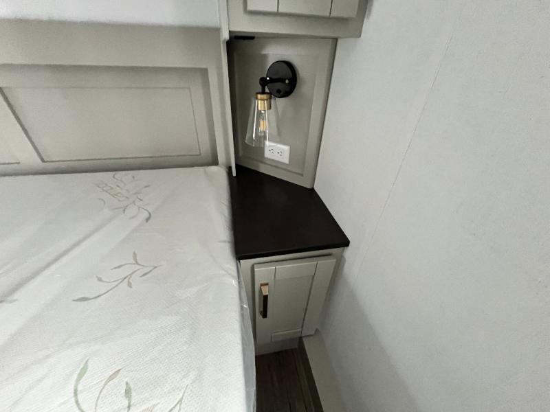 You're going to love every minute spent in this spacious fifth wheel that can sleep four. There is an inviting rear living area with a 72" tri-fold sofa and theater seating across from the televator and fireplace. The chef of your group can whip up dinner on the three burner cooktop or in the 30" residential microwave, and there is a 16 cu. ft. refrigerator that even opens when with the slide out is in. You will also enjoy the kitchen island with a farmhouse sink and roller cover, dual trash bins with a Stow N' Go paper towel holder, plus convenient dog bowls for your furry friends. You can store all your paper goods and snacks in the 84" pantry with adjustable shelving, and there is a hutch for nice dishes plus shoe storage in this model as well. Head to the front master bedroom where you'll find a queen bed with a TV, a large slide out with a wardrobe with drawers, plus a spacious bath.