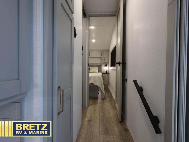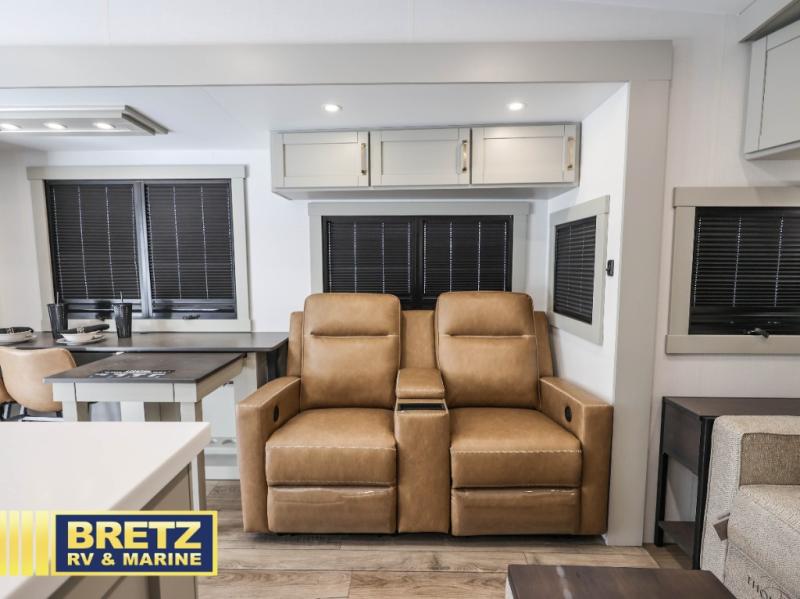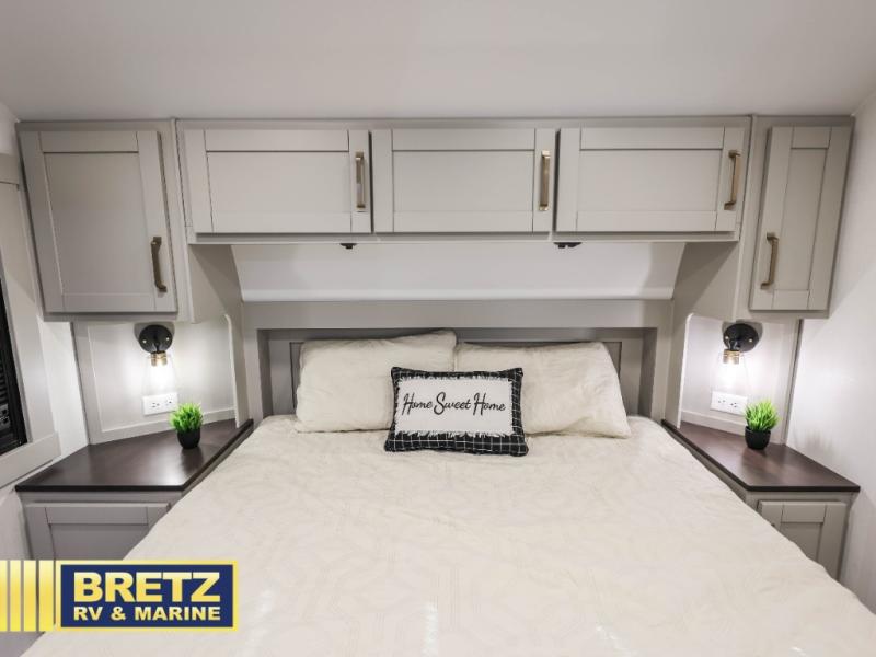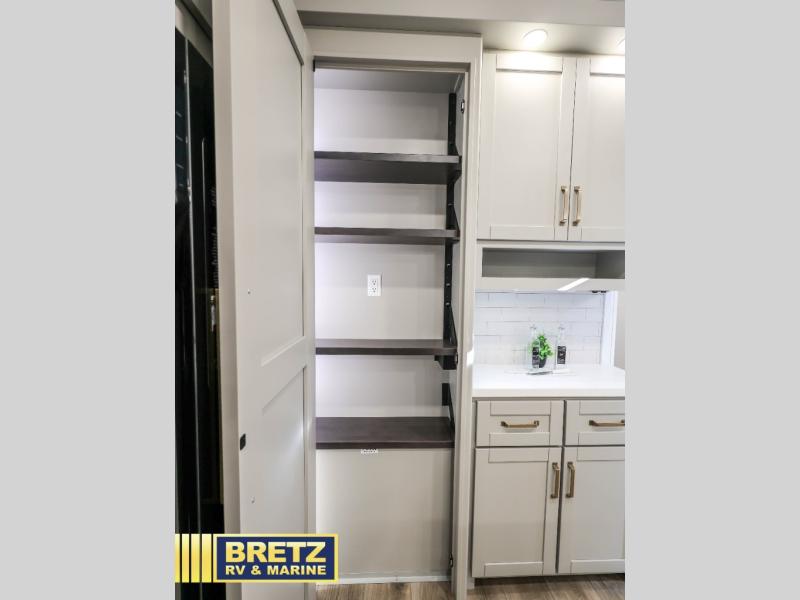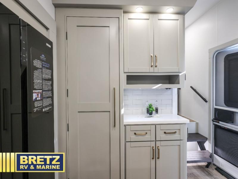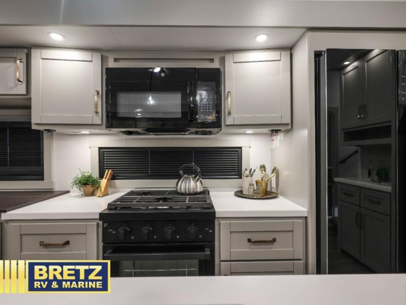 You're going to love every minute spent in this spacious fifth wheel that can sleep four. There is an inviting rear living area with a 72" tri-fold sofa and theater seating across from the televator and fireplace. The chef of your group can whip up dinner on the three burner cooktop or in the 30" residential microwave, and there is a 16 cu. ft. refrigerator that even opens when with the slide out is in. You will also enjoy the kitchen island with a farmhouse sink and roller cover, dual trash bins with a Stow N' Go paper towel holder, plus convenient dog bowls for your furry friends. You can store all your paper goods and snacks in the 84" pantry with adjustable shelving, and there is a hutch for nice dishes plus shoe storage in this model as well. Head to the front master bedroom where you'll find a queen bed with a TV, a large slide out with a wardrobe with drawers, plus a spacious bath.