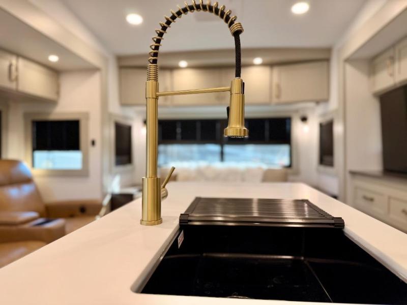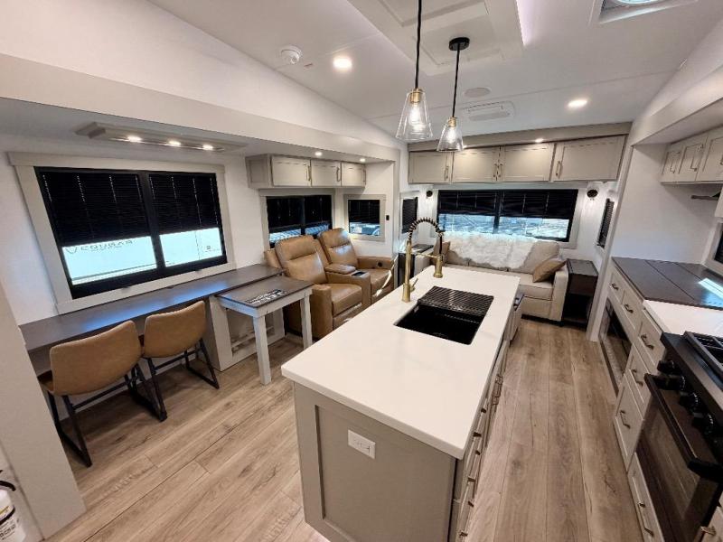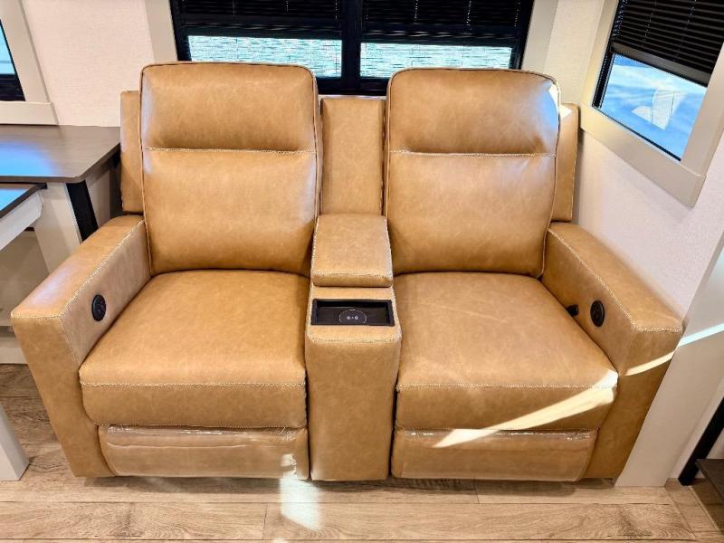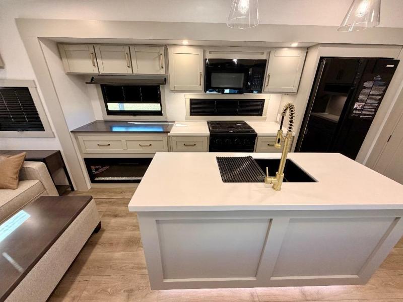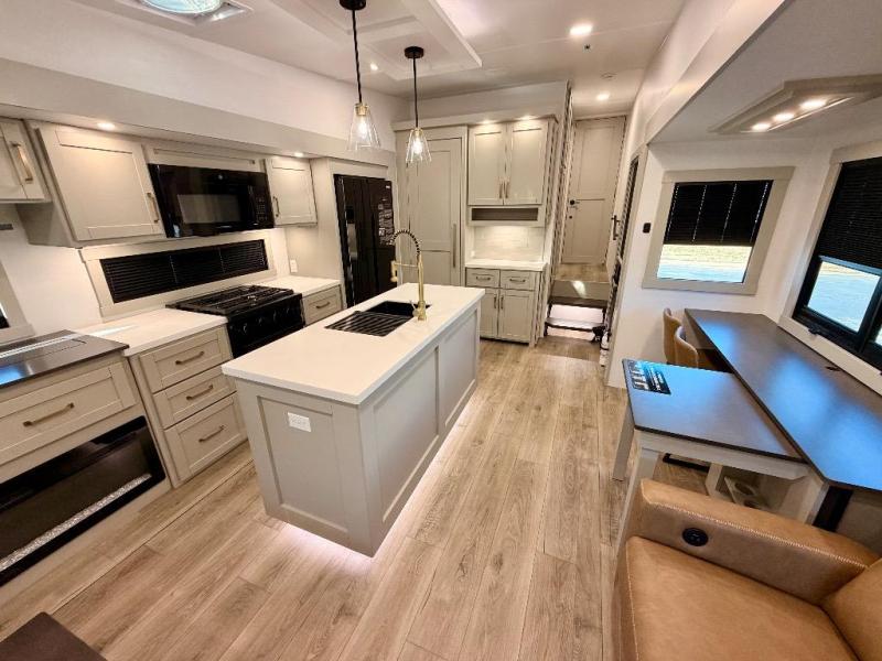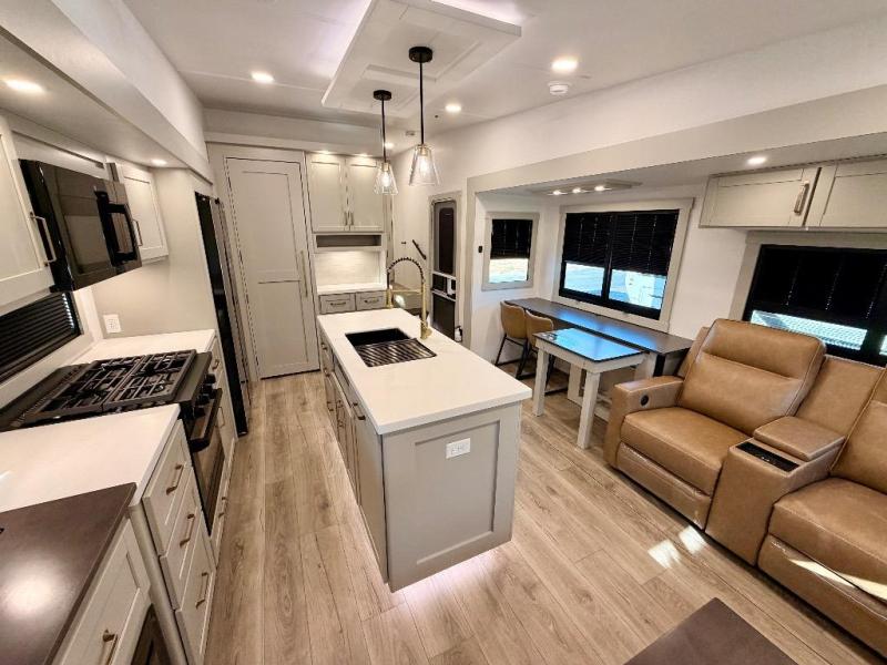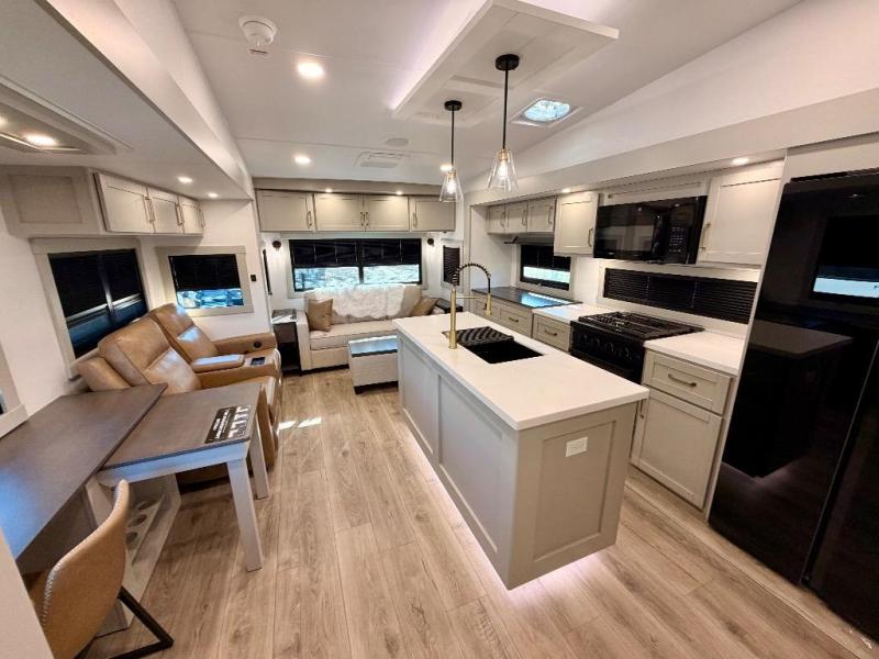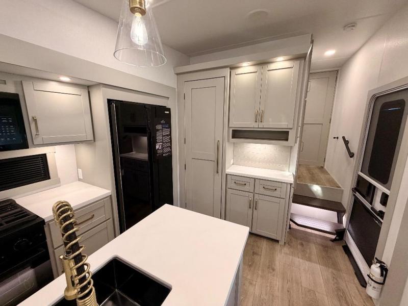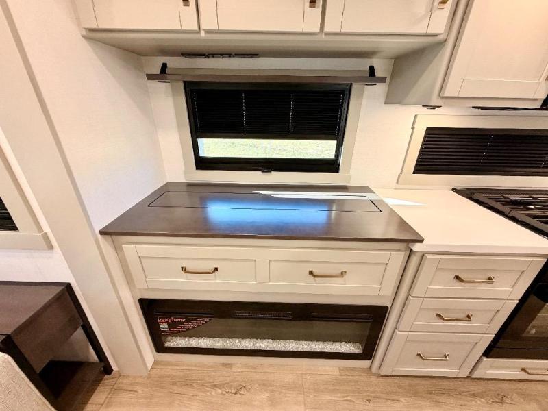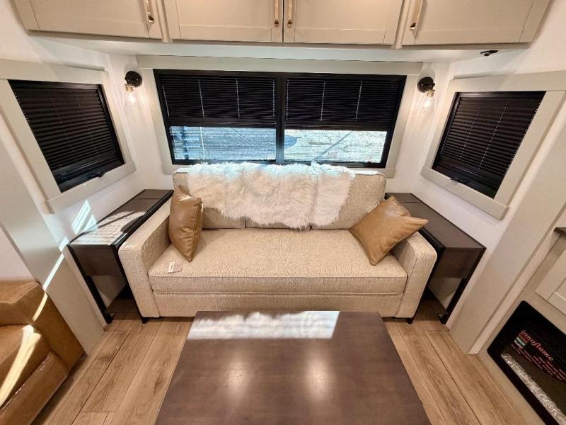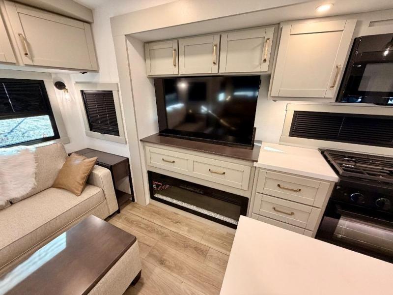 You're going to love every minute spent in this spacious fifth wheel that can sleep four. There is an inviting rear living area with a 72" tri-fold sofa and theater seating across from the televator and fireplace. The chef of your group can whip up dinner on the three burner cooktop or in the 30" residential microwave, and there is a 16 cu. ft. refrigerator that even opens when with the slide out is in. You will also enjoy the kitchen island with a farmhouse sink and roller cover, dual trash bins with a Stow N' Go paper towel holder, plus convenient dog bowls for your furry friends. You can store all your paper goods and snacks in the 84" pantry with adjustable shelving, and there is a hutch for nice dishes plus shoe storage in this model as well. Head to the front master bedroom where you'll find a queen bed with a TV, a large slide out with a wardrobe with drawers, plus a spacious bath.