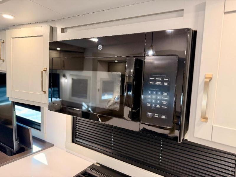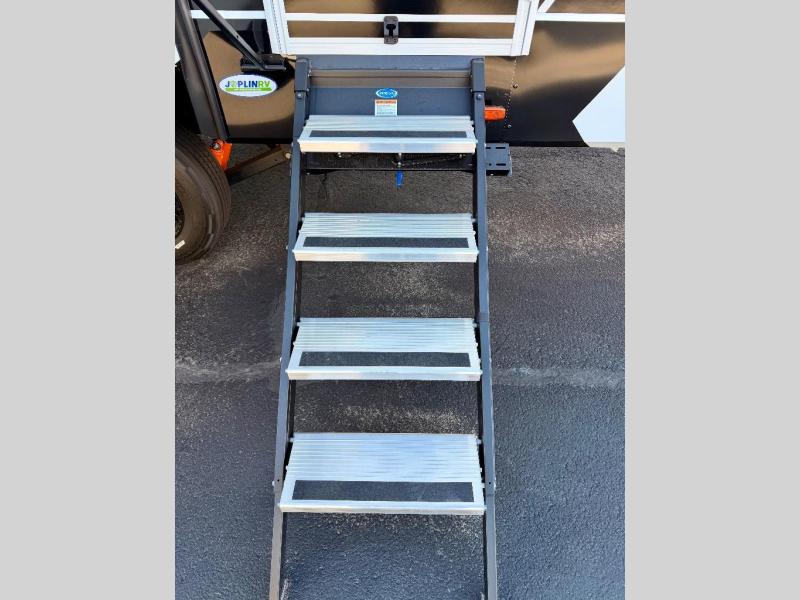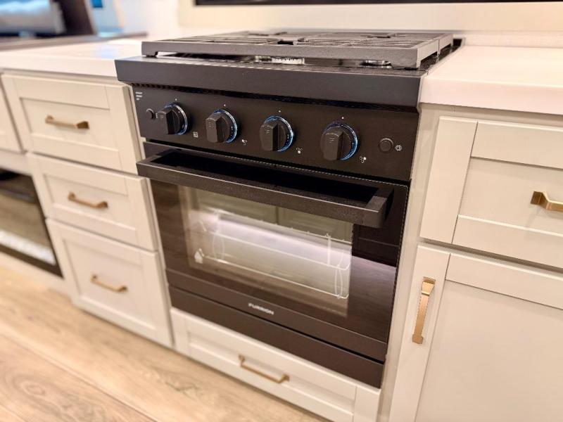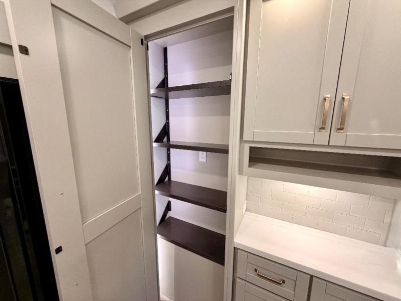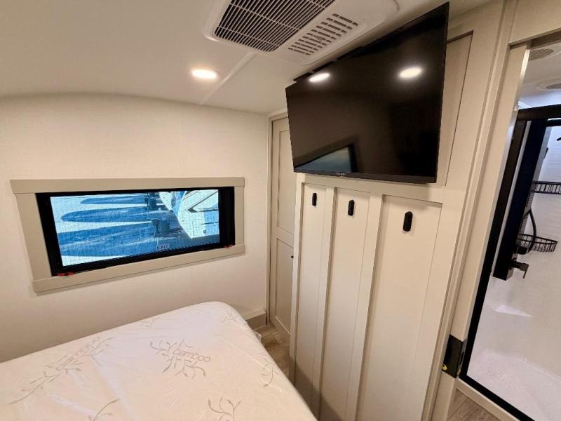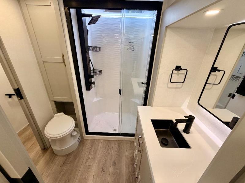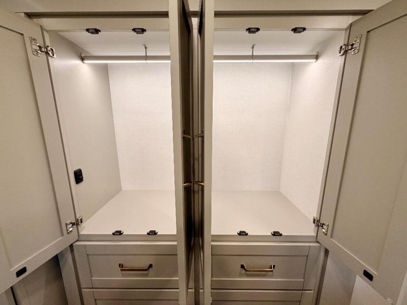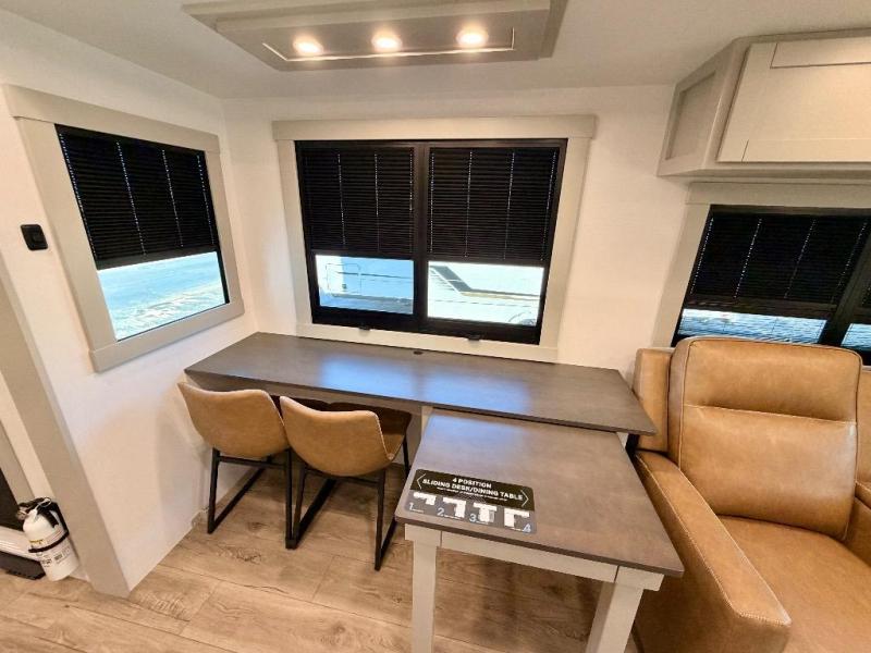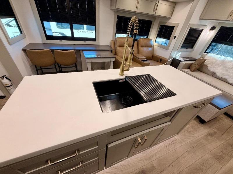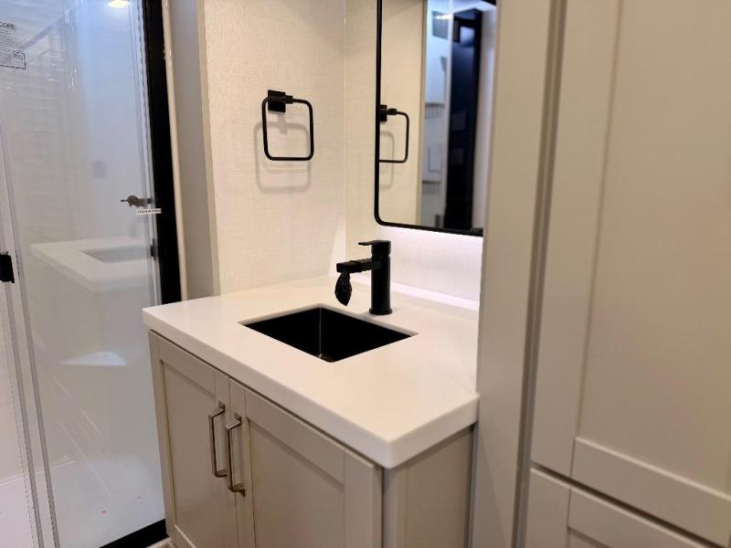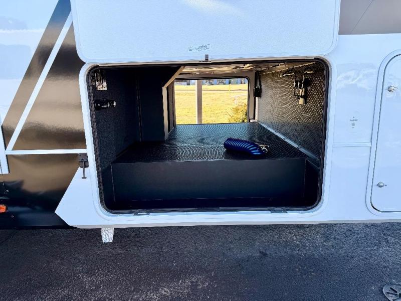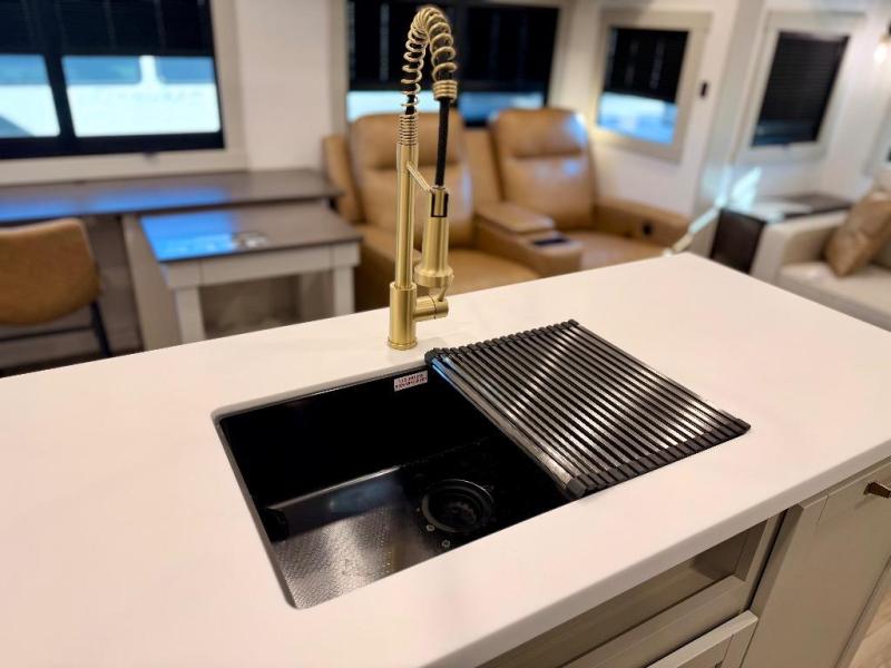 You're going to love every minute spent in this spacious fifth wheel that can sleep four. There is an inviting rear living area with a 72" tri-fold sofa and theater seating across from the televator and fireplace. The chef of your group can whip up dinner on the three burner cooktop or in the 30" residential microwave, and there is a 16 cu. ft. refrigerator that even opens when with the slide out is in. You will also enjoy the kitchen island with a farmhouse sink and roller cover, dual trash bins with a Stow N' Go paper towel holder, plus convenient dog bowls for your furry friends. You can store all your paper goods and snacks in the 84" pantry with adjustable shelving, and there is a hutch for nice dishes plus shoe storage in this model as well. Head to the front master bedroom where you'll find a queen bed with a TV, a large slide out with a wardrobe with drawers, plus a spacious bath.