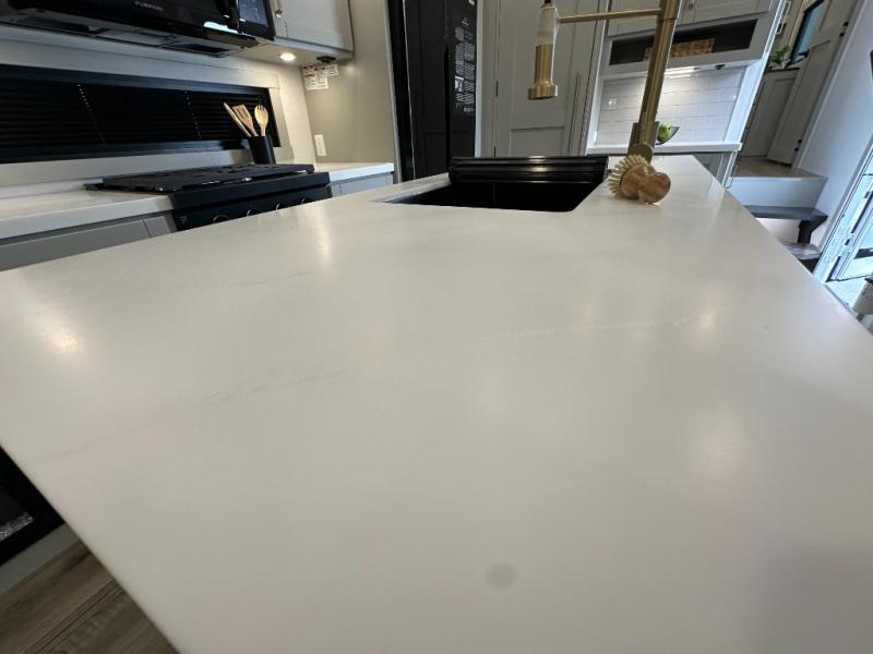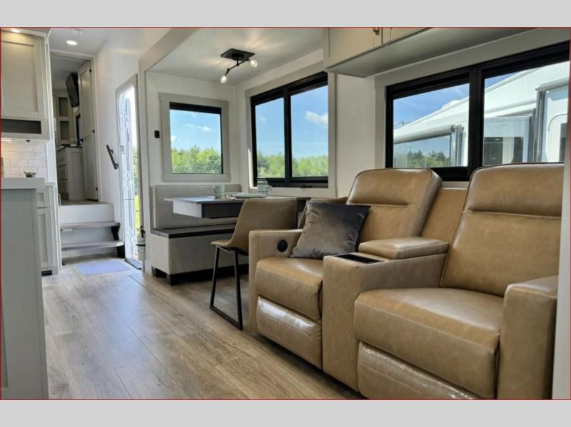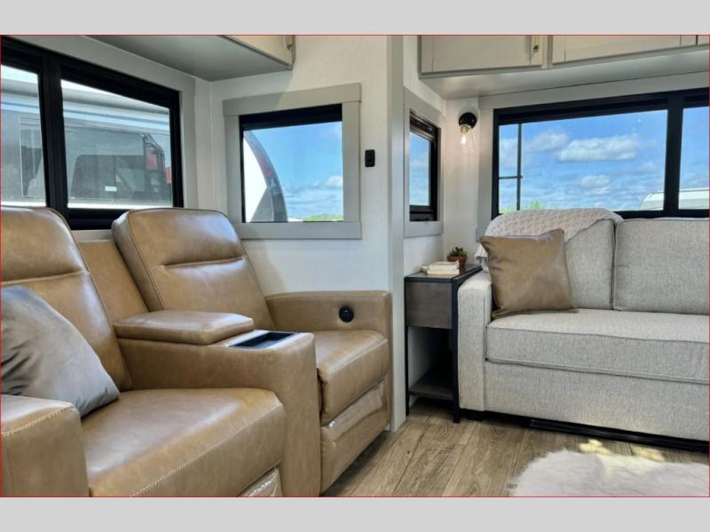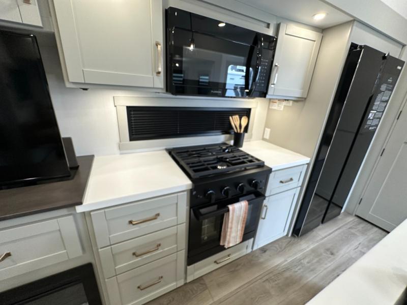 You're going to love every minute spent in this spacious fifth wheel that can sleep four. There is an inviting rear living area with a 72" tri-fold sofa and theater seating across from the televator and fireplace. The chef of your group can whip up dinner on the three burner cooktop or in the 30" residential microwave, and there is a 16 cu. ft. refrigerator that even opens when with the slide out is in. You will also enjoy the kitchen island with a farmhouse sink and roller cover, dual trash bins with a Stow N' Go paper towel holder, plus convenient dog bowls for your furry friends. You can store all your paper goods and snacks in the 84" pantry with adjustable shelving, and there is a hutch for nice dishes plus shoe storage in this model as well. Head to the front master bedroom where you'll find a queen bed with a TV, a large slide out with a wardrobe with drawers, plus a spacious bath.