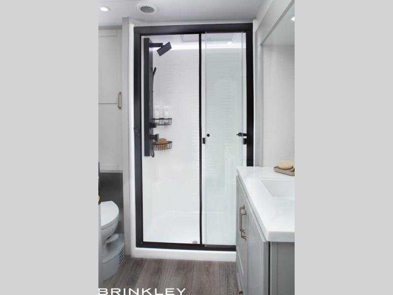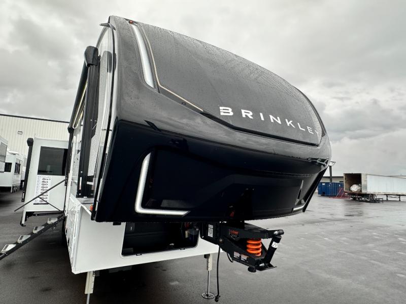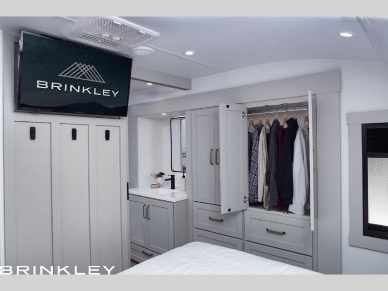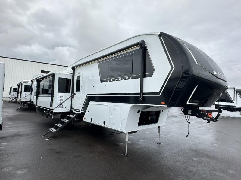 The Brinkley mid-profile Model Z fifth wheels bring you clean lines and an upscale look with plenty of style and exciting new features like the industry first brass plumbing connections. These units also feature an automotive grade front cap, plenty of exterior storage, dual exterior hot and cold showers, and wide stance leveling jacks for easy set up. Residential frameless windows provide a clean look and beautiful views, and ample electrical outlets and USB/USB-C outlets allow all of your electronics and appliances to easily be used and charged.