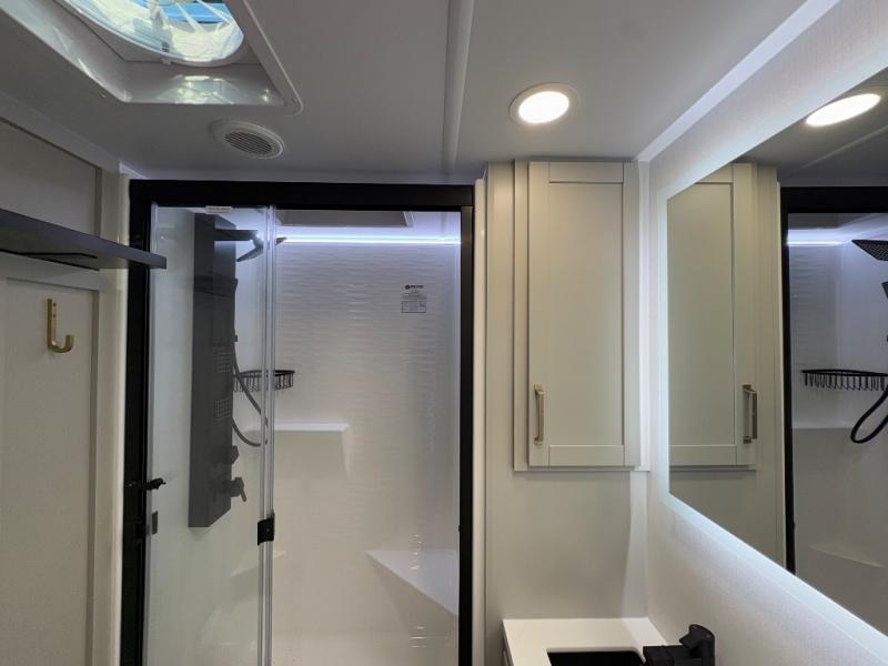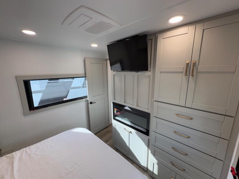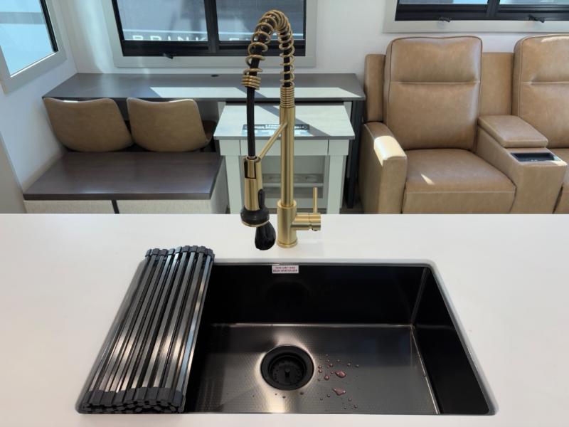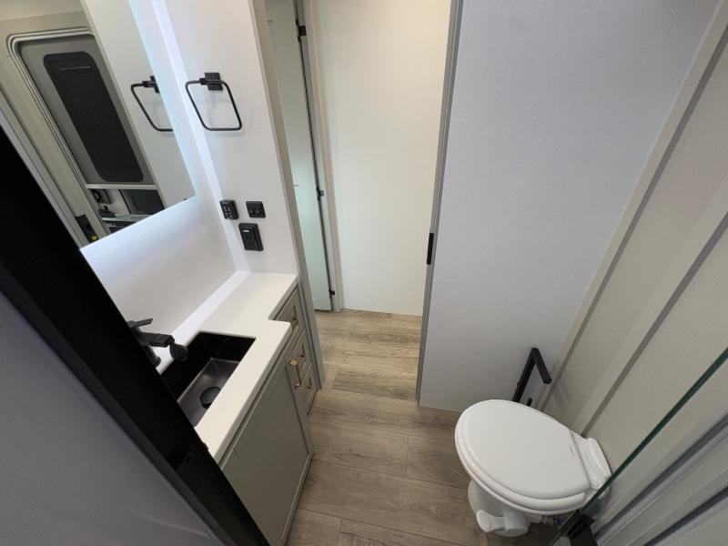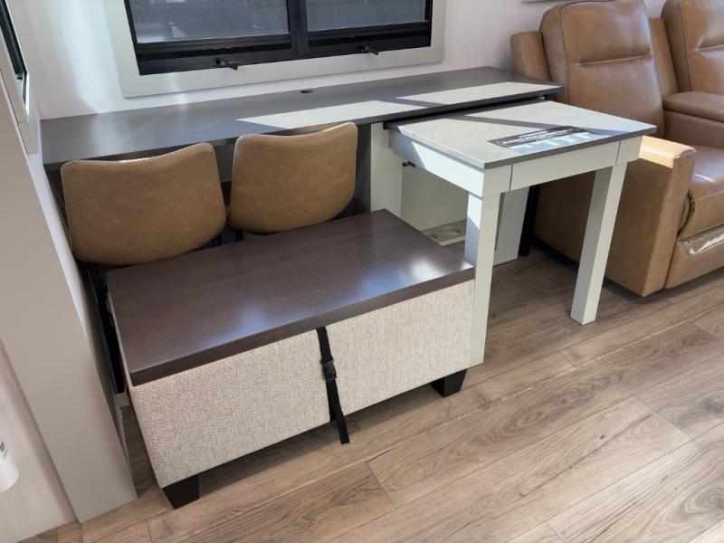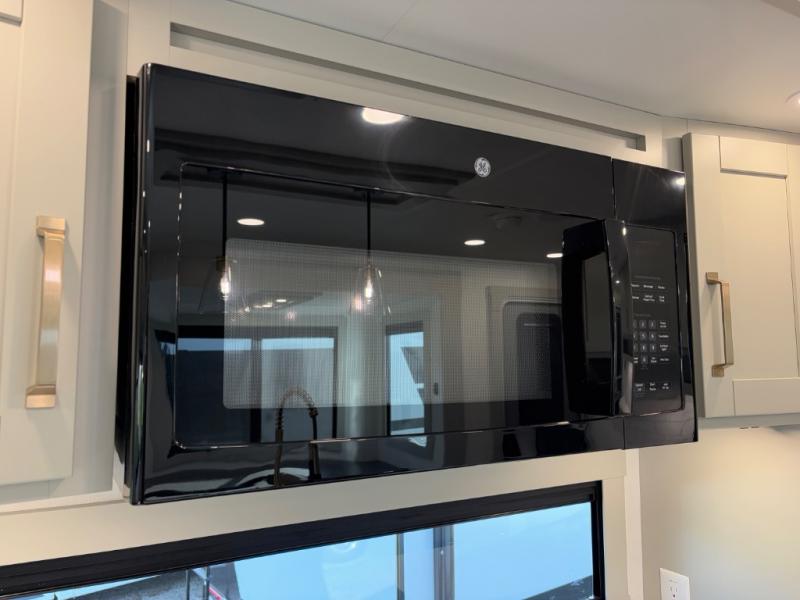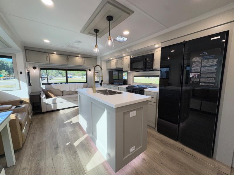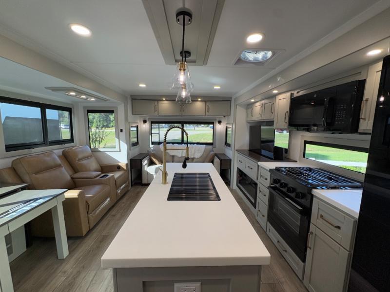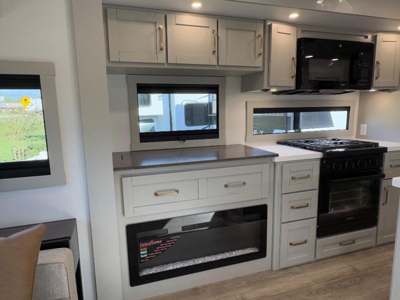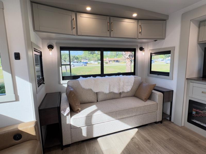 This travel trailer is spacious thanks to the dual opposing slides in the combined kitchen and living area. There is a rear 72" tri-fold sofa here, theater seating, and a sliding desk/dining table. The televator and fireplace will let you relax each evening with a movie or good book, and the full kitchen lets you make meals wherever you go. The chef of your group will also appreciate the pantry with adjustable shelving for all their ingredients, a hutch, 30" residential microwave, and even a pull-out trash bin for easy clean-up. When you're ready to call it a night, the front private bedroom will be waiting for you. This room includes a queen bed with four underbed drawers, a closet with pass-thru access to the bathroom closet, plus washer and dryer prep if you want the option to go full-time!