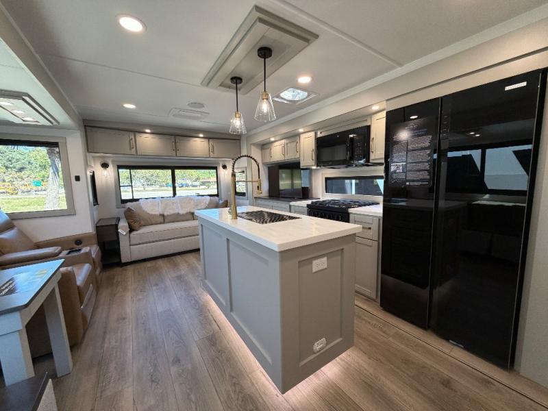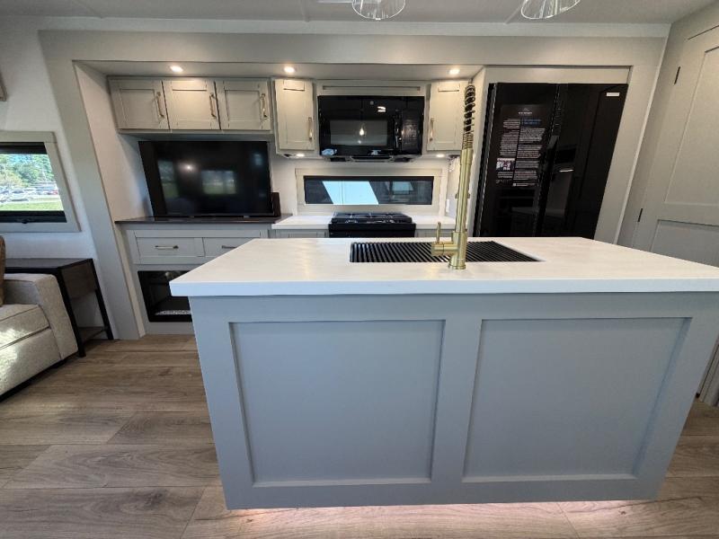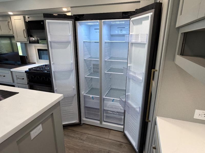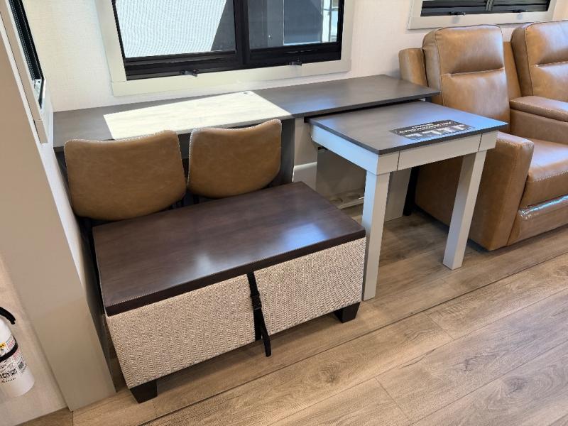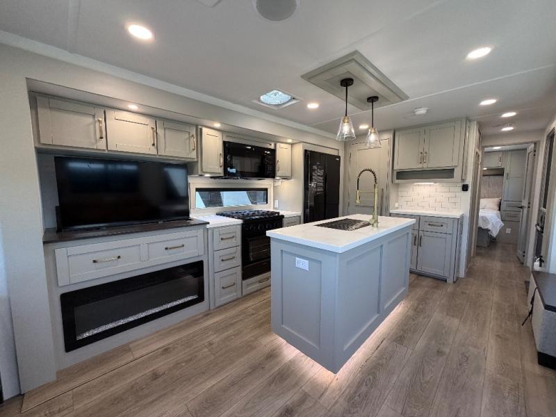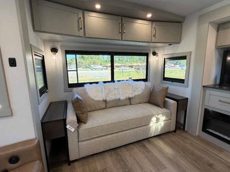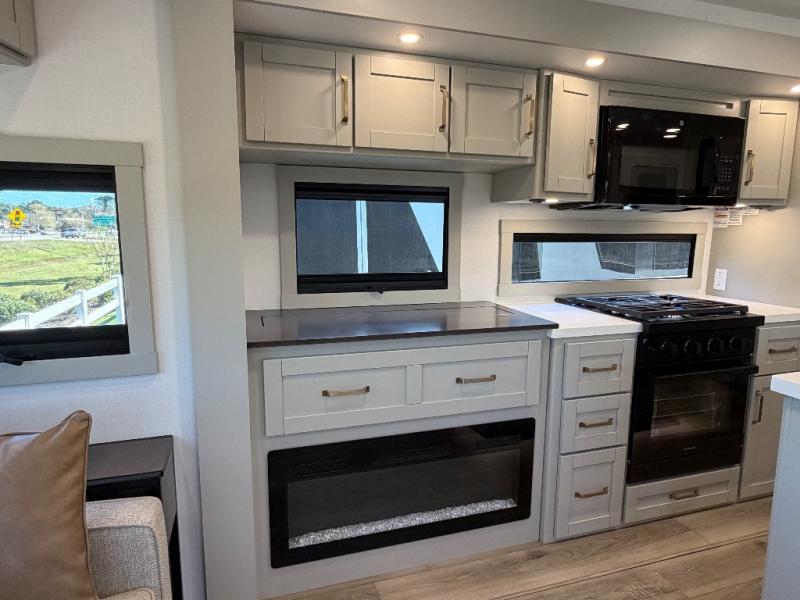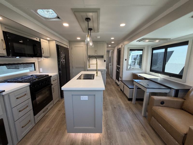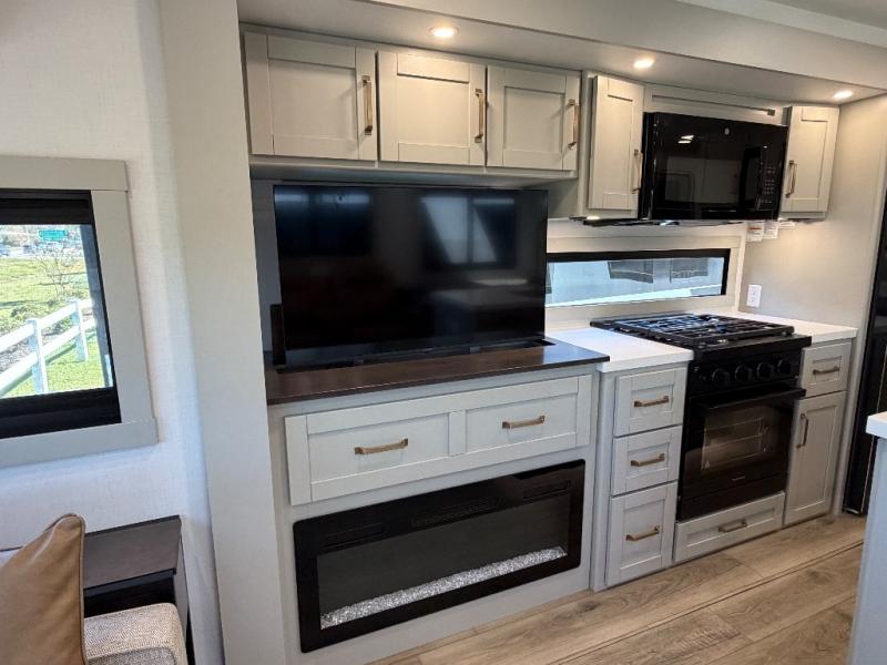 This travel trailer is spacious thanks to the dual opposing slides in the combined kitchen and living area. There is a rear 72" tri-fold sofa here, theater seating, and a sliding desk/dining table. The televator and fireplace will let you relax each evening with a movie or good book, and the full kitchen lets you make meals wherever you go. The chef of your group will also appreciate the pantry with adjustable shelving for all their ingredients, a hutch, 30" residential microwave, and even a pull-out trash bin for easy clean-up. When you're ready to call it a night, the front private bedroom will be waiting for you. This room includes a queen bed with four underbed drawers, a closet with pass-thru access to the bathroom closet, plus washer and dryer prep if you want the option to go full-time!