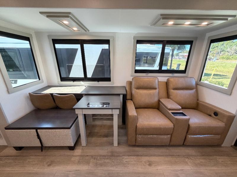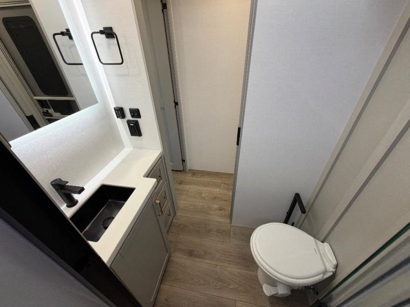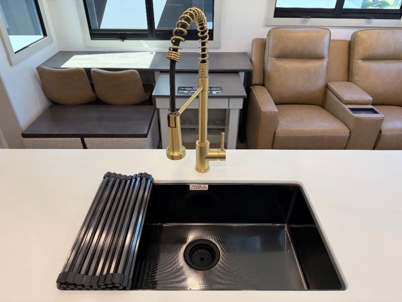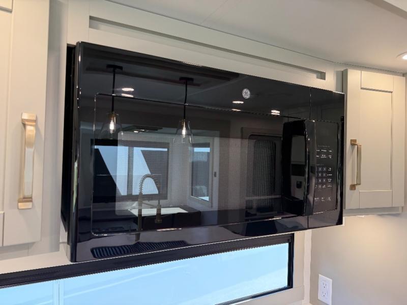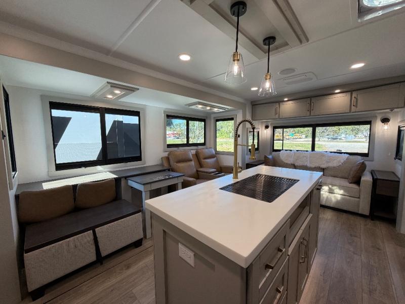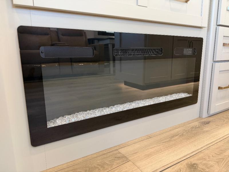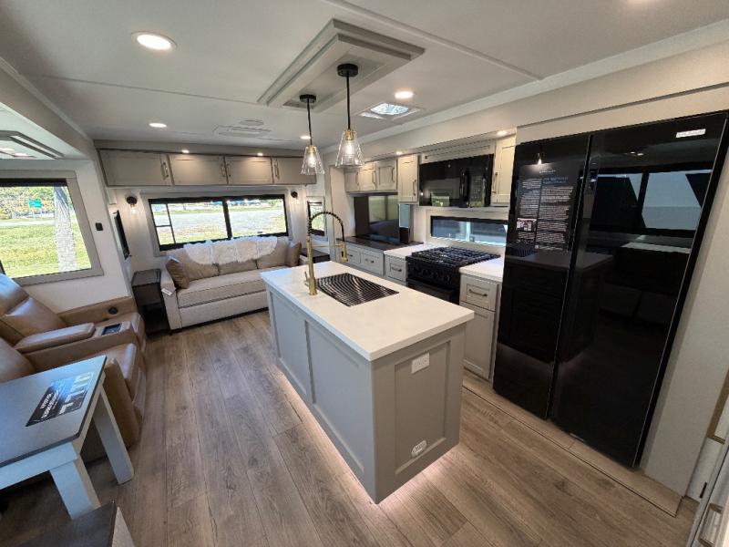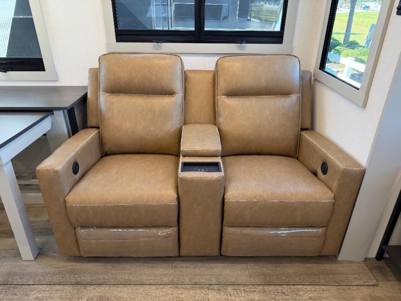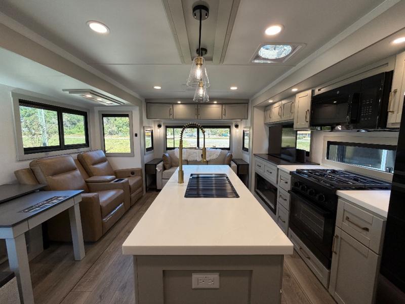 This travel trailer is spacious thanks to the dual opposing slides in the combined kitchen and living area. There is a rear 72" tri-fold sofa here, theater seating, and a sliding desk/dining table. The televator and fireplace will let you relax each evening with a movie or good book, and the full kitchen lets you make meals wherever you go. The chef of your group will also appreciate the pantry with adjustable shelving for all their ingredients, a hutch, 30" residential microwave, and even a pull-out trash bin for easy clean-up. When you're ready to call it a night, the front private bedroom will be waiting for you. This room includes a queen bed with four underbed drawers, a closet with pass-thru access to the bathroom closet, plus washer and dryer prep if you want the option to go full-time!