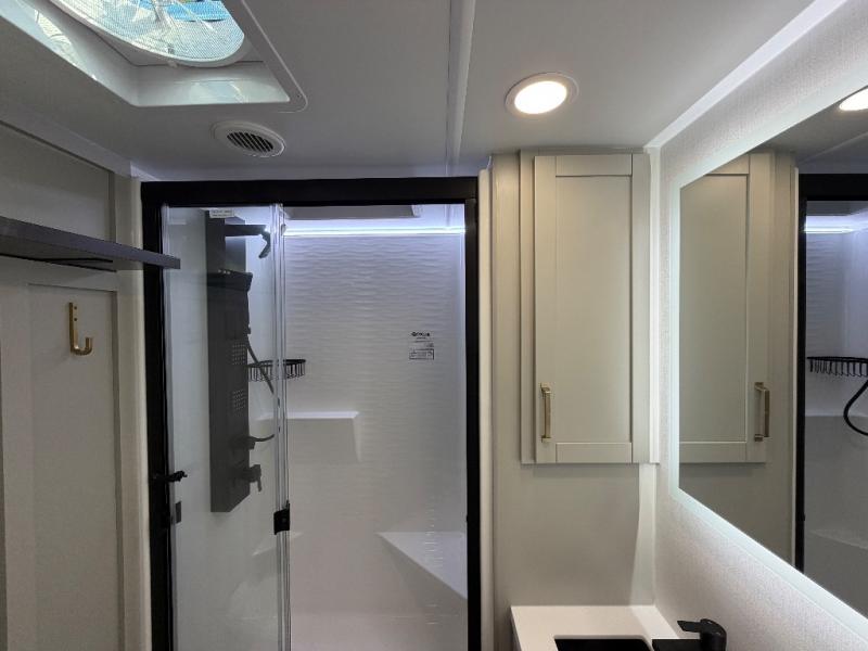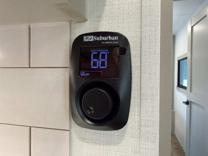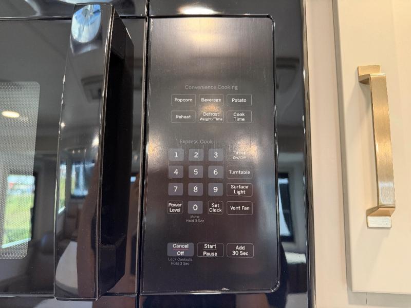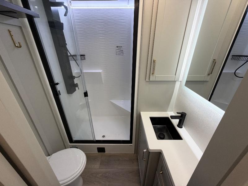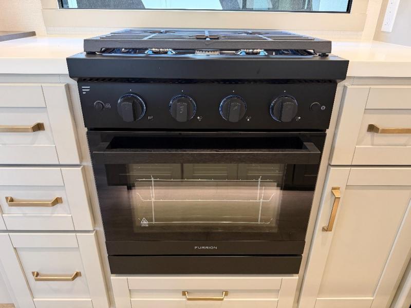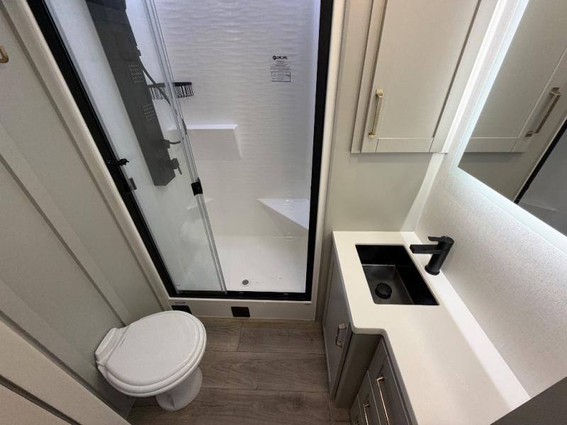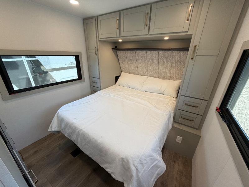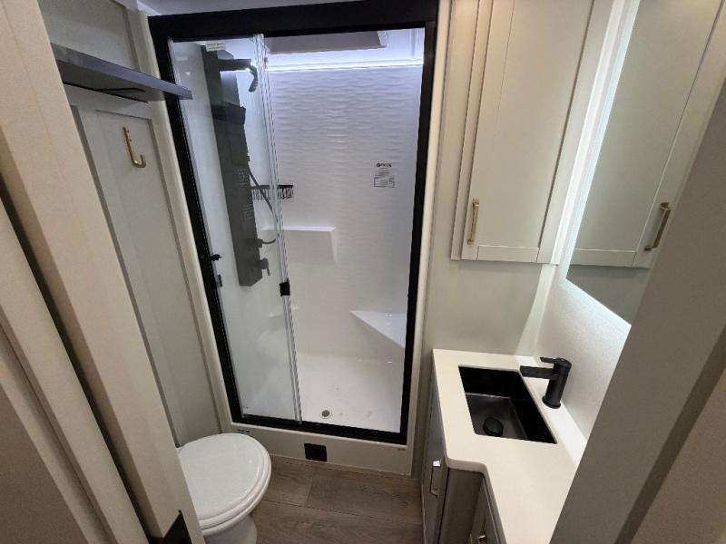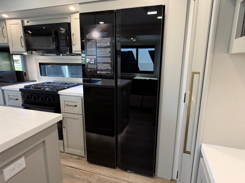 This travel trailer is spacious thanks to the dual opposing slides in the combined kitchen and living area. There is a rear 72" tri-fold sofa here, theater seating, and a sliding desk/dining table. The televator and fireplace will let you relax each evening with a movie or good book, and the full kitchen lets you make meals wherever you go. The chef of your group will also appreciate the pantry with adjustable shelving for all their ingredients, a hutch, 30" residential microwave, and even a pull-out trash bin for easy clean-up. When you're ready to call it a night, the front private bedroom will be waiting for you. This room includes a queen bed with four underbed drawers, a closet with pass-thru access to the bathroom closet, plus washer and dryer prep if you want the option to go full-time!