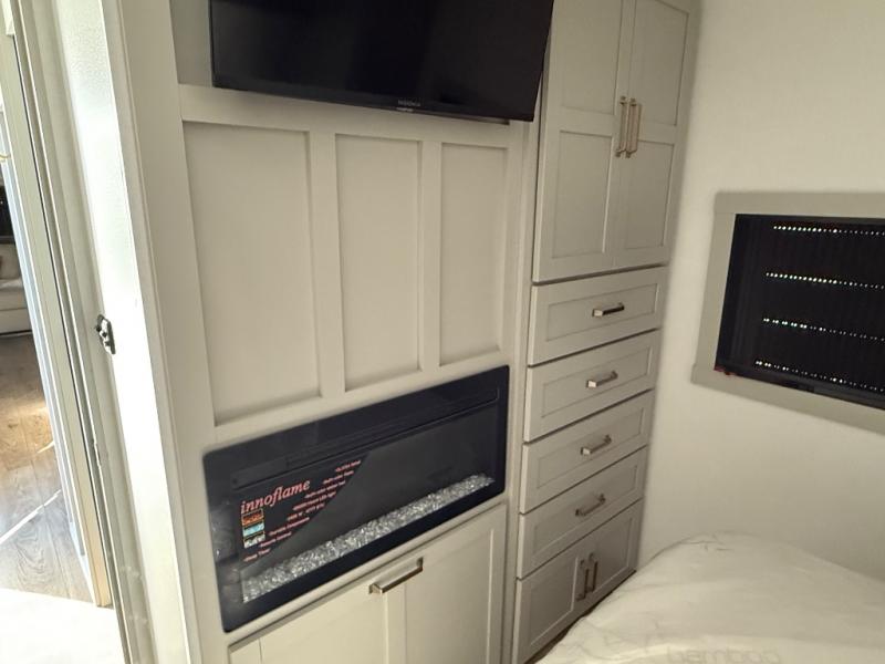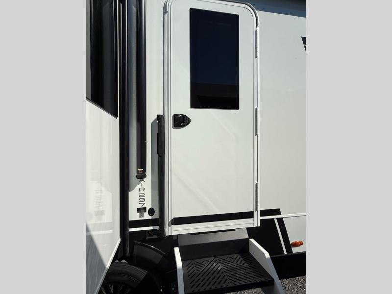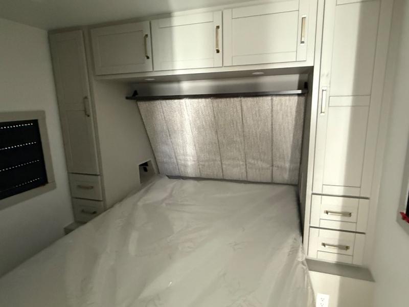 This travel trailer is spacious thanks to the dual opposing slides in the combined kitchen and living area. There is a rear 72" tri-fold sofa here, theater seating, and a sliding desk/dining table. The televator and fireplace will let you relax each evening with a movie or good book, and the full kitchen lets you make meals wherever you go. The chef of your group will also appreciate the pantry with adjustable shelving for all their ingredients, a hutch, 30" residential microwave, and even a pull-out trash bin for easy clean-up. When you're ready to call it a night, the front private bedroom will be waiting for you. This room includes a queen bed with four underbed drawers, a closet with pass-thru access to the bathroom closet, plus washer and dryer prep if you want the option to go full-time!