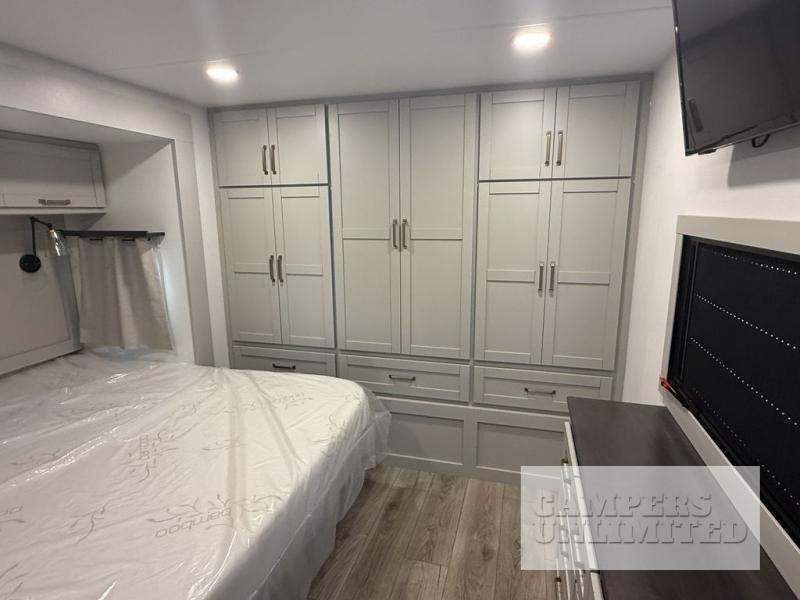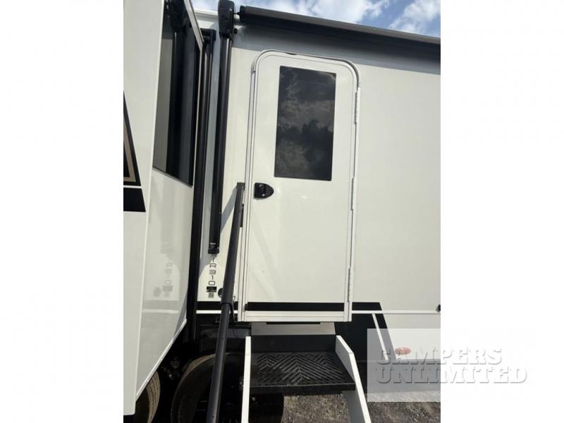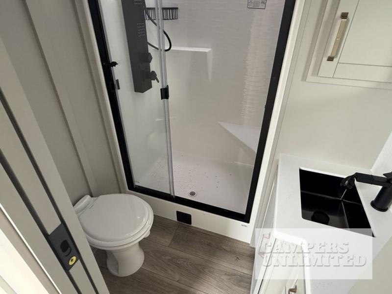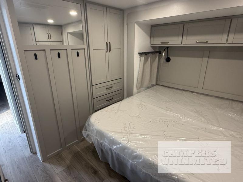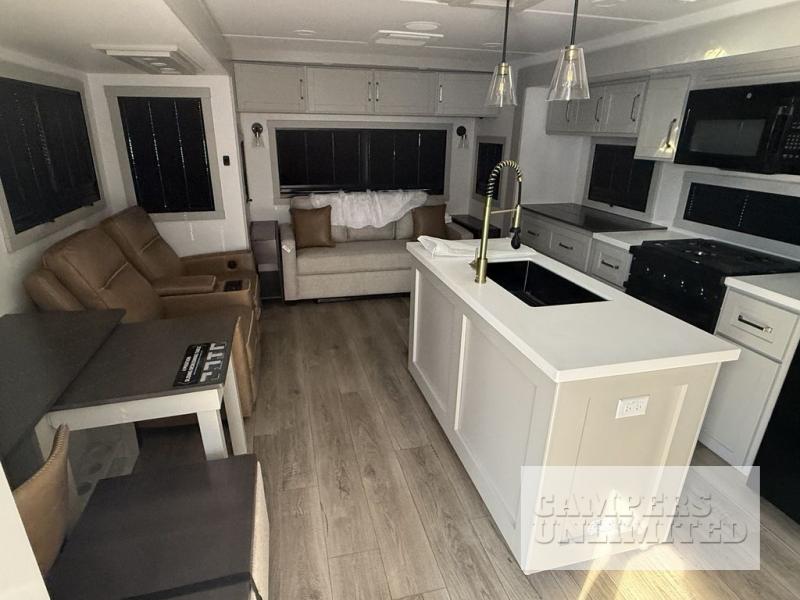 You will love all the space and features in this travel trailer! A luxurious rear living room offers plenty of room to spread out, with a 72" tri-fold sofa plus theater seats, all arranged with a perfect view of the 42" TV over the fireplace. A central kitchen area includes an island with hidden pet bowls. Find even more storage with the hutch plus pantry with adjustable shelves. The front bedroom comes with a queen bed, but if you'd like you can upgrade to a king for even more room. No matter which you choose, you will enjoy watching the 32" bedroom TV. The full-width wardrobe has room for all of your clothes and also includes prep for an optional washer and dryer. And the full bath includes a 30" x 42" one-piece fiberglass shower. Outside you'll enjoy two awnings, pass-through storage, and LED ground lighting.