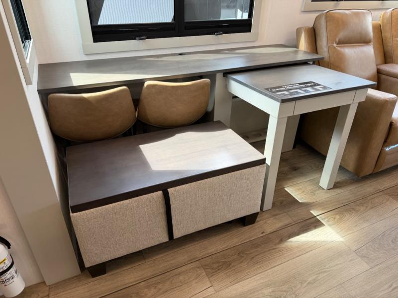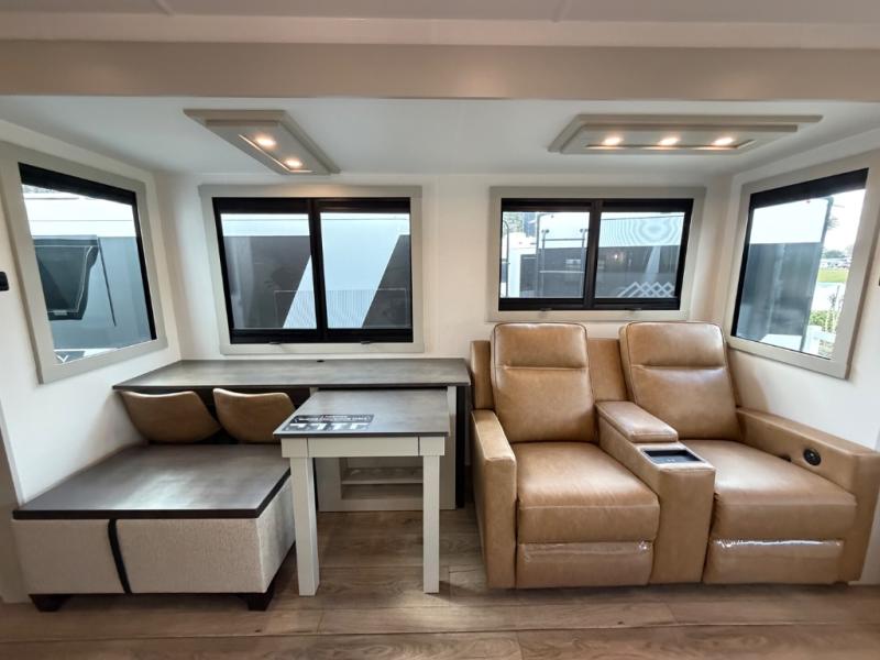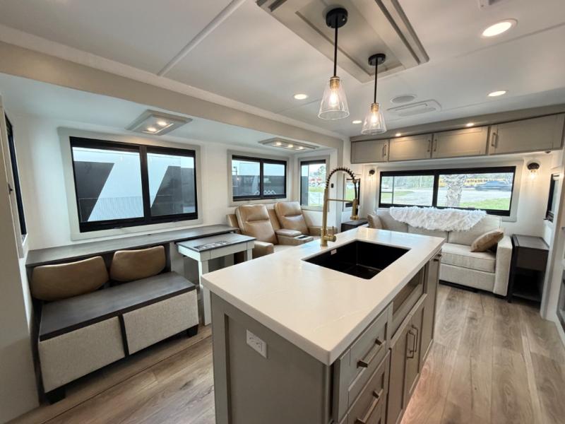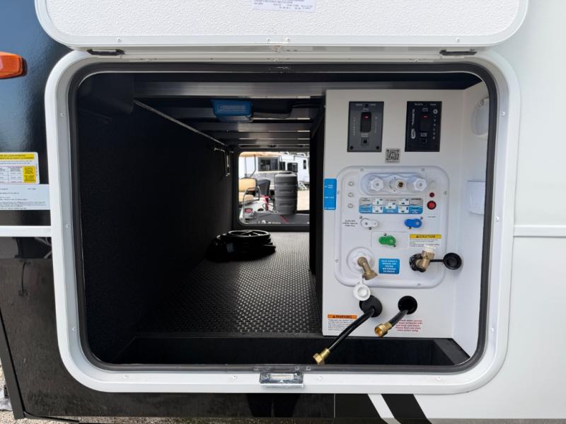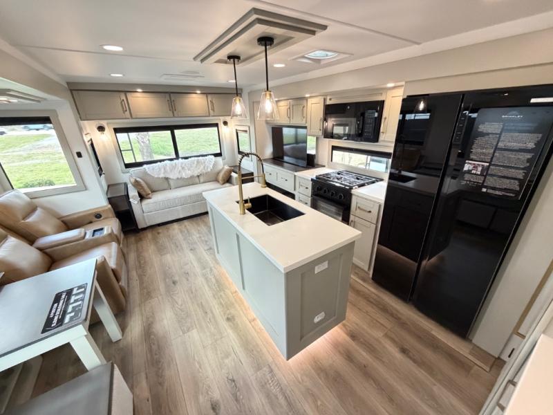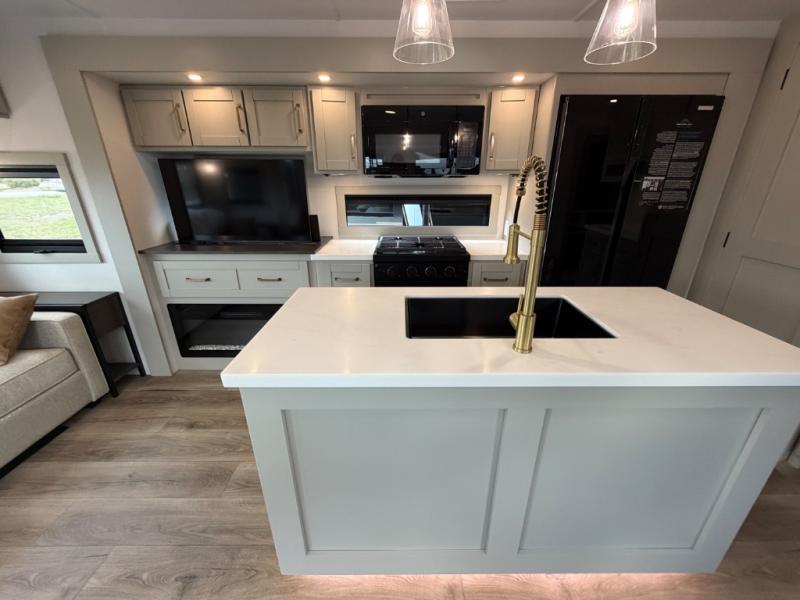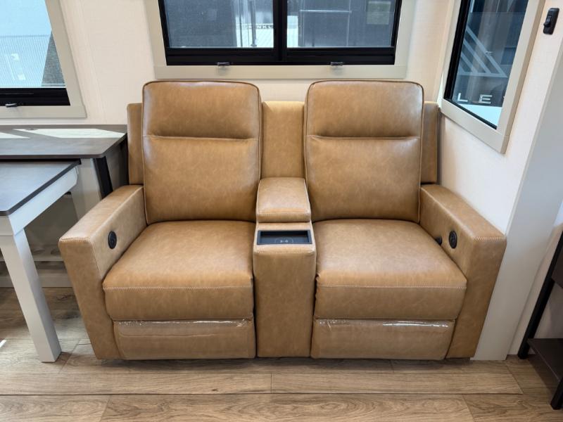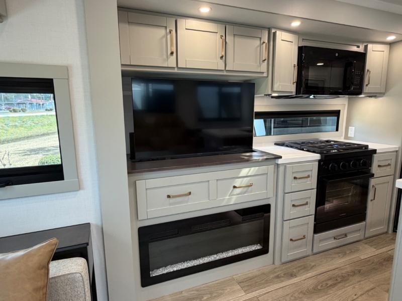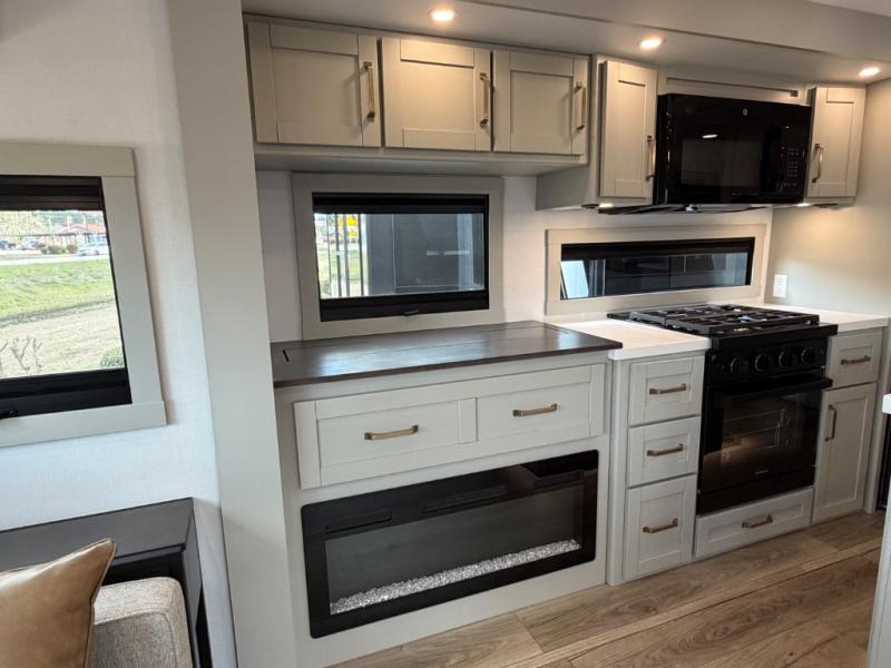 You will love all the space and features in this travel trailer! A luxurious rear living room offers plenty of room to spread out, with a 72" tri-fold sofa plus theater seats, all arranged with a perfect view of the 42" TV over the fireplace. A central kitchen area includes an island with hidden pet bowls. Find even more storage with the hutch plus pantry with adjustable shelves. The front bedroom comes with a queen bed, but if you'd like you can upgrade to a king for even more room. No matter which you choose, you will enjoy watching the 32" bedroom TV. The full-width wardrobe has room for all of your clothes and also includes prep for an optional washer and dryer. And the full bath includes a 30" x 42" one-piece fiberglass shower. Outside you'll enjoy two awnings, pass-through storage, and LED ground lighting.