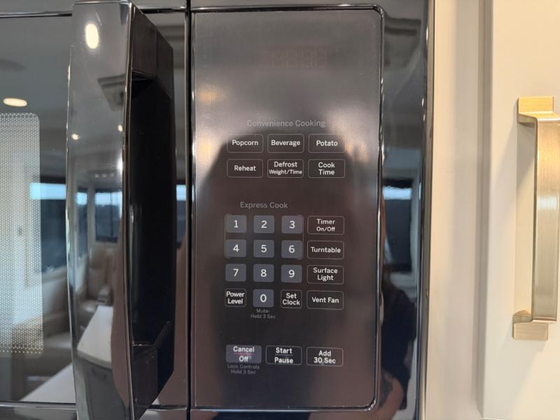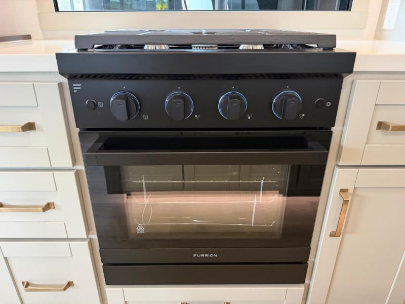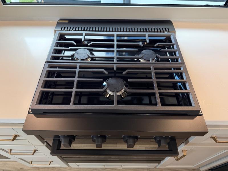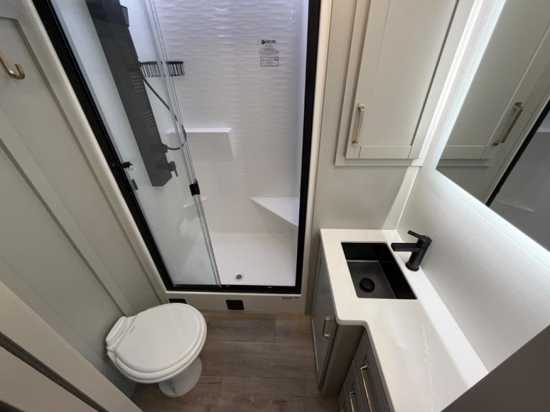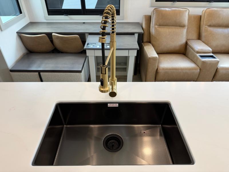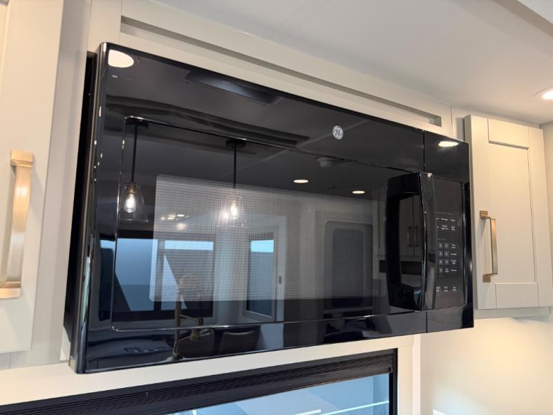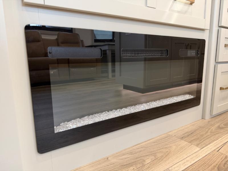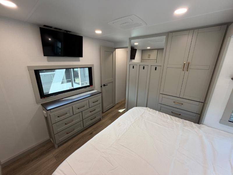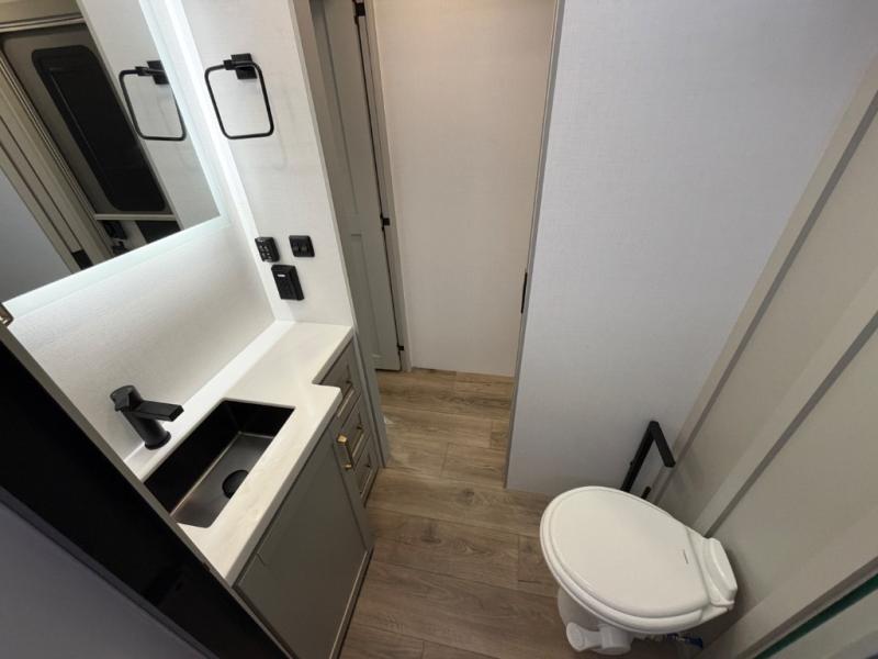 You will love all the space and features in this travel trailer! A luxurious rear living room offers plenty of room to spread out, with a 72" tri-fold sofa plus theater seats, all arranged with a perfect view of the 42" TV over the fireplace. A central kitchen area includes an island with hidden pet bowls. Find even more storage with the hutch plus pantry with adjustable shelves. The front bedroom comes with a queen bed, but if you'd like you can upgrade to a king for even more room. No matter which you choose, you will enjoy watching the 32" bedroom TV. The full-width wardrobe has room for all of your clothes and also includes prep for an optional washer and dryer. And the full bath includes a 30" x 42" one-piece fiberglass shower. Outside you'll enjoy two awnings, pass-through storage, and LED ground lighting.